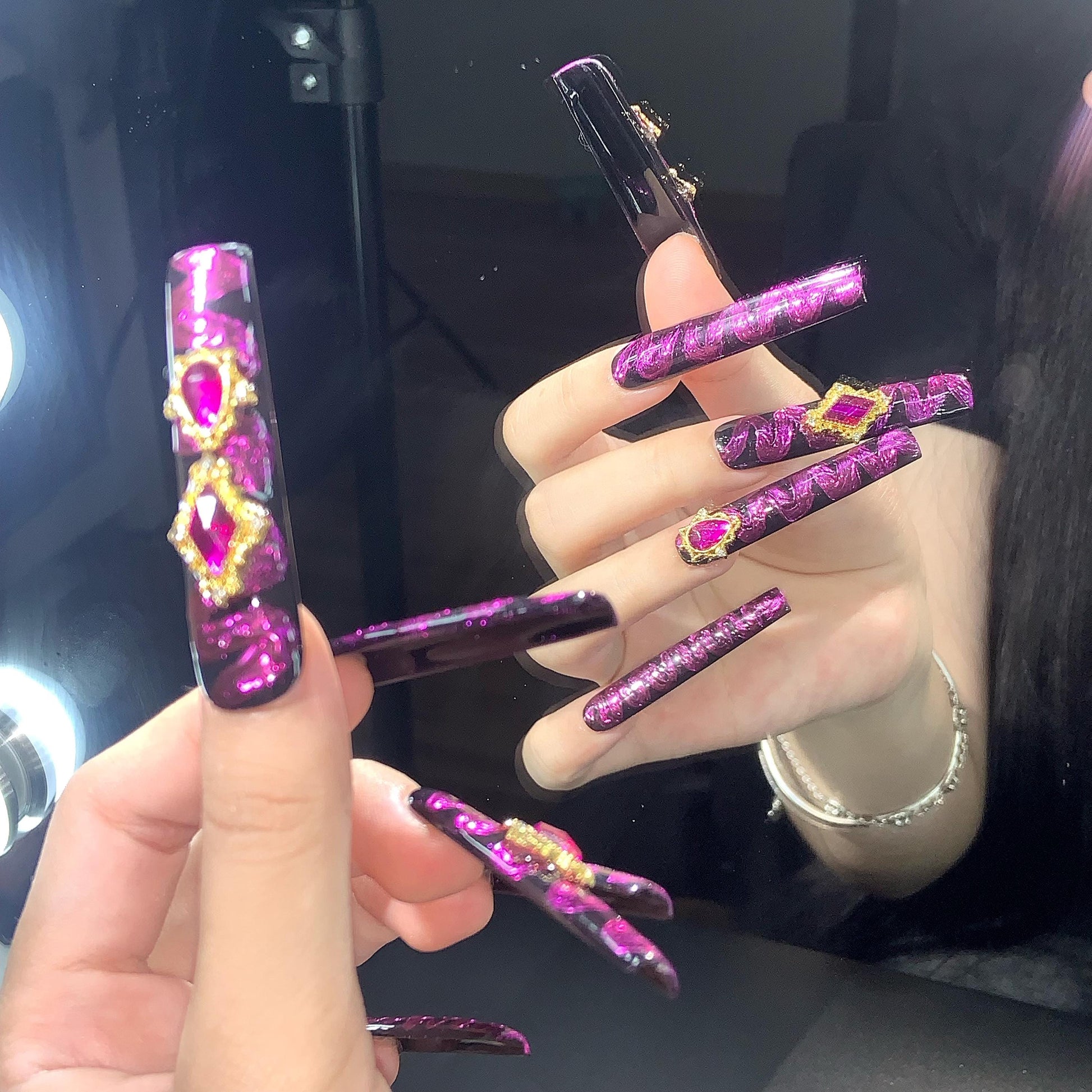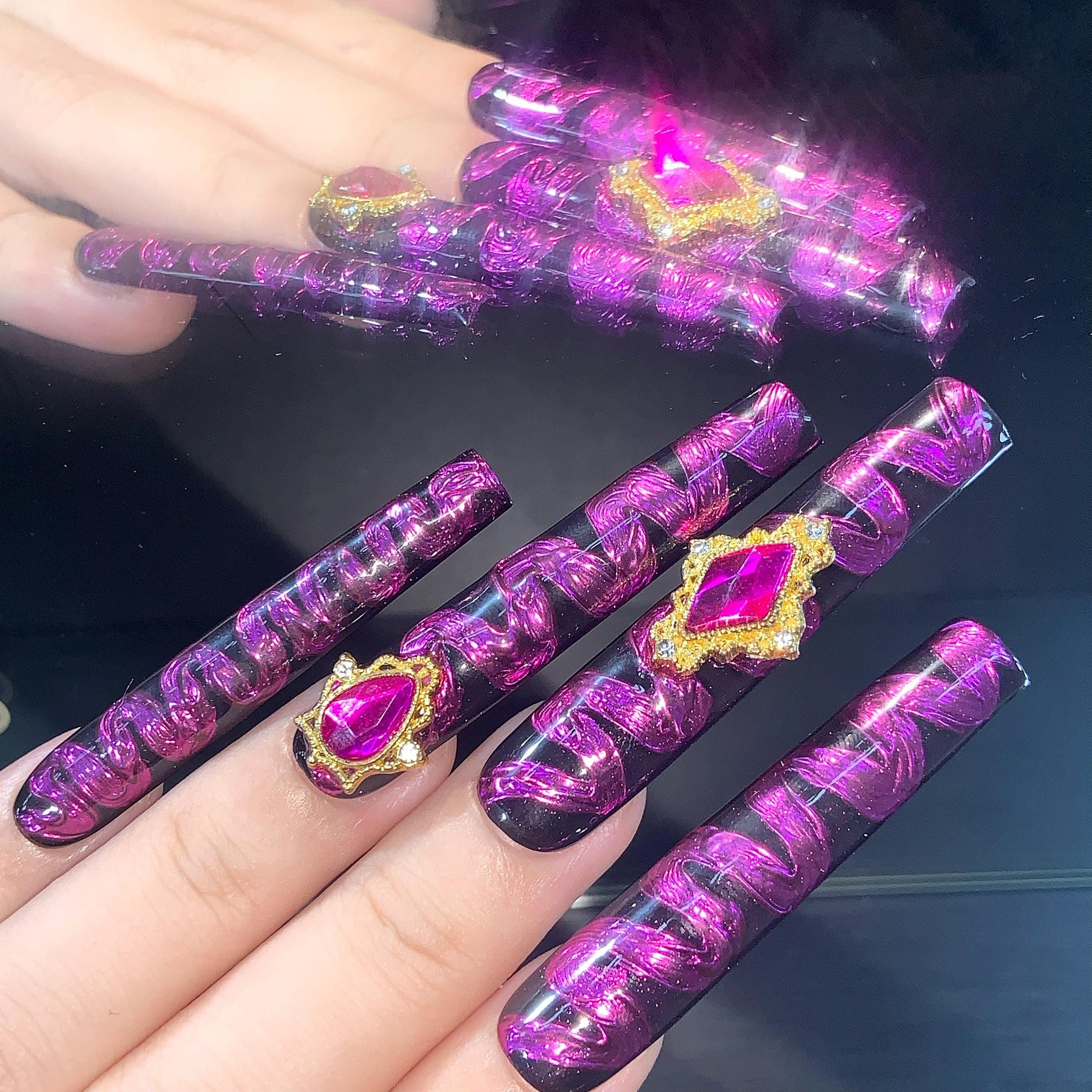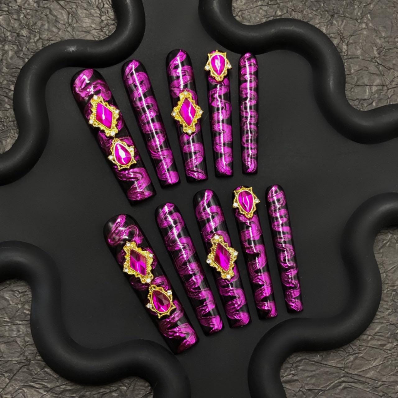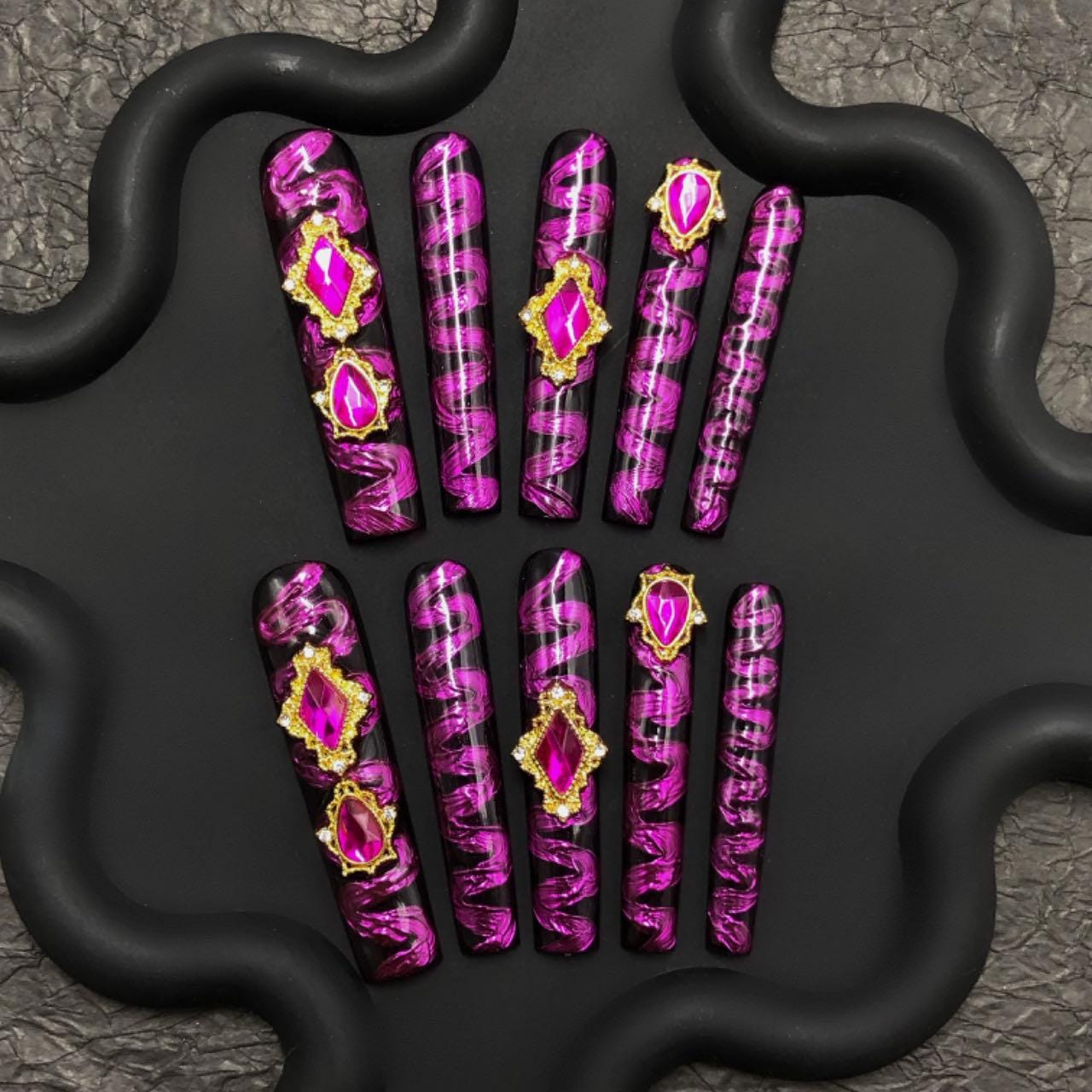 A bold and glamorous set of long coffin-shaped press-on nails with a glossy black base, overlaid with vivid metallic pink swirls in an abstract pattern. The design is elevated with large gold-framed fuchsia rhinestones and crystal accents, creating a luxurious and eye-catching effect. Perfect for a dramatic, high-fashion look.