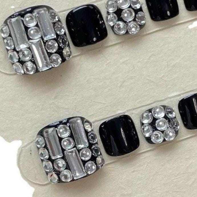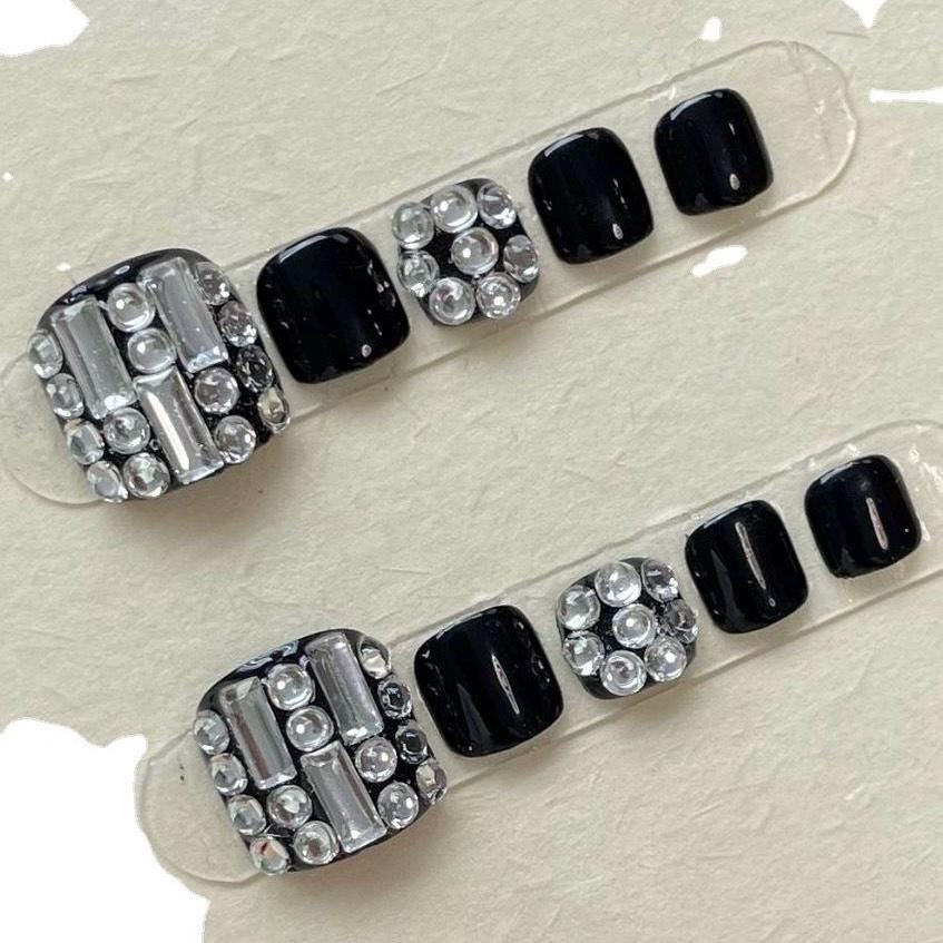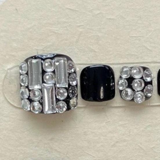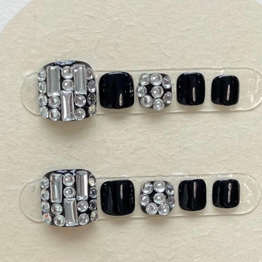 Black Rhinestone Glam Press-On Toenails – Luxury Pedicure Set. Artificial reusable fake glue on faux manicure nails trendy art.