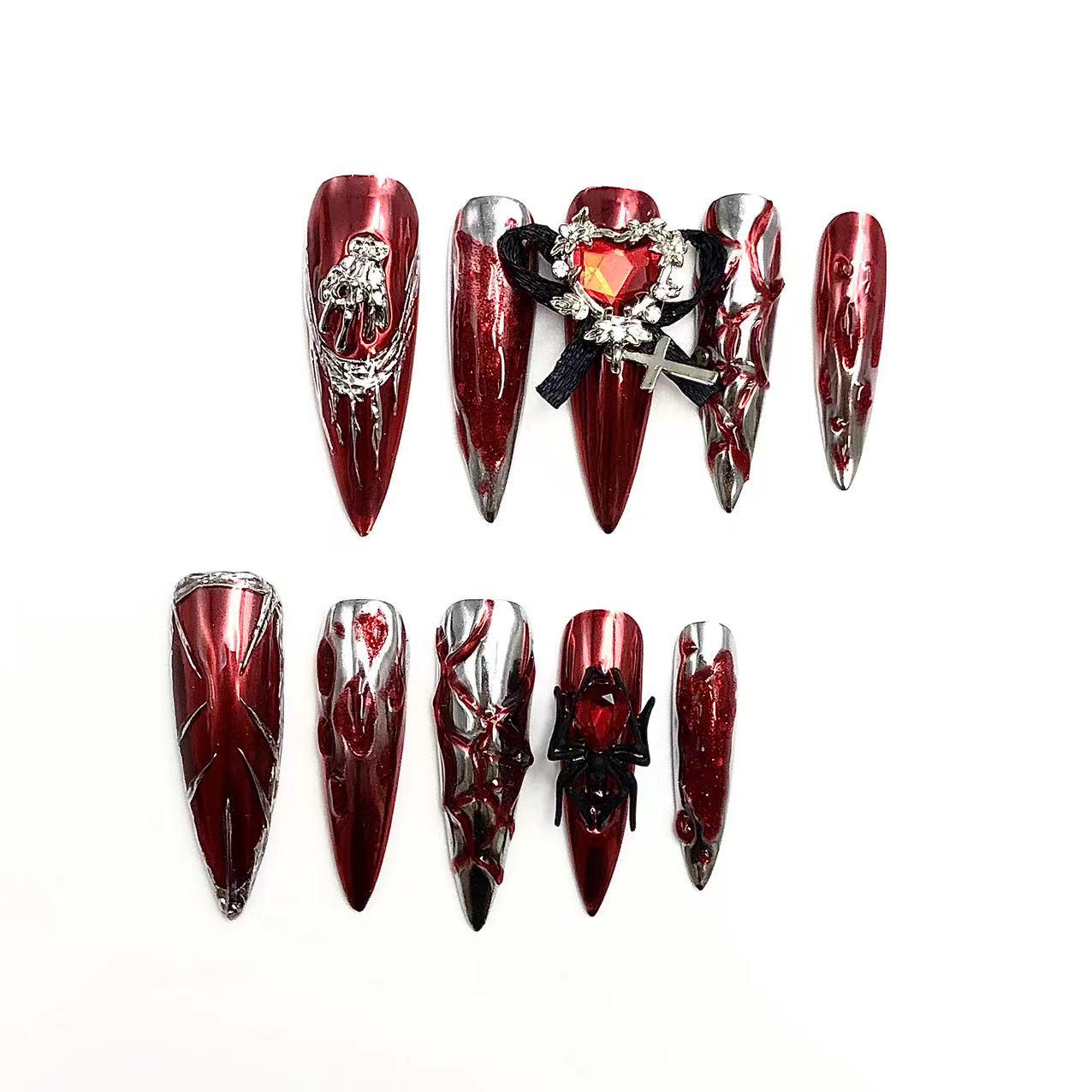Bloody Gothic Chrome Press On Nails – Vampire Heart & Spider Web Set Artificial reusable fake glue on faux manicure nails trendy art