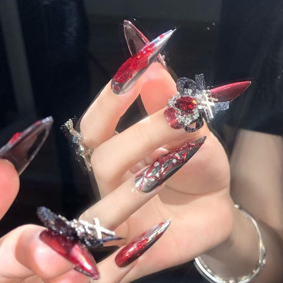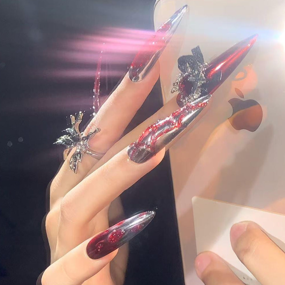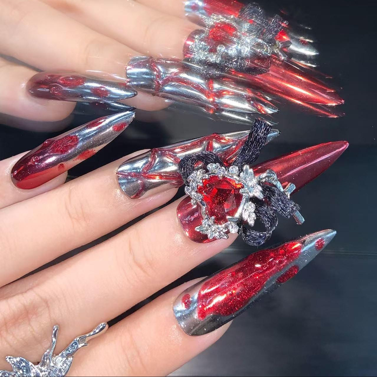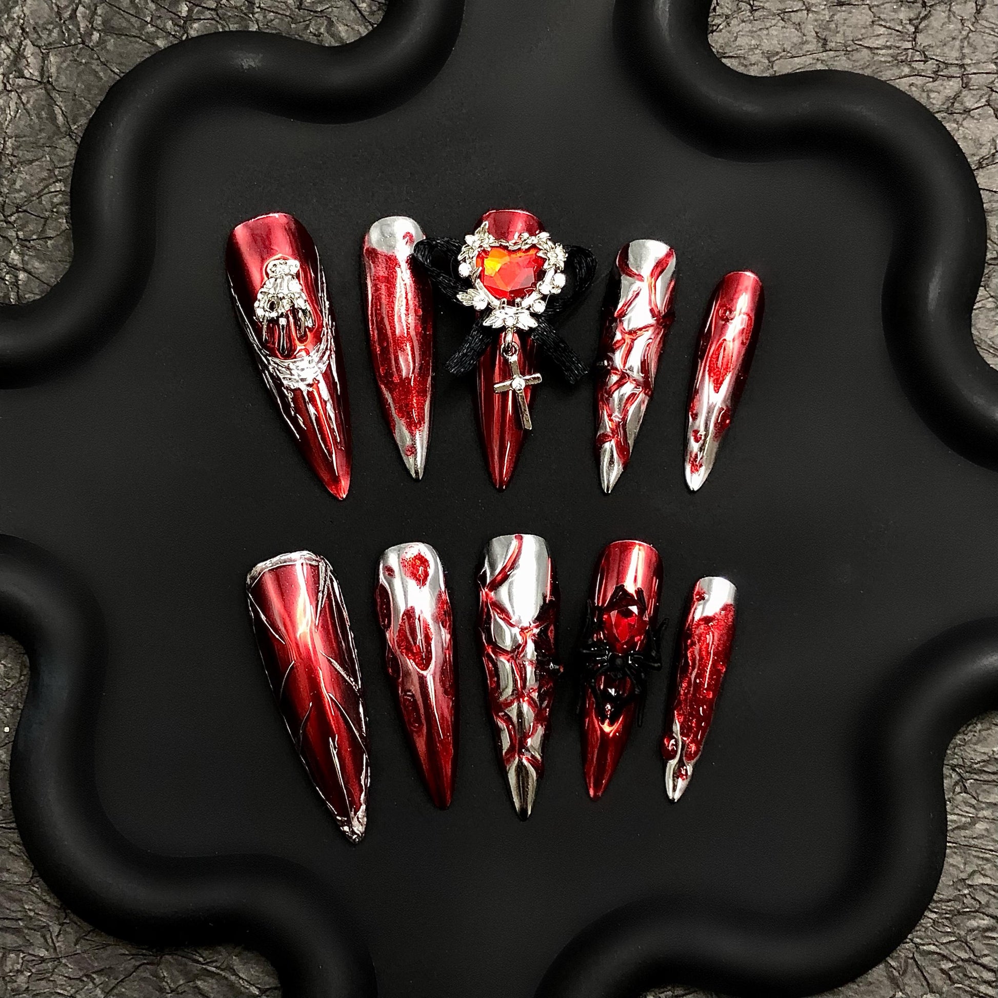 Unleash your dark side with these blood-red chrome press-on nails featuring gothic 3D details like spiders, barbed wire textures, and a statement heart charm wrapped in a cross and bow. The blend of metallic red and silver with sculpted web-like accents makes this long stiletto set perfect for gothic glam, Halloween, or vampirecore looks.