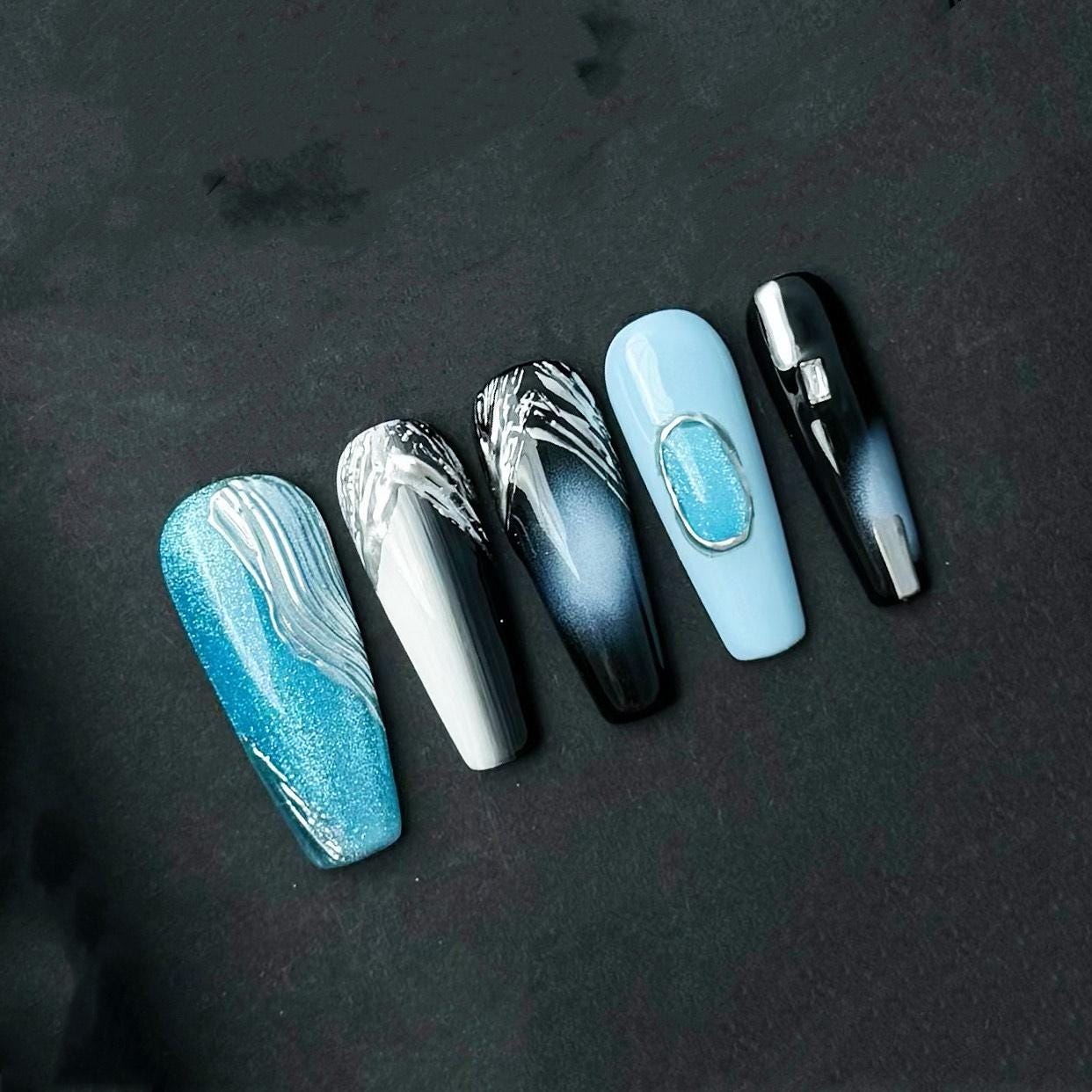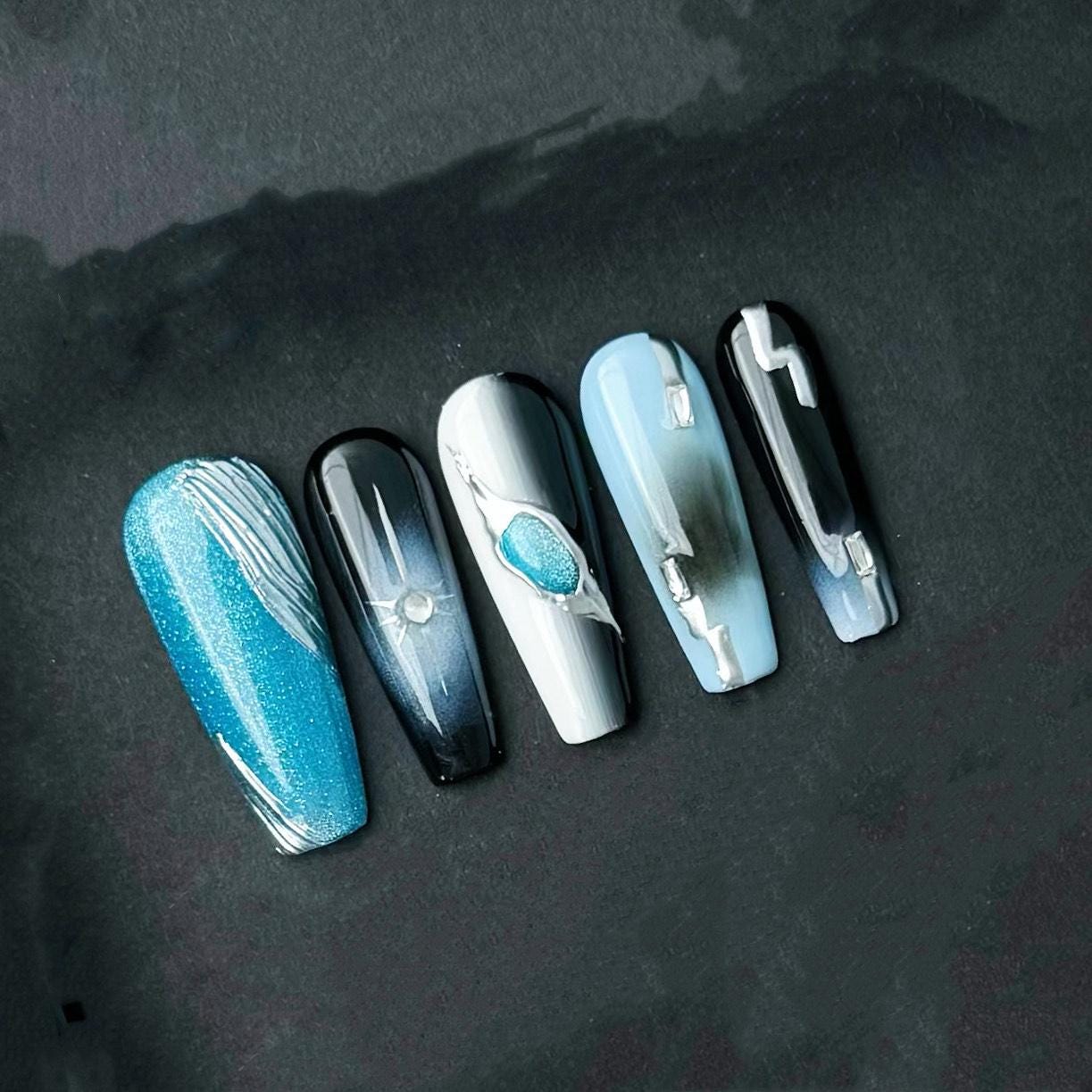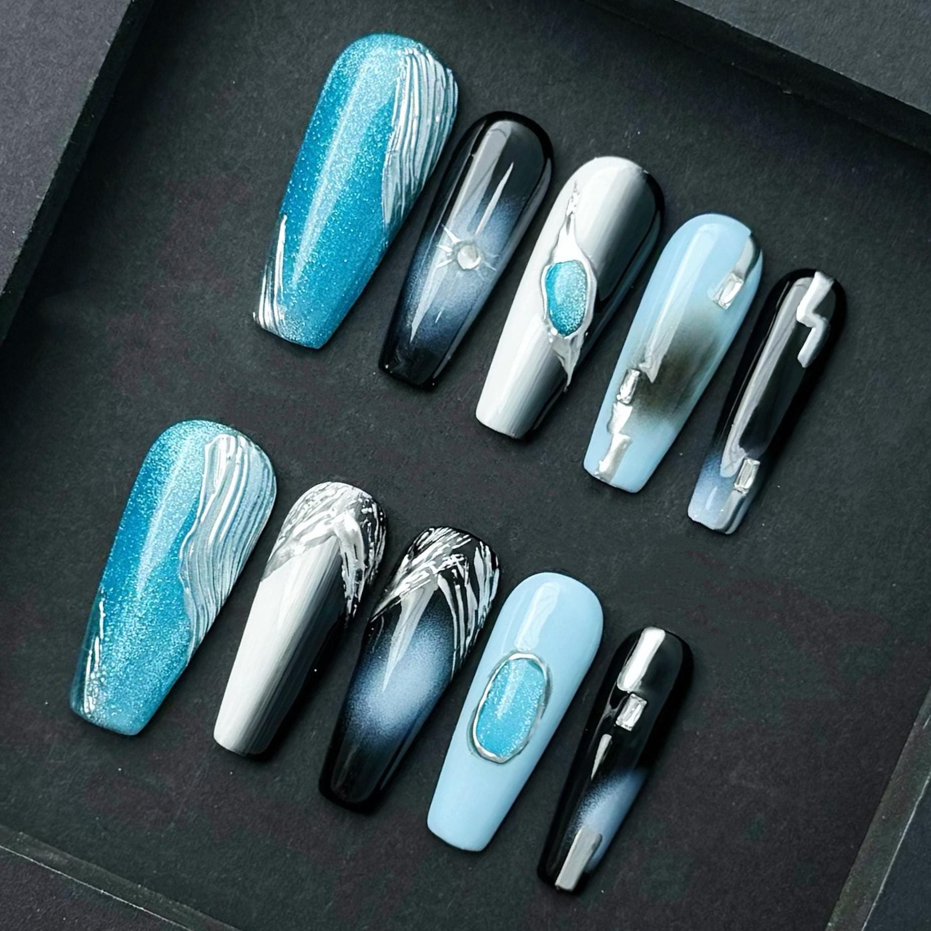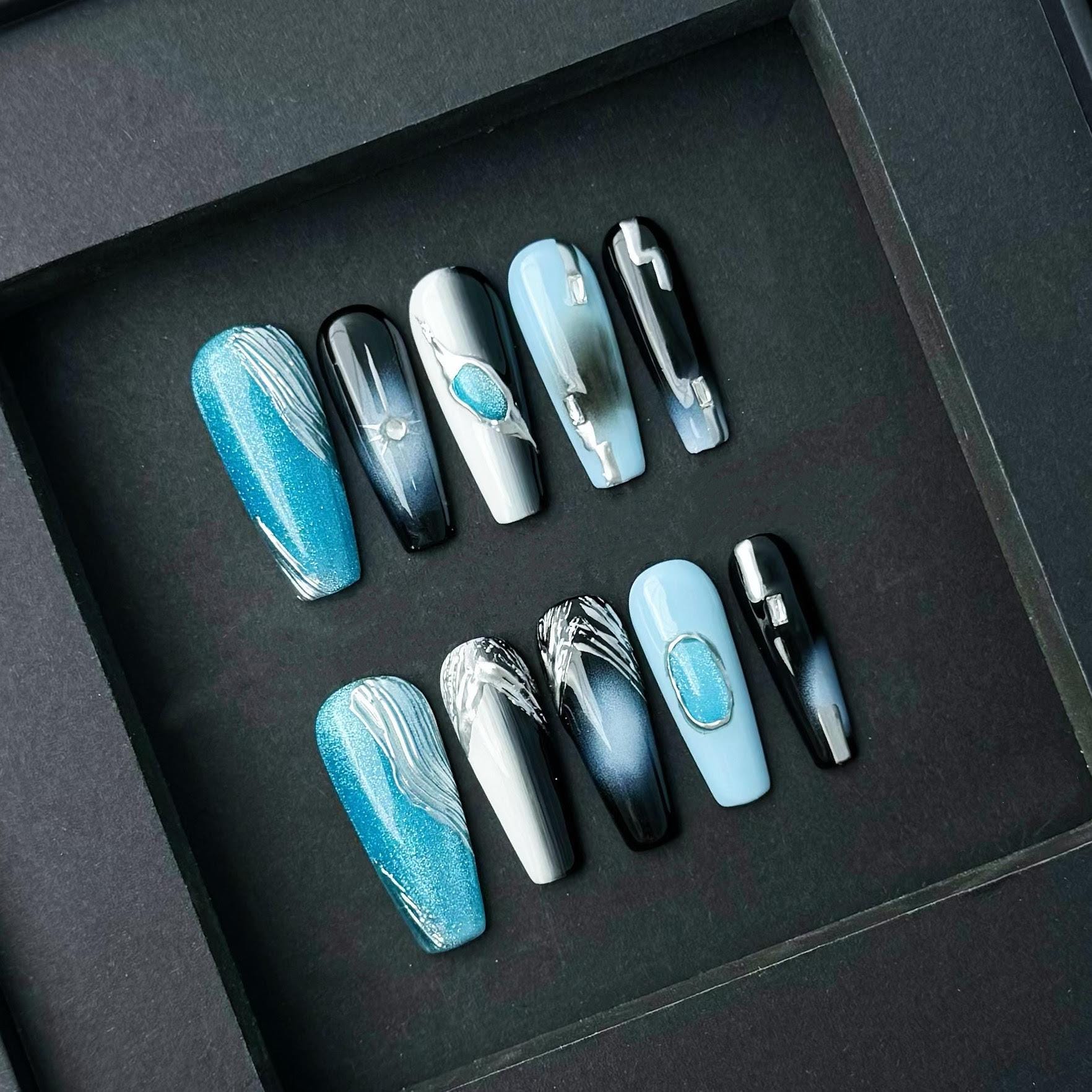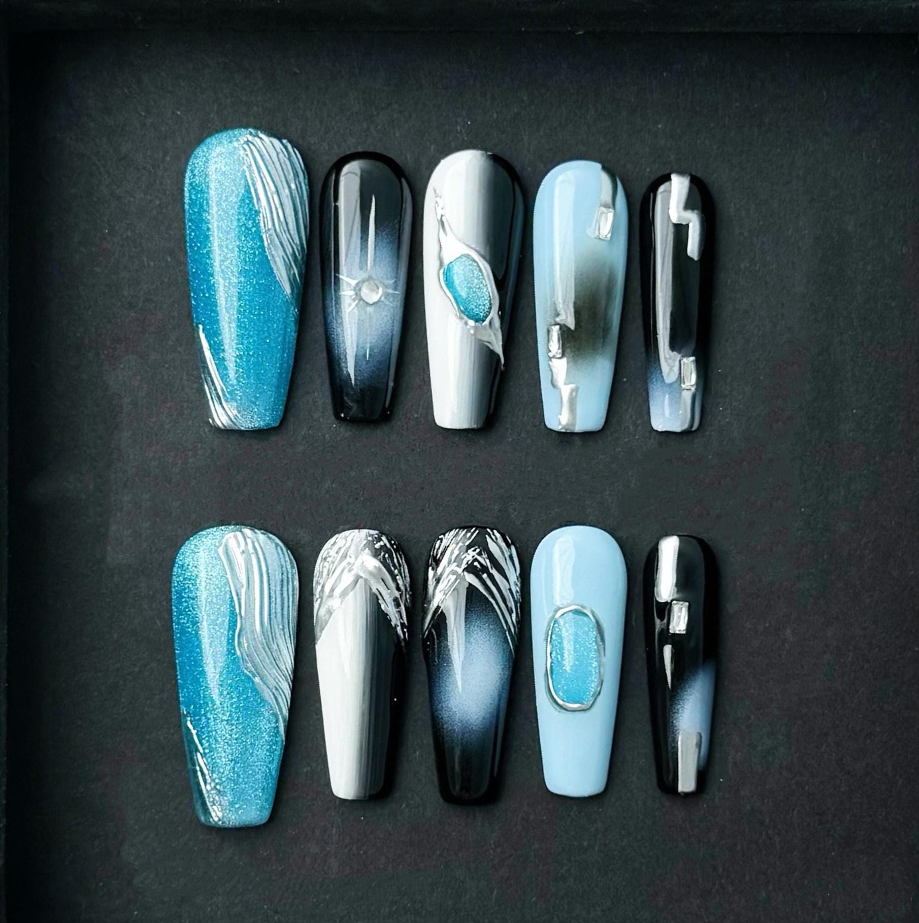 This dramatic set of press on nails features a striking fusion of shimmering blue, gradient black, icy white, and chrome silver detailing. Each nail is uniquely designed with a mix of glittery polish, metallic foil accents, sharp abstract brushstrokes, and gemstone-inspired embellishments. The long coffin shape enhances the bold, modern aesthetic, perfect for anyone who loves futuristic or artistic nail art. Whether you're making a statement at a party or elevating your everyday look, this high-impact nail set delivers both edge and elegance.