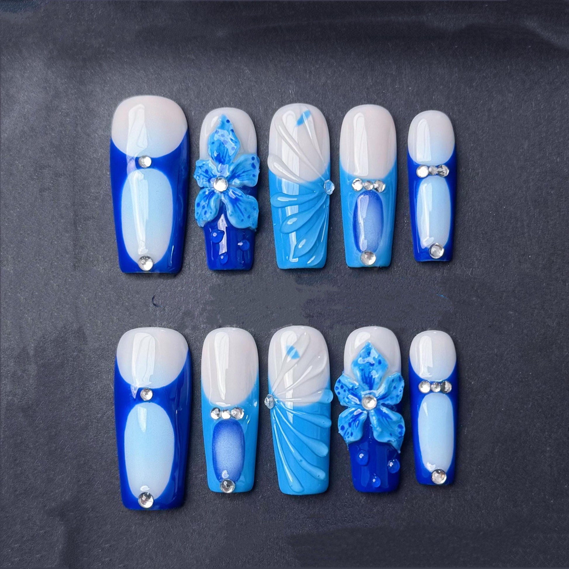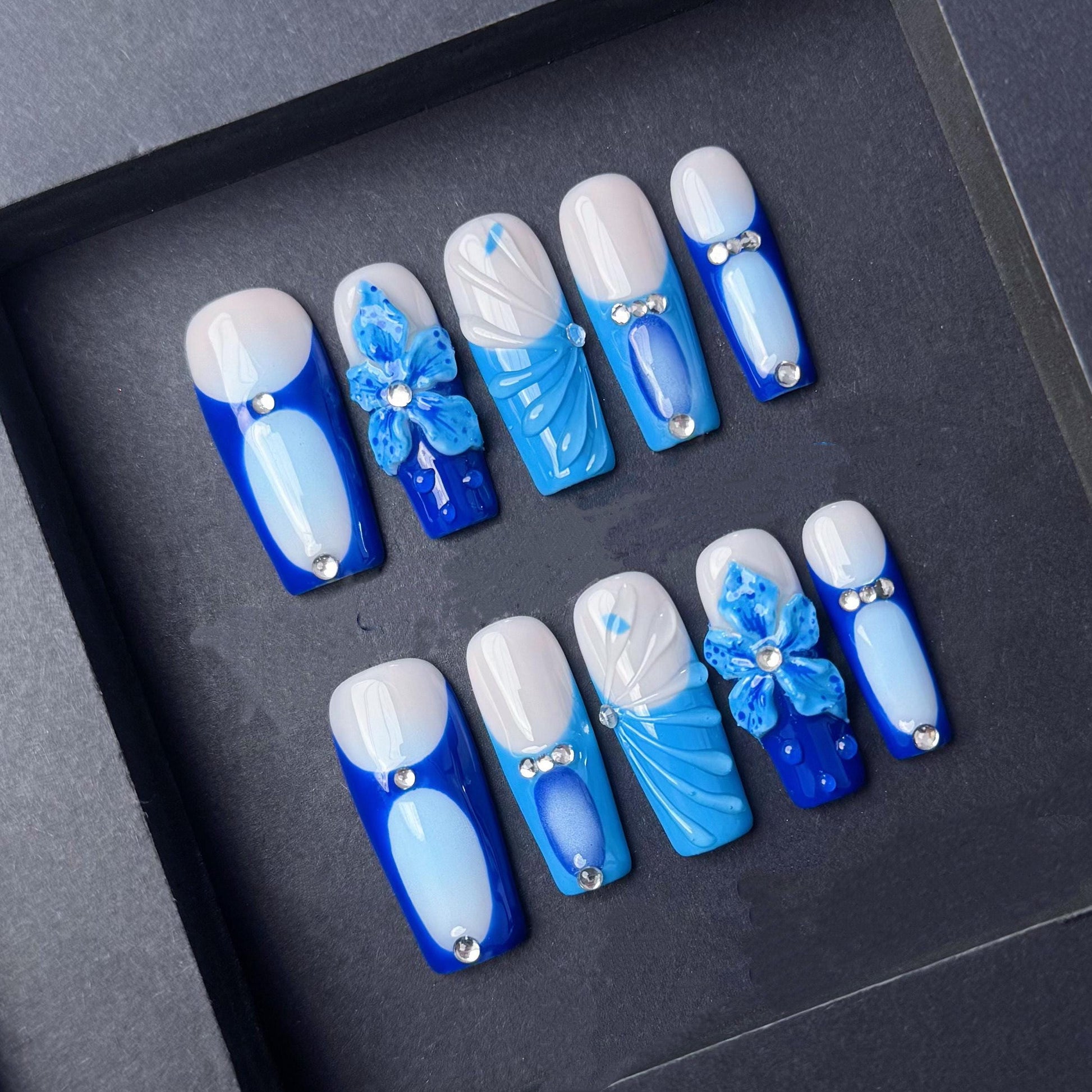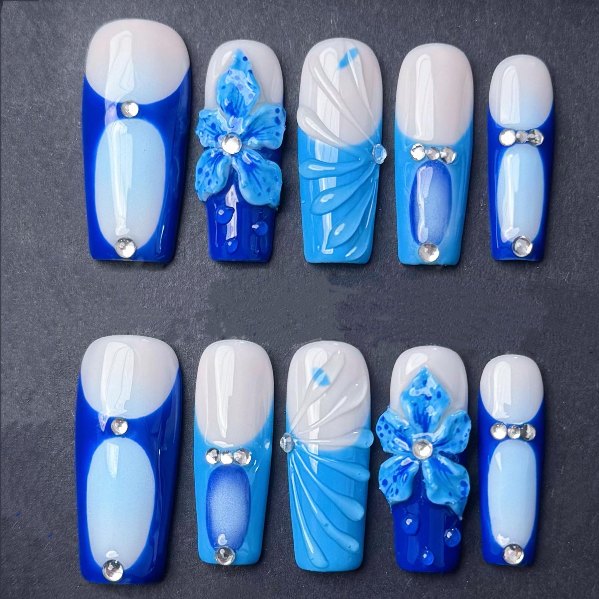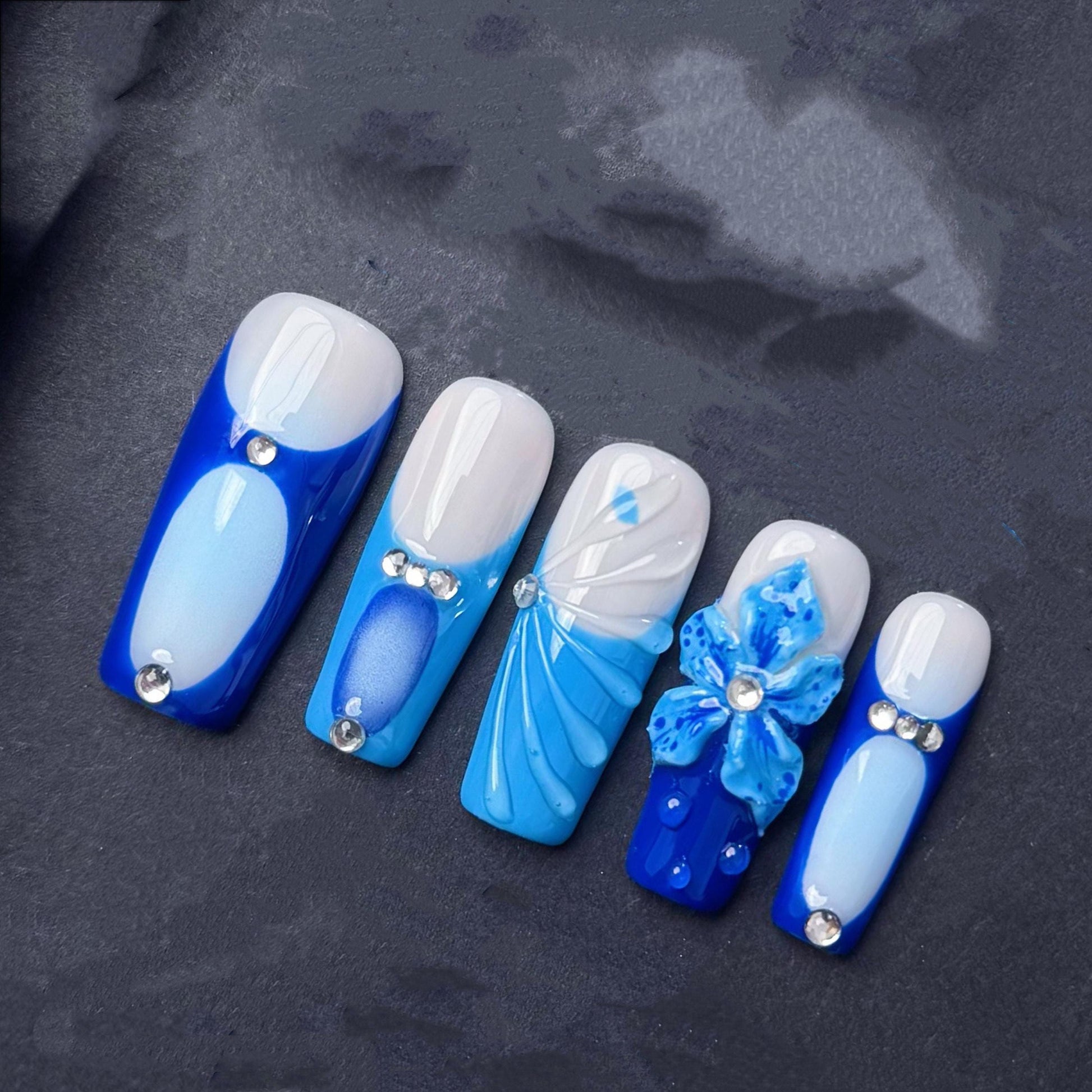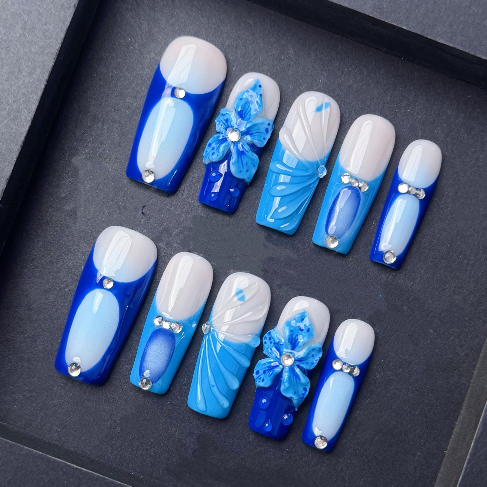 Dive into elegance with this handcrafted blue press-on nail set featuring a stunning gradient from deep royal blue to icy sky blue. Each nail is finished with high-gloss shine and sparkling rhinestones, with statement pieces including beautifully sculpted 3D blue flowers and petal-like embossed patterns. The cohesive color scheme and eye-catching embellishments make these nails perfect for weddings, beach vacations, or any occasion that calls for a fresh, sophisticated pop of blue. Durable, reusable, and easy to apply, these square-shaped press-ons combine oceanic grace with floral beauty.
