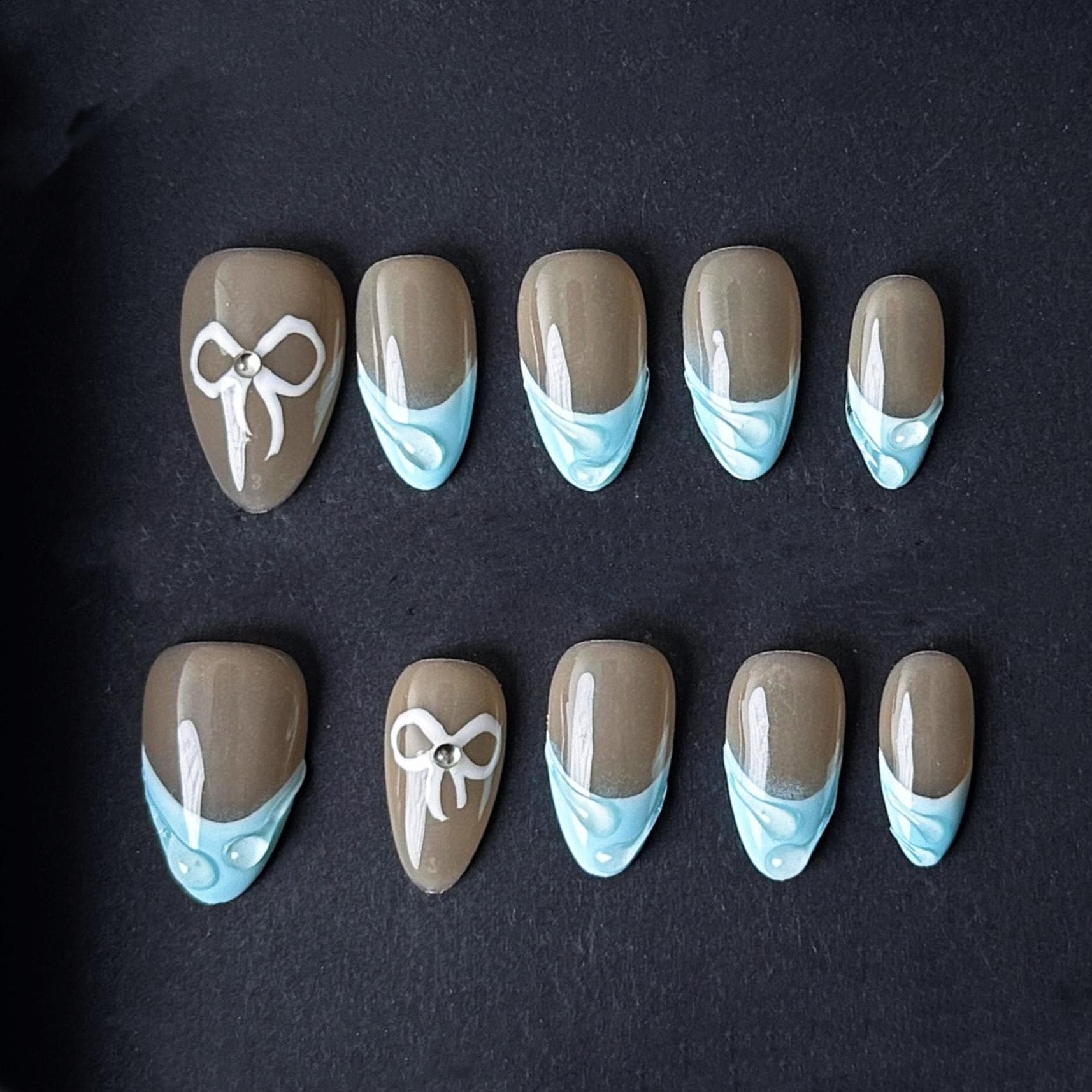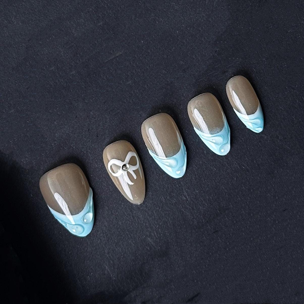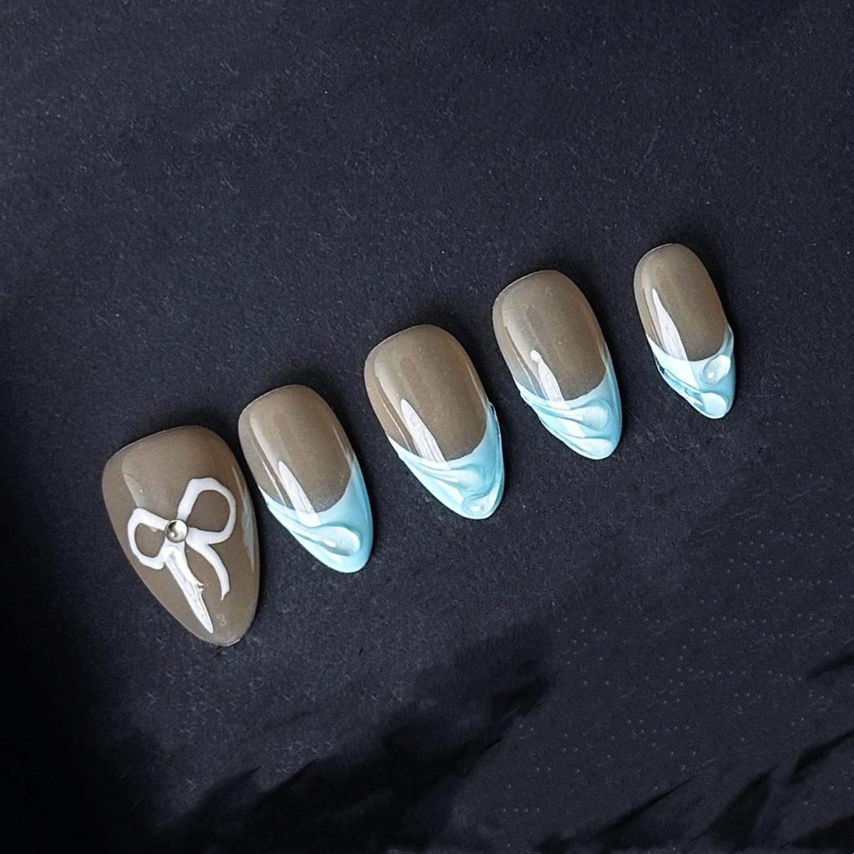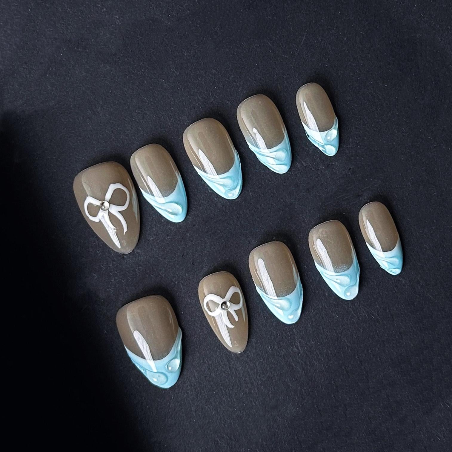 These elegant press on nails feature a glossy taupe base with pastel blue french tips accented by white bow designs and pearl details for a charming and feminine look perfect for everyday wear or special occasions.