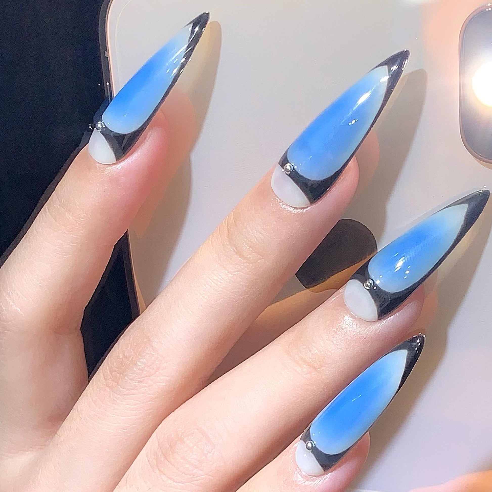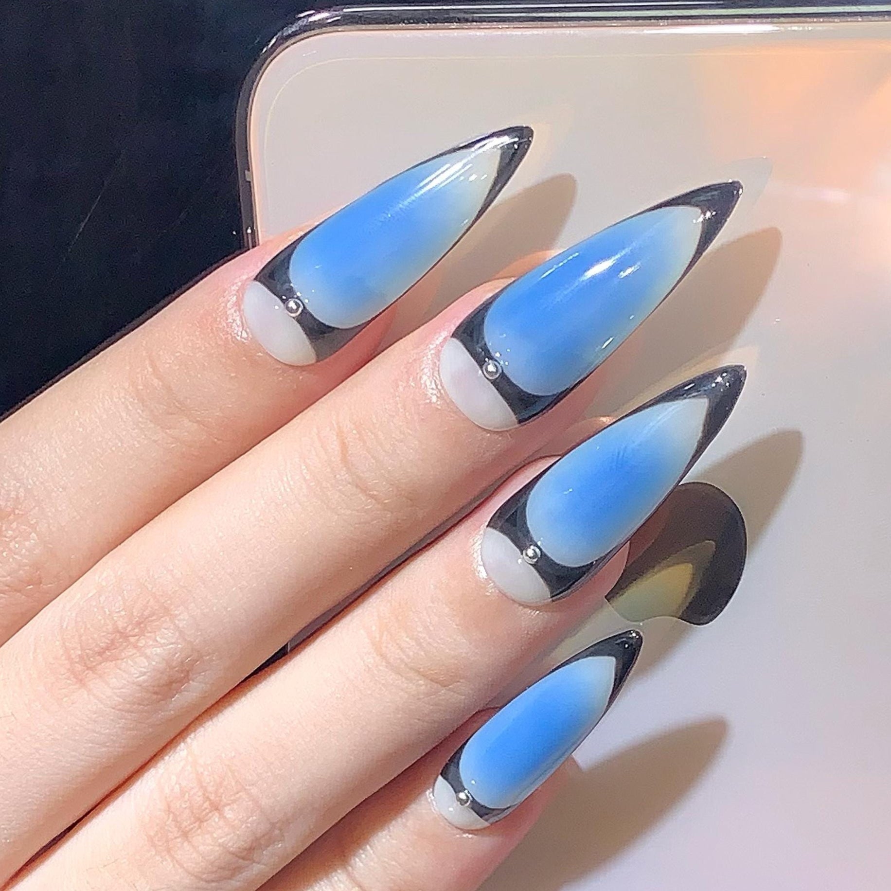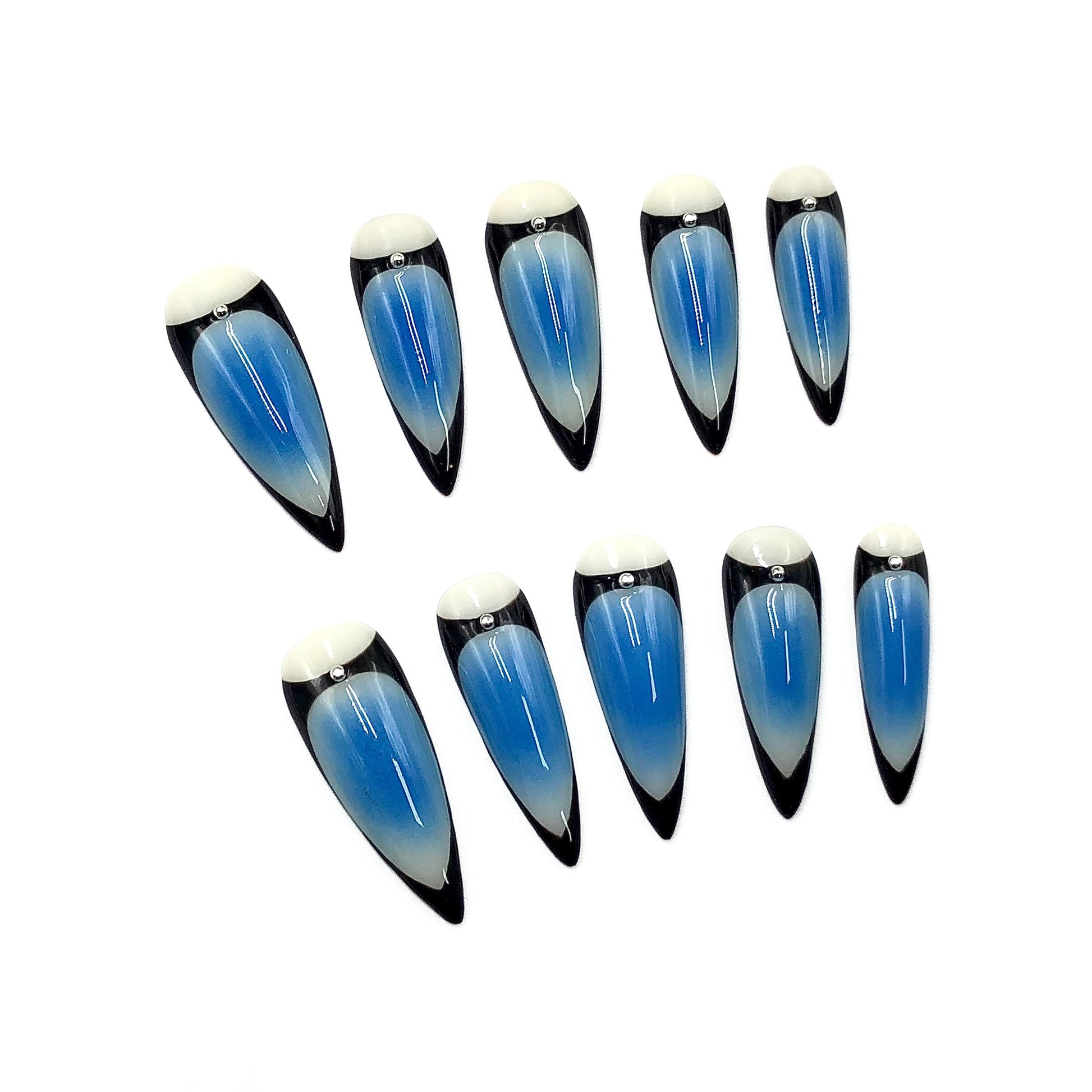 Blue Chrome Press On Hand Painted Nails Long Stiletto Nails with Black Edge Design, Glossy Gradient Nails, Futuristic Statement Nail Set