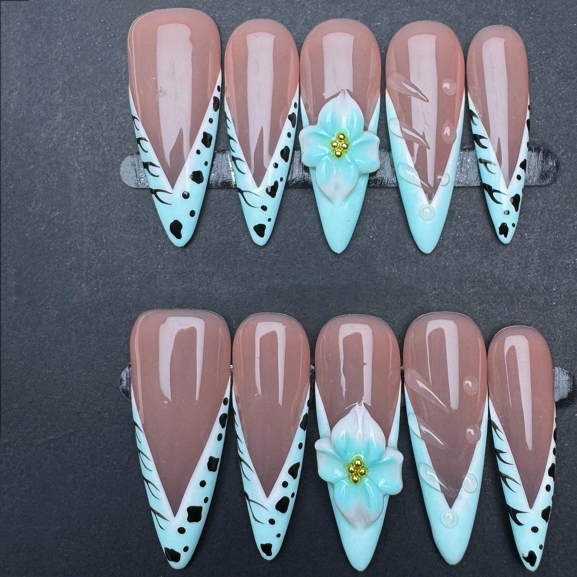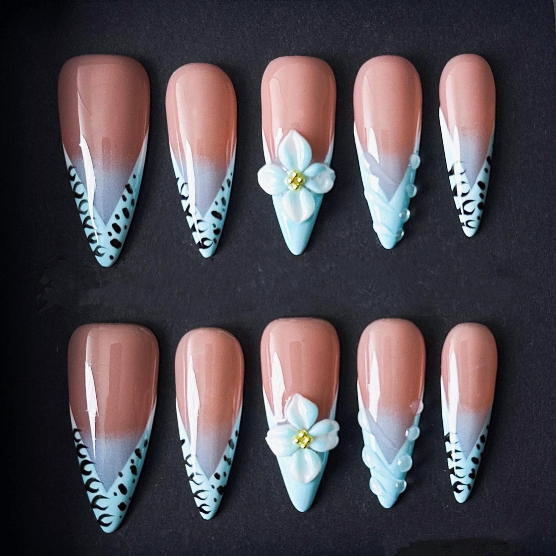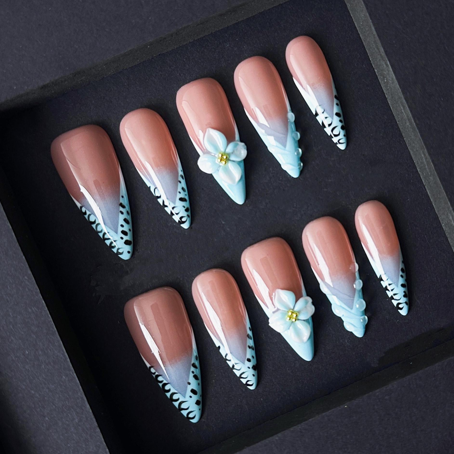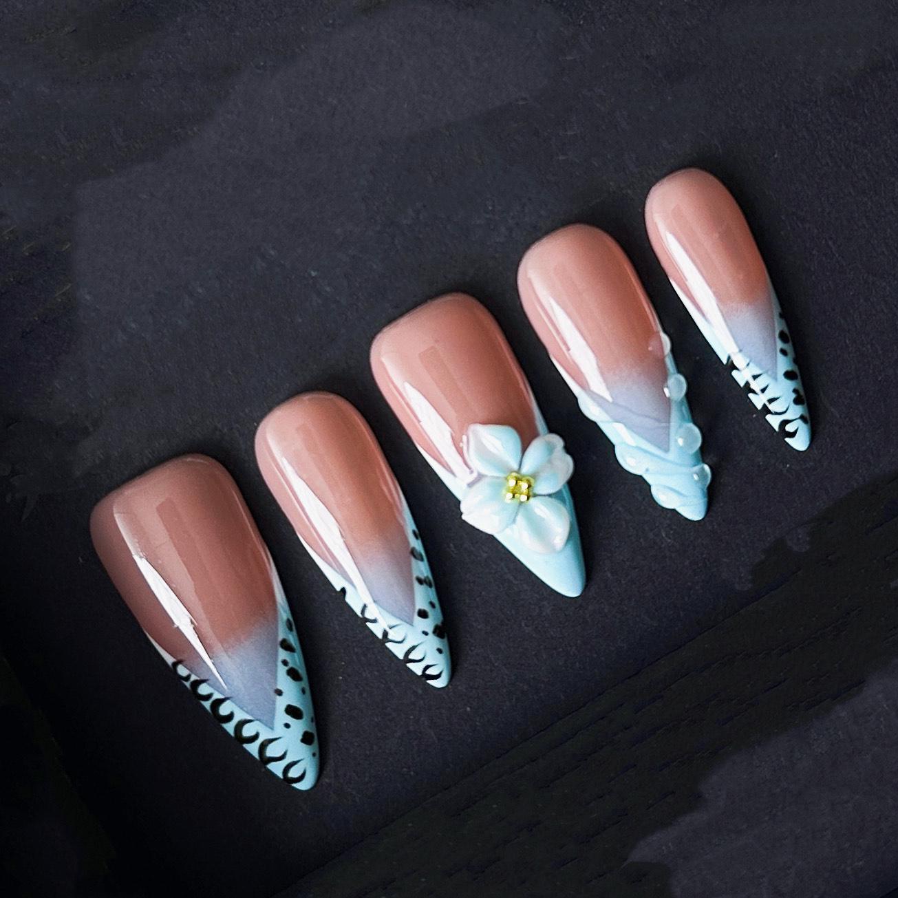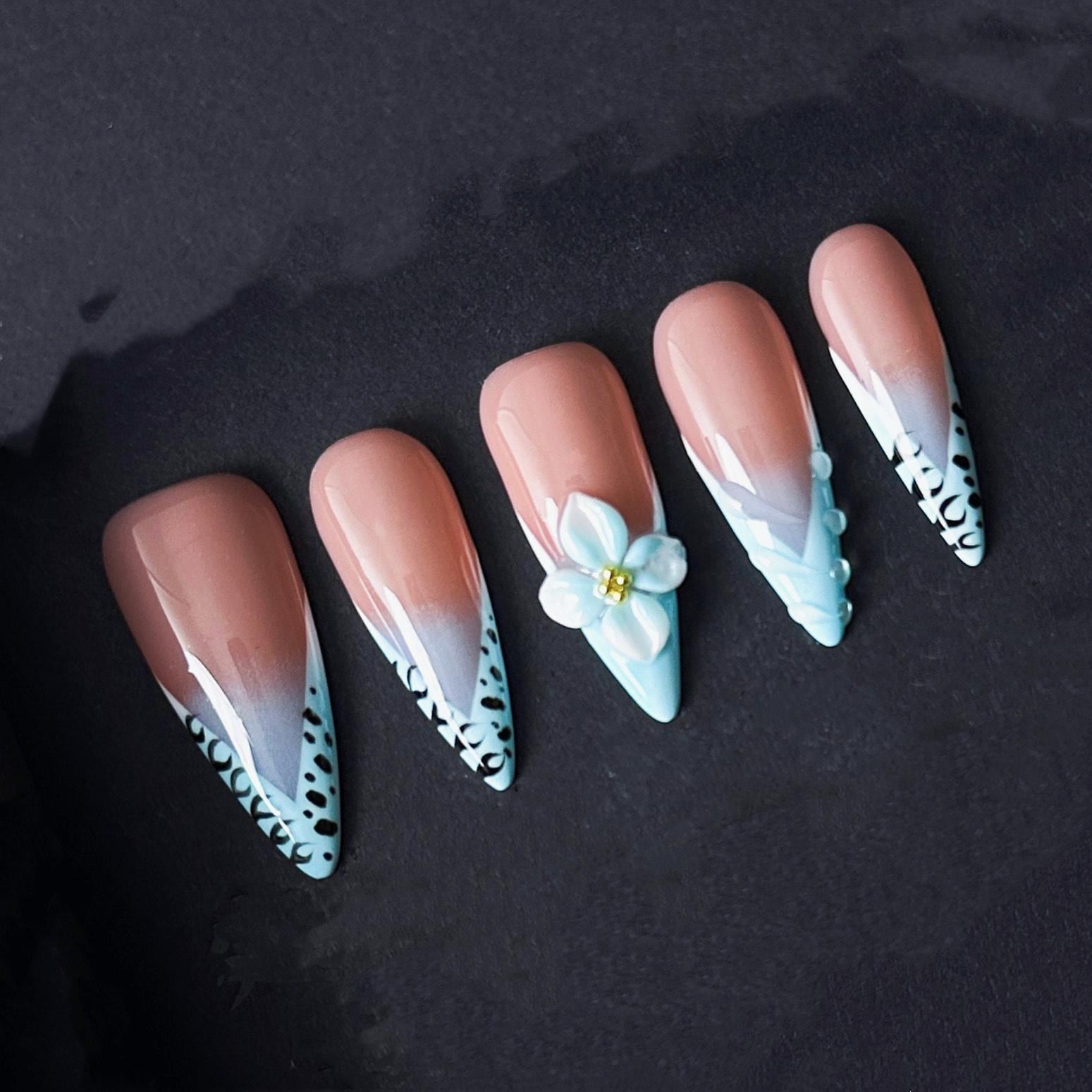 This stylish press on nail set features a soft nude to pale blue ombré base finished with edgy leopard print French tips. The almond shape creates a flattering silhouette, while select nails are adorned with 3D white floral accents and raised pearl-like details for added texture and charm. The contrast between animal print and floral elegance makes this set perfect for those who love mixing fierce and feminine vibes. Handcrafted for a flawless fit, these nails are ideal for spring looks, brunch dates, or adding a pop of personality to any outfit.