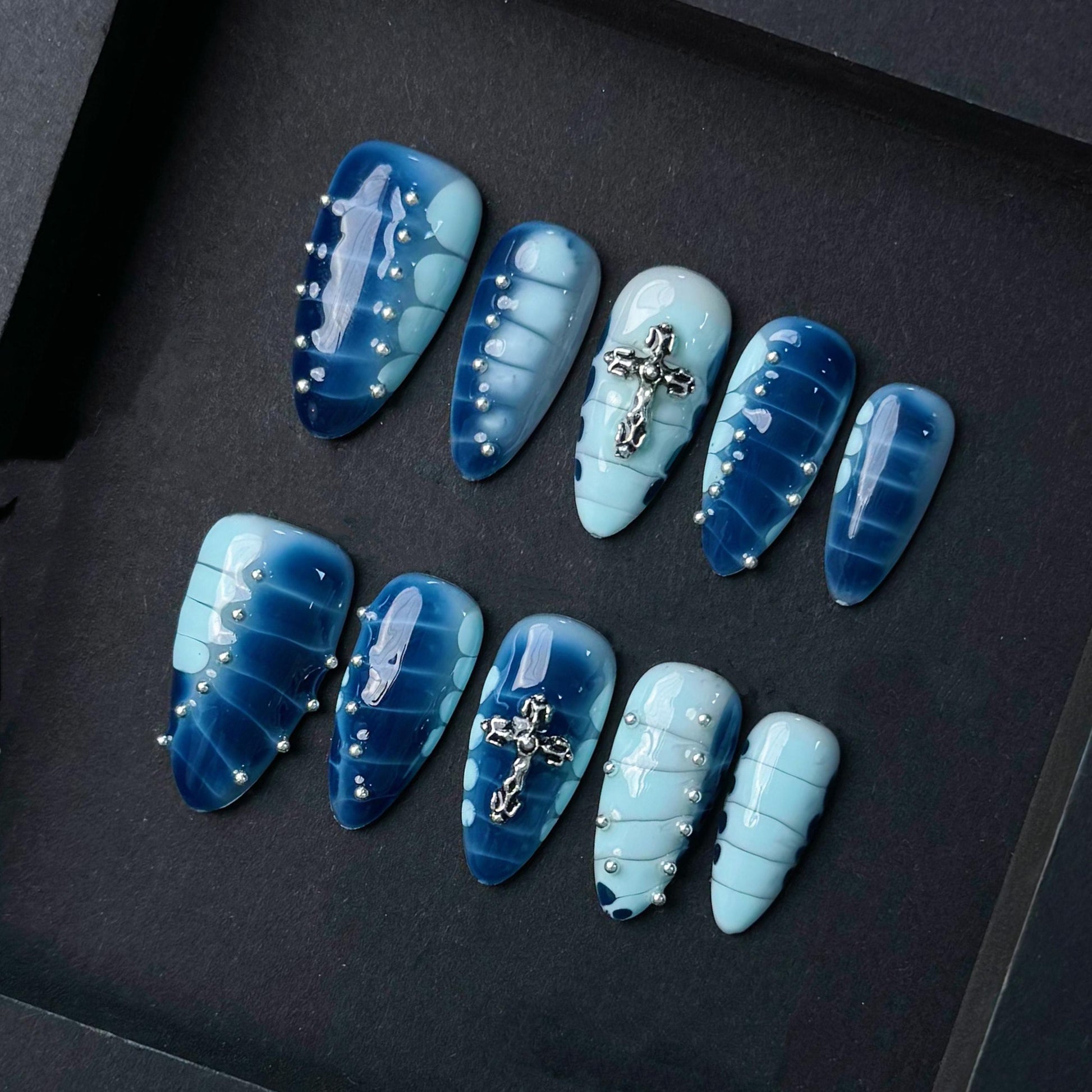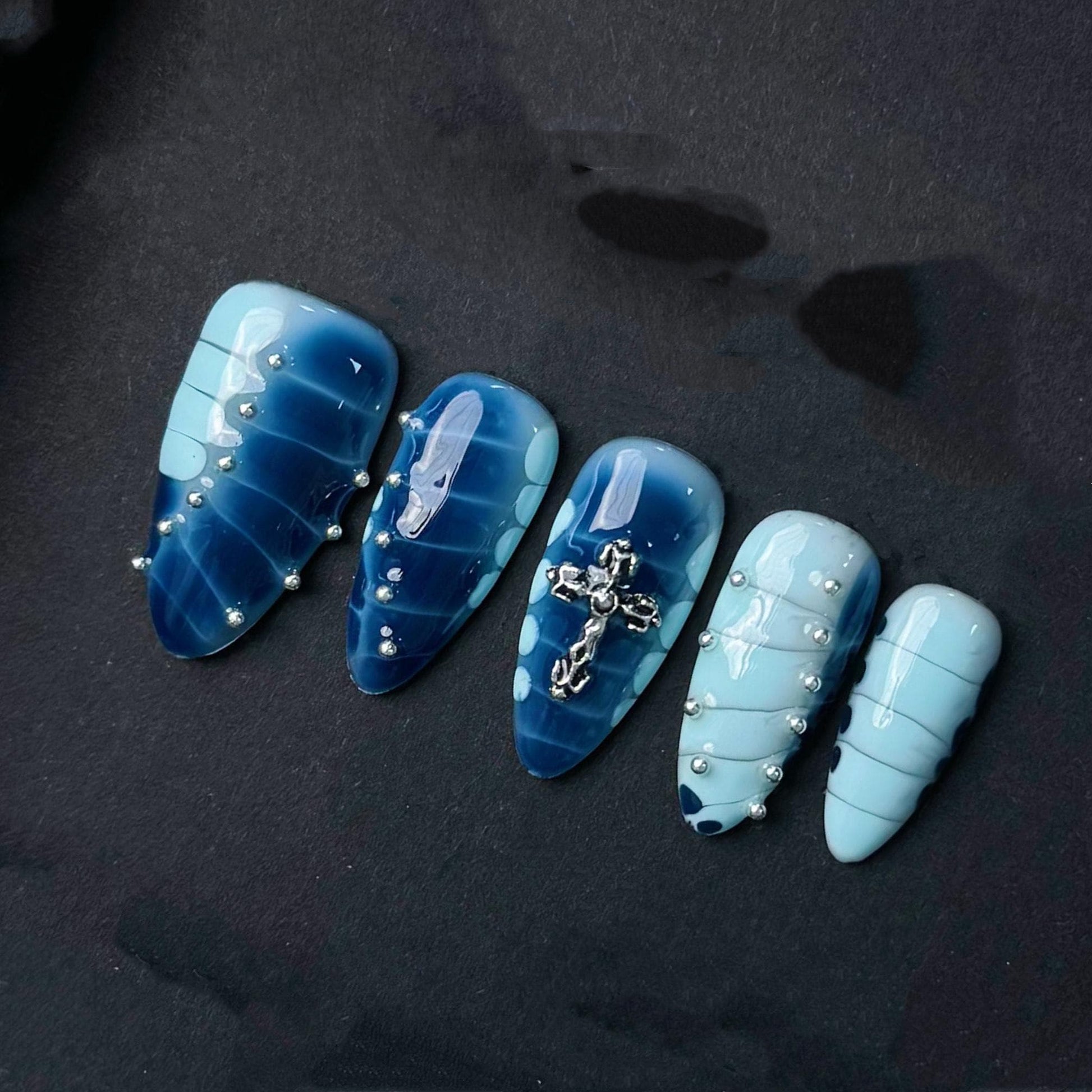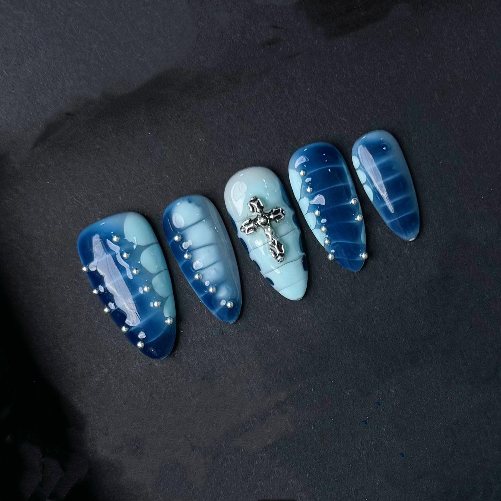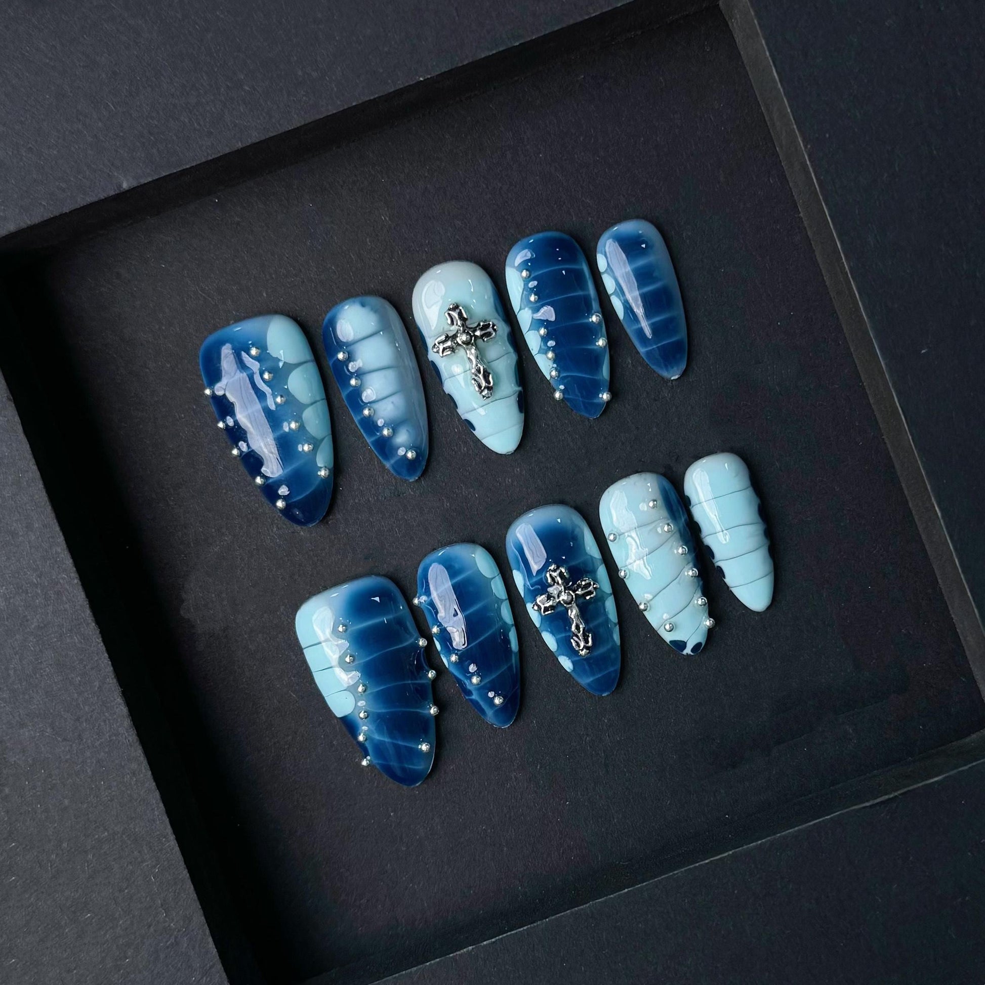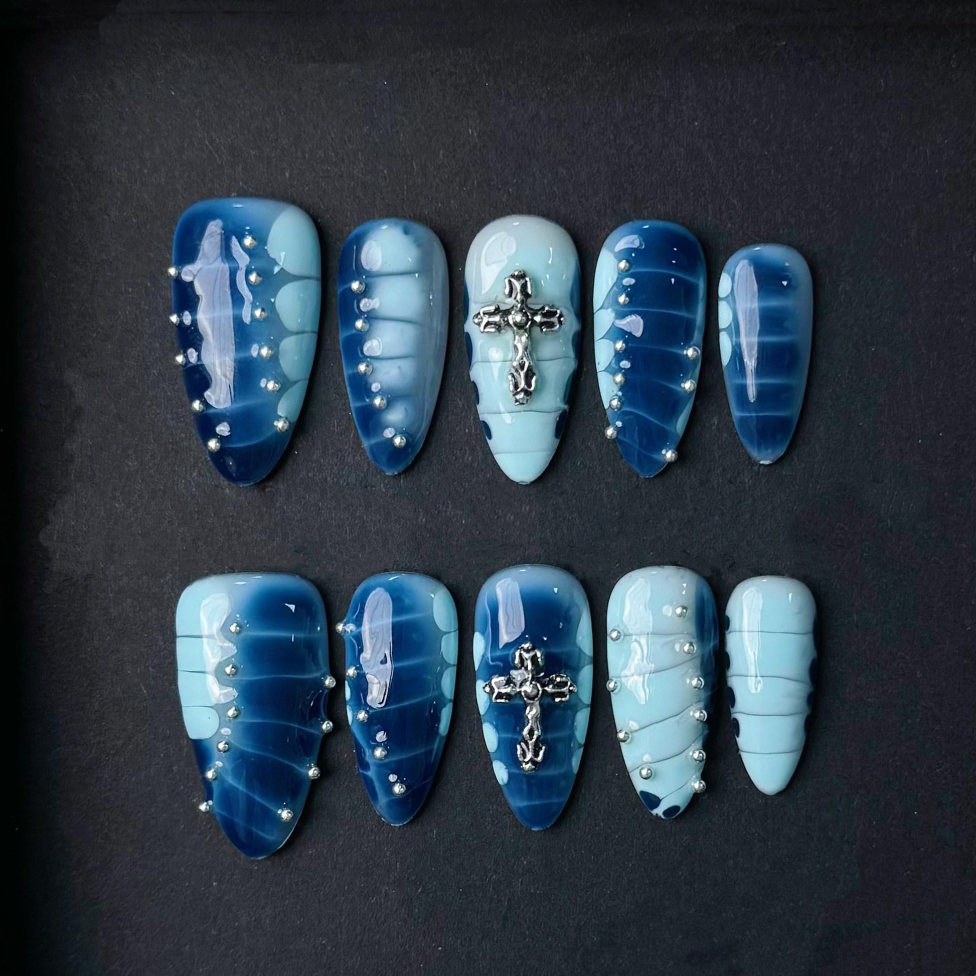 Dive into a bold statement with this blue gothic-inspired press-on nail set, featuring gradient tones from icy blue to deep navy. Each nail is accented with tiny silver rhinestones for added shimmer, while the centerpiece nails boast a striking silver gothic cross embellishment for a dramatic, edgy finish. The unique layered swirl detailing creates a fluid, almost wave-like texture. Perfect for those who love faith-inspired fashion or gothic glam styles. These nails offer a powerful blend of symbolism, elegance, and attitude.