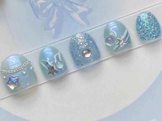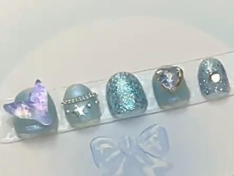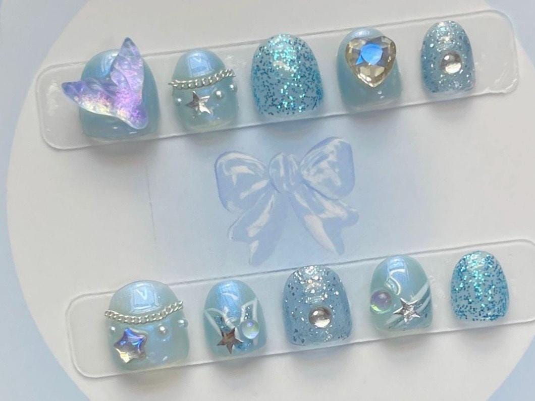 These adorable blue kids’ press-on nails are full of sparkle and charm! Featuring glitter, stars, pearls, and a magical 3D butterfly—perfect for dress-up days, birthdays, or fairy fun.