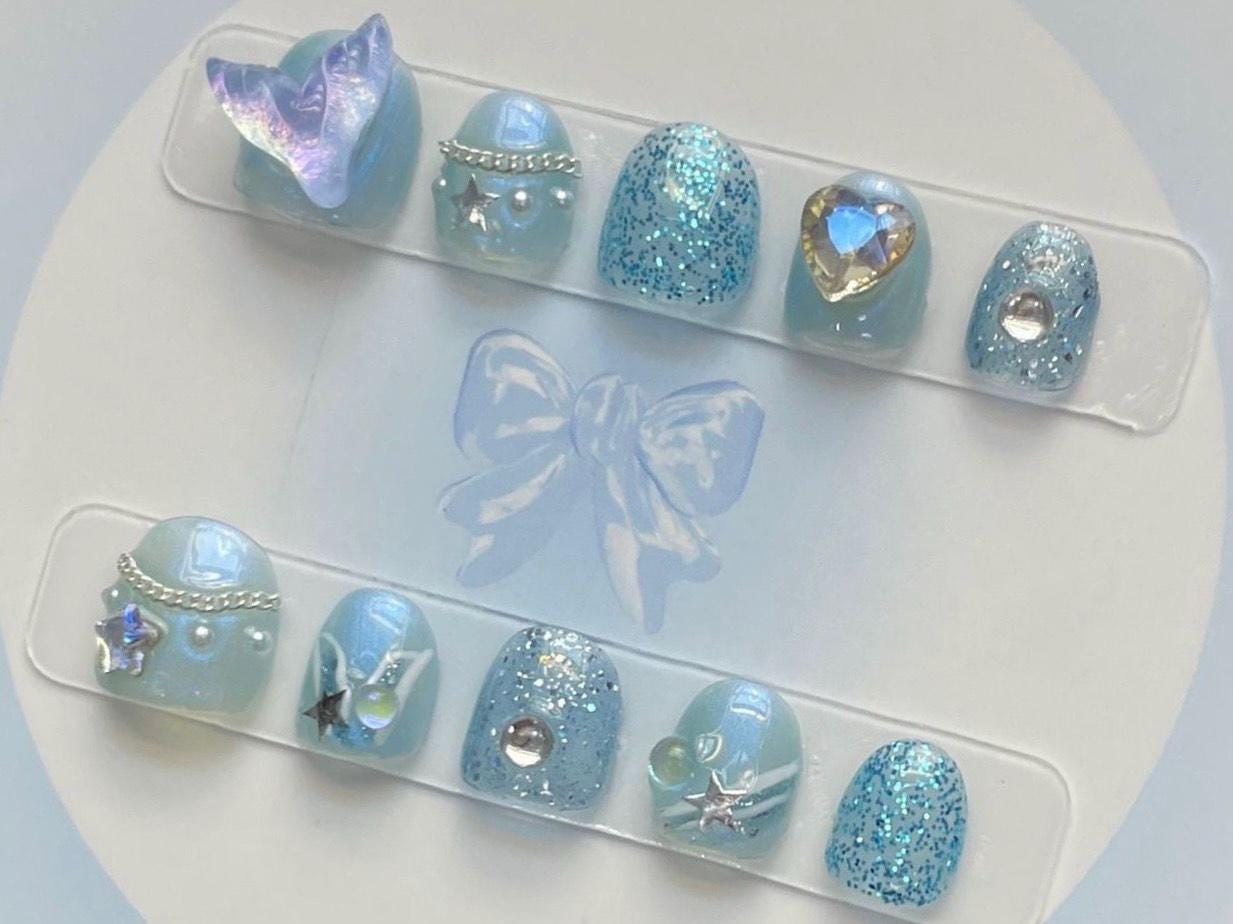 Blue Mermaid Glitter Butterfly Kids Press-On Nails | Child Size Nails with Stars, Charms & Sparkles | Cute Reusable Nail Set