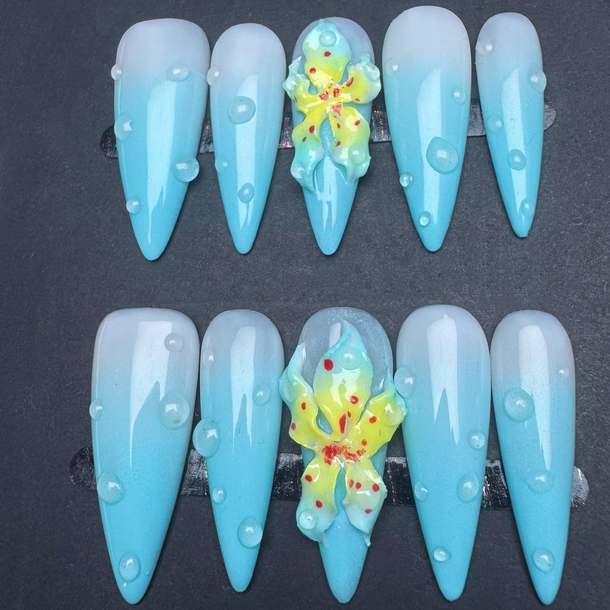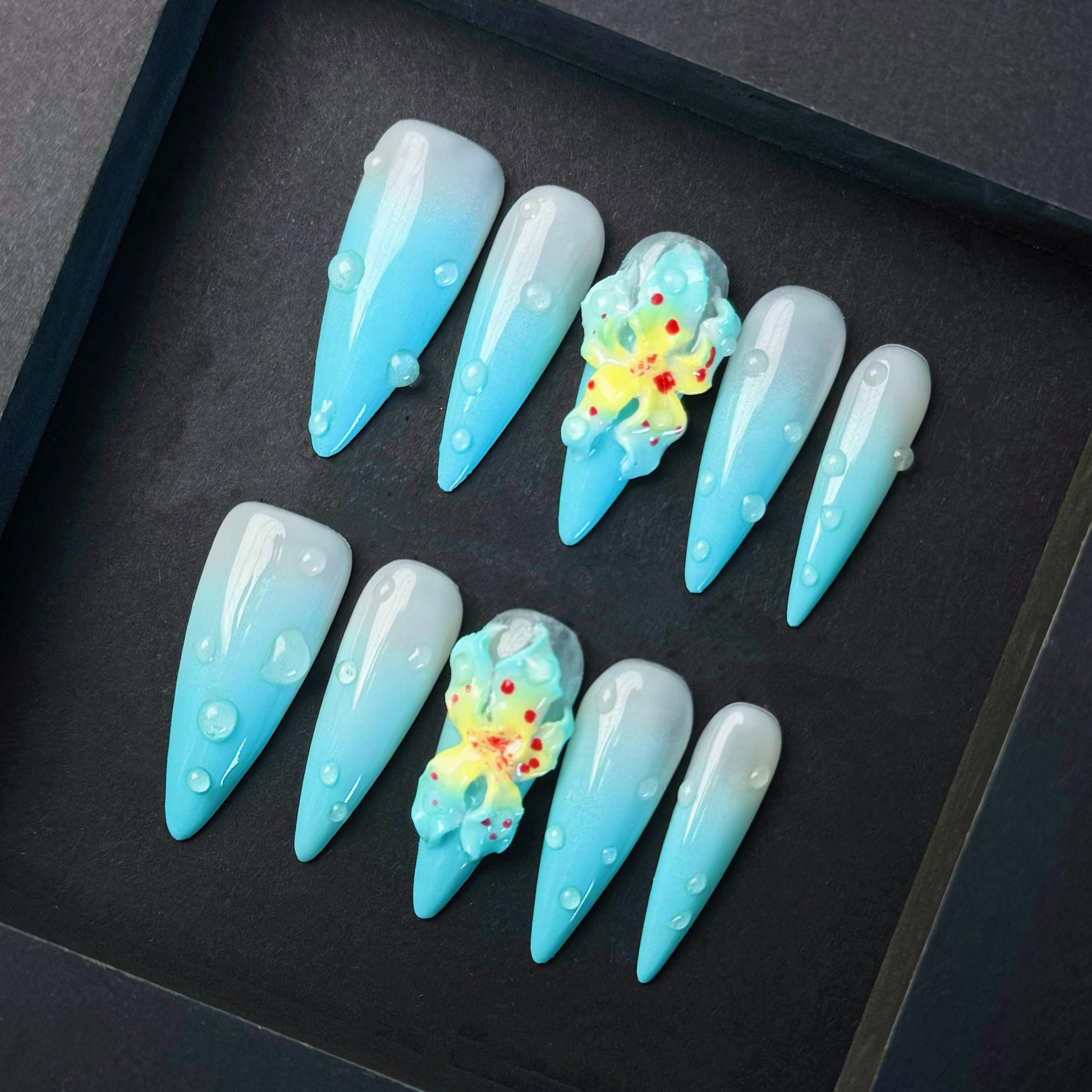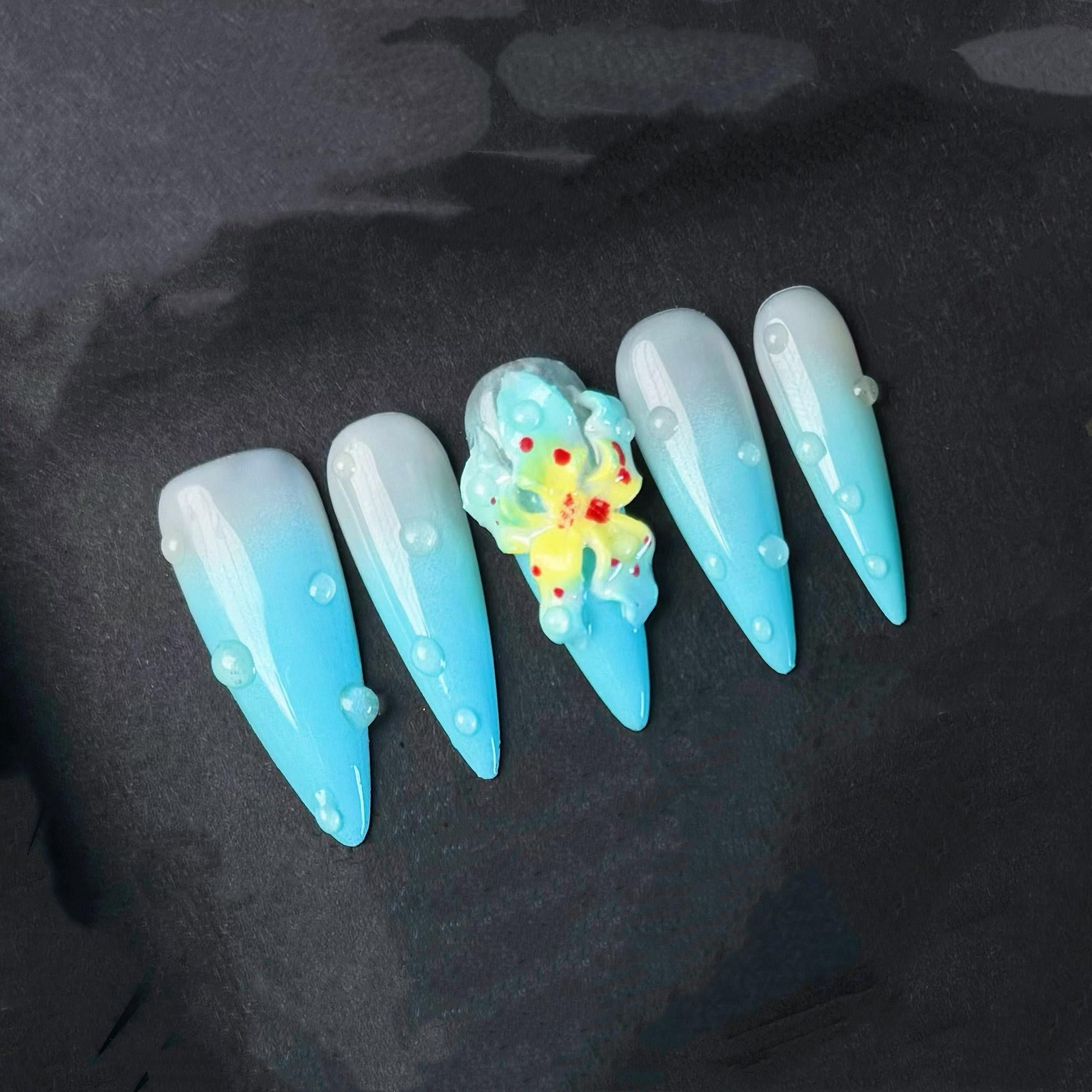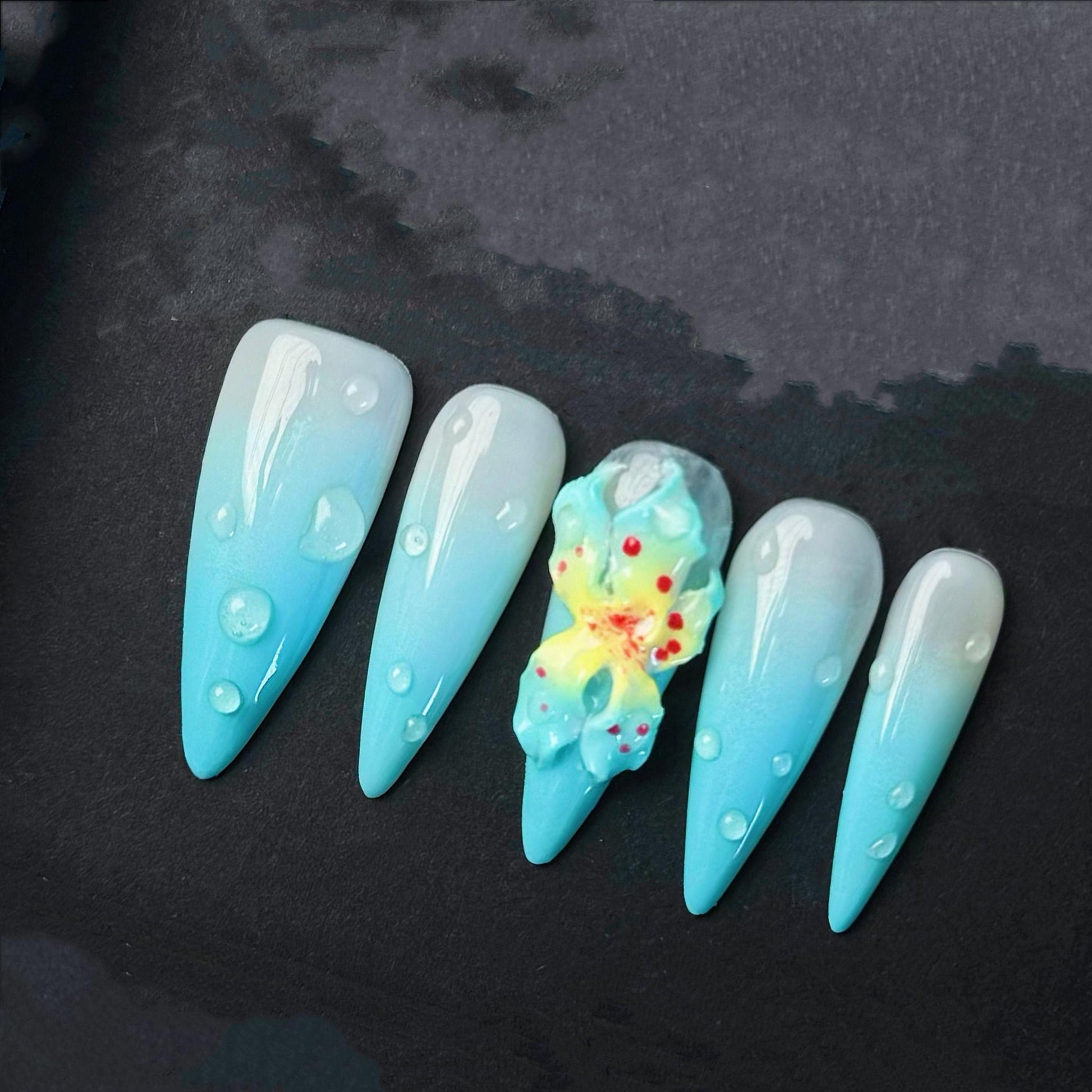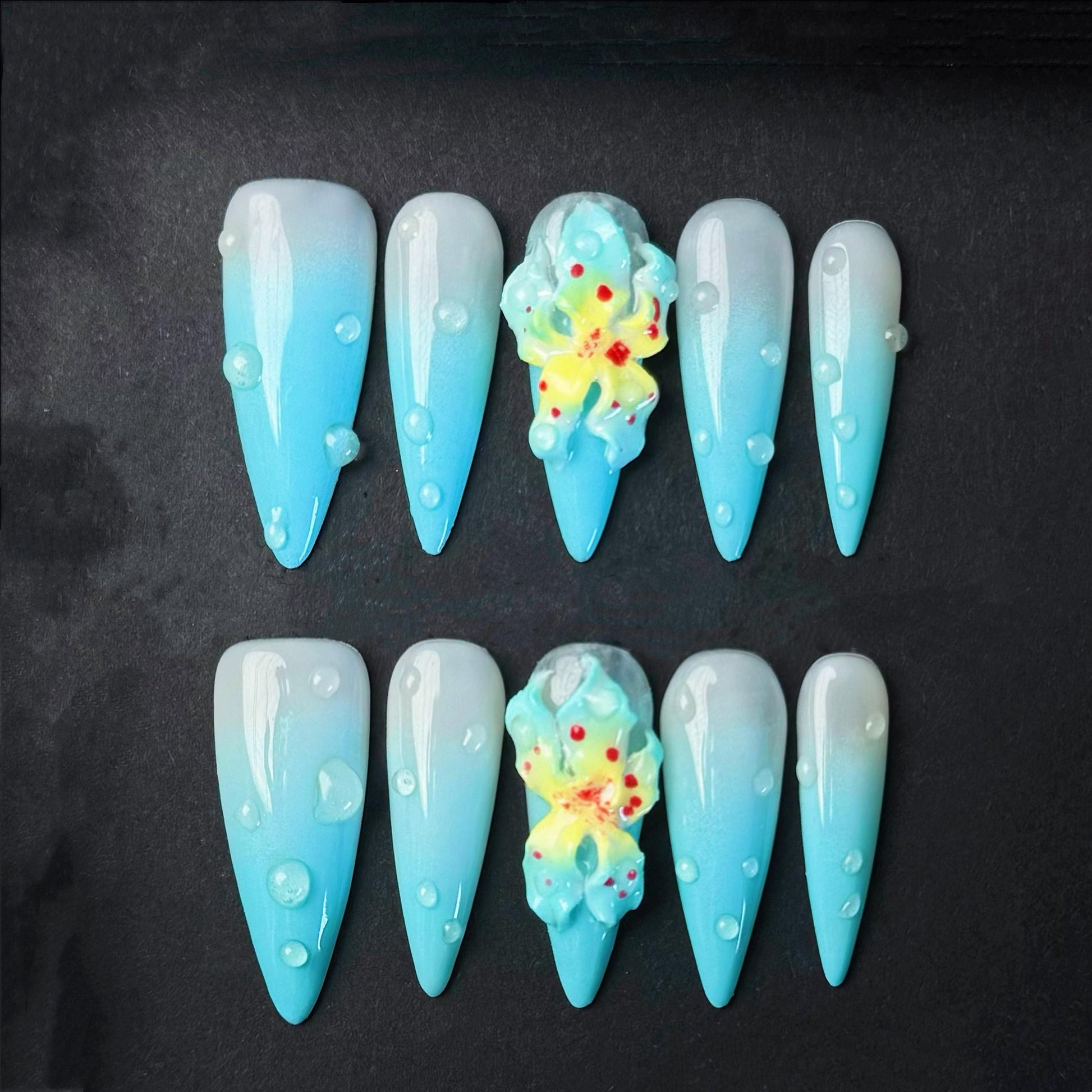 Make waves with this dreamy ocean-inspired press on nail set featuring a soft blue ombre gradient and raised bubble details. The centerpiece nail is adorned with a translucent 3d jelly flower in vibrant yellow and red evoking tropical island vibes. These stiletto nails capture the refreshing spirit of the sea making them perfect for summer vacations beach events or mermaid core aesthetics. Handmade with salon quality gel and reusable for bold sun-soaked style.