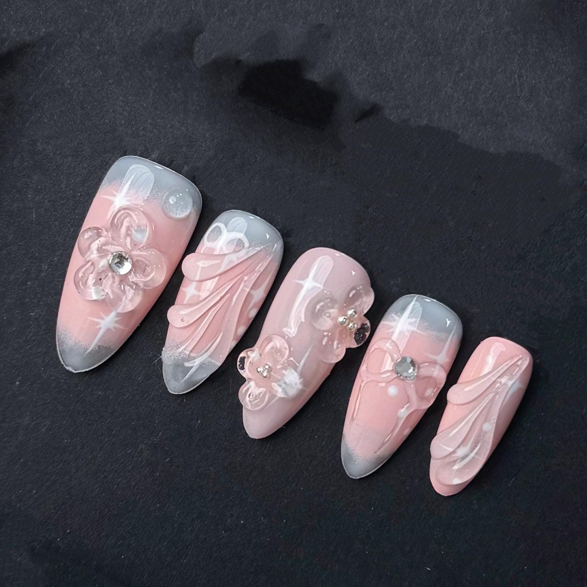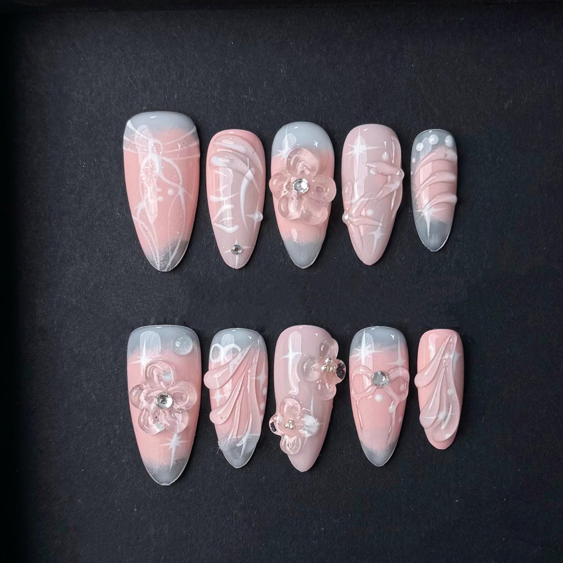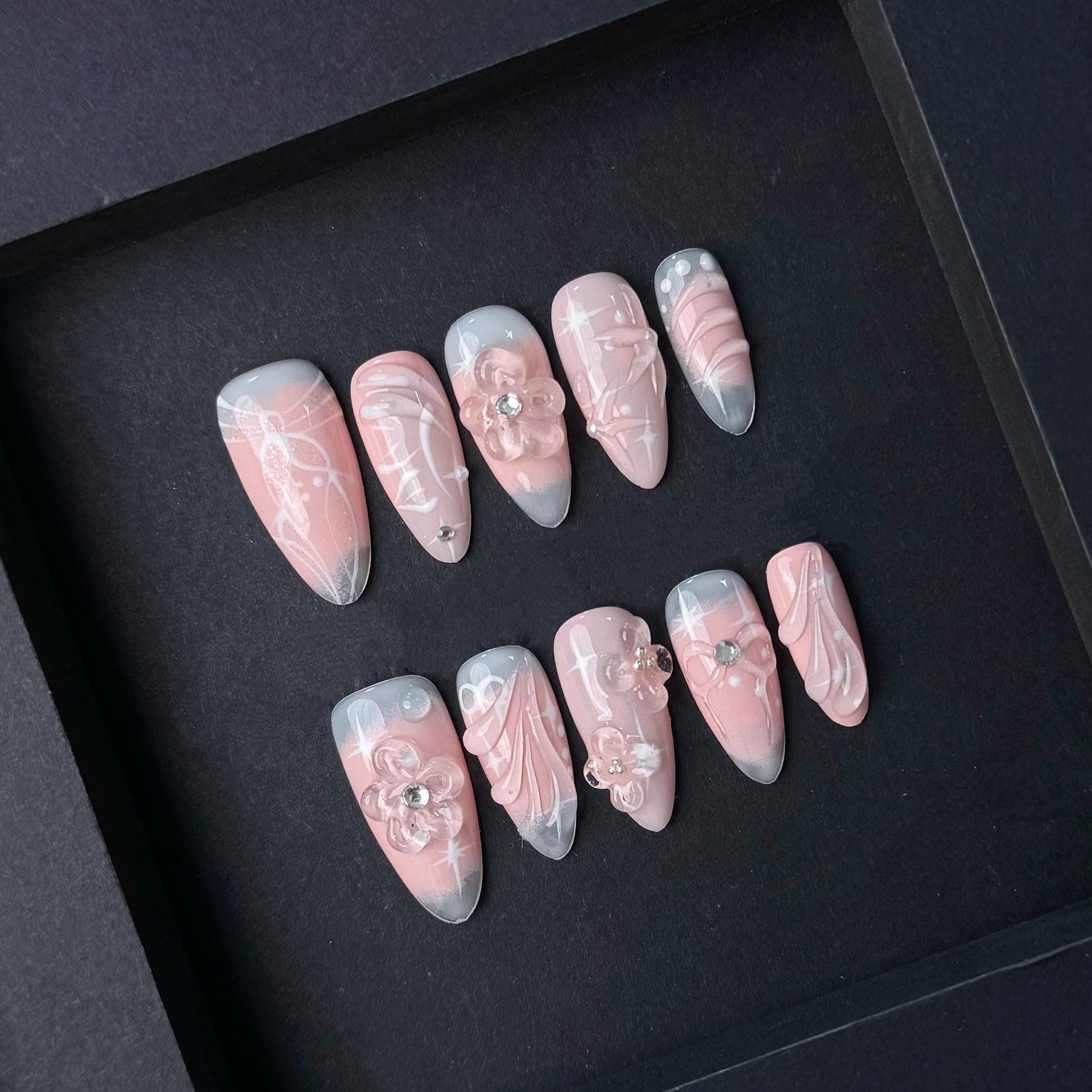 A delicate press on nail set in soft blush pink with white detailing pearl accents and 3d floral art for a romantic and elegant finish perfect for weddings date nights or everyday glam.