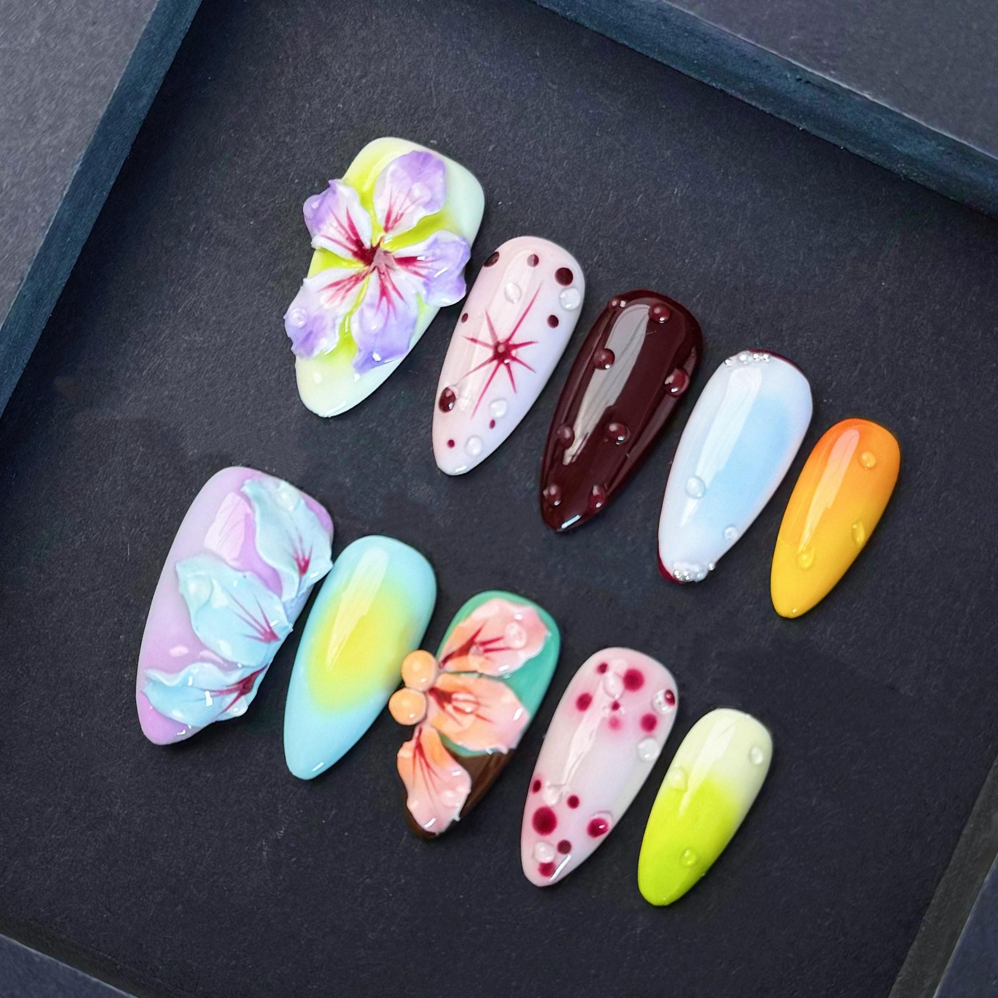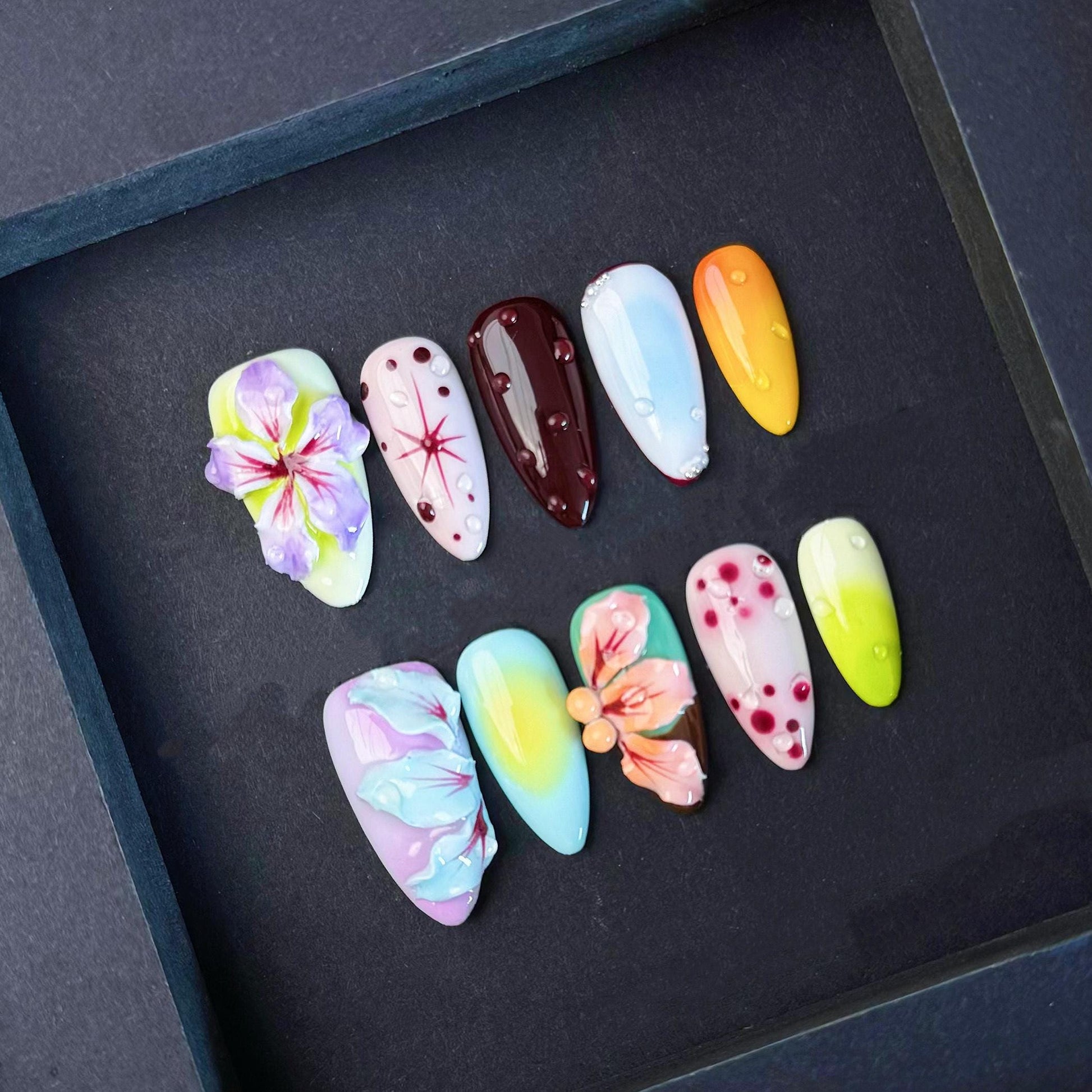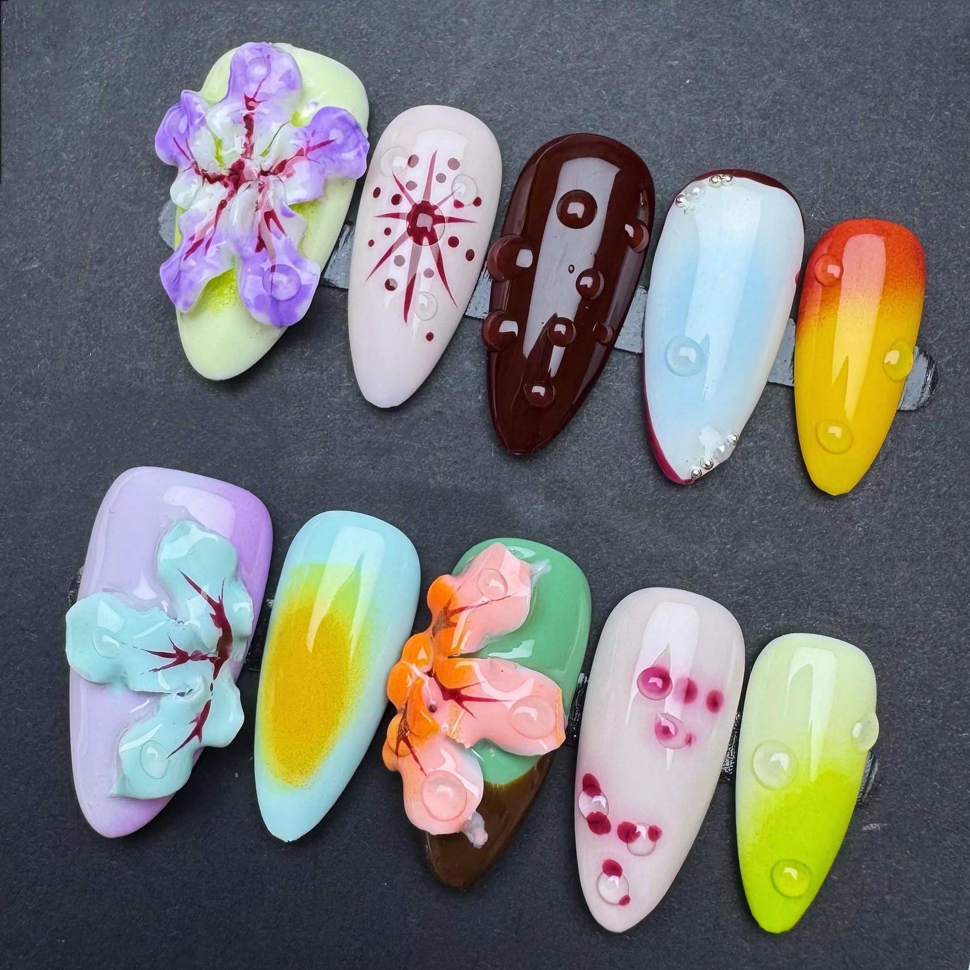 Make a bold statement with this vibrant set of press-on nails featuring dreamy abstract florals and whimsical water droplet effects. Each nail is a work of art, blending soft ombré backgrounds in mint, lilac, blue, and lemon yellow with bold pops of color like chocolate brown, cherry red, and orange. Intricate 3D flowers bloom from the nail surface, accented by dripping-style dots and radiant gradients. With their artistic and playful design, these nails are perfect for spring festivals, summer adventures, or anyone craving a fresh and fun look.