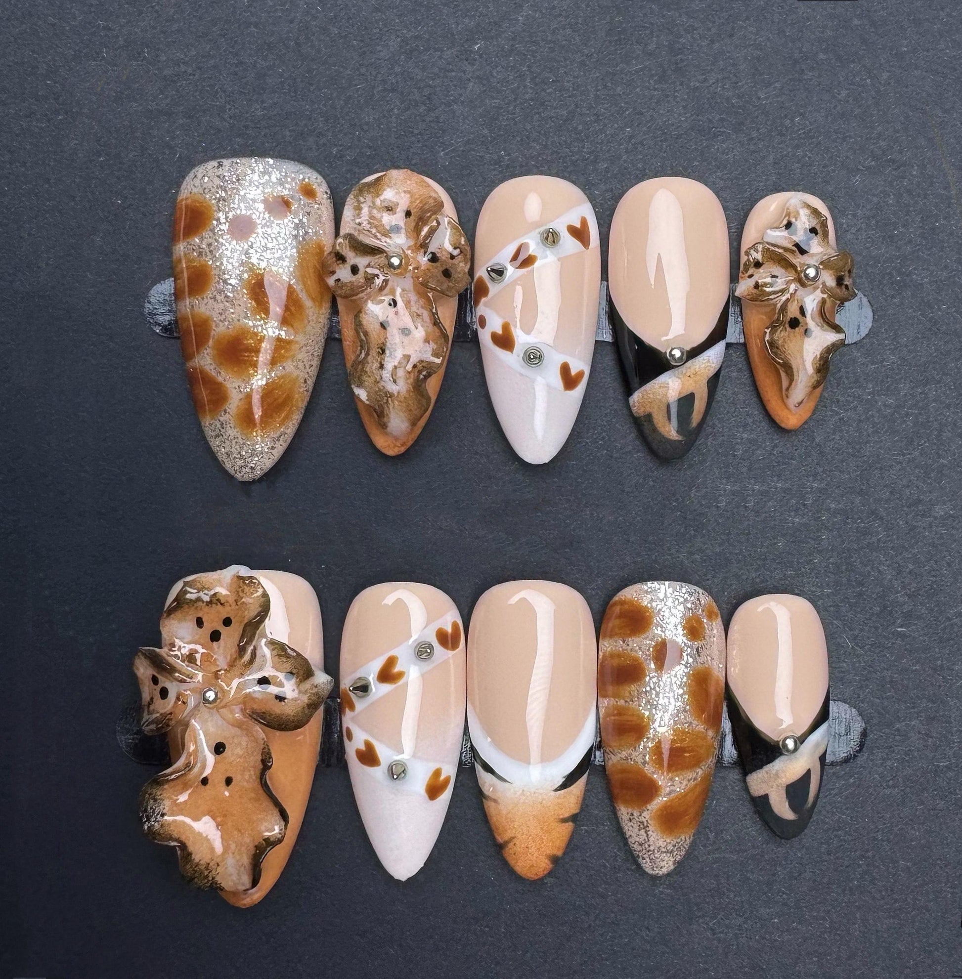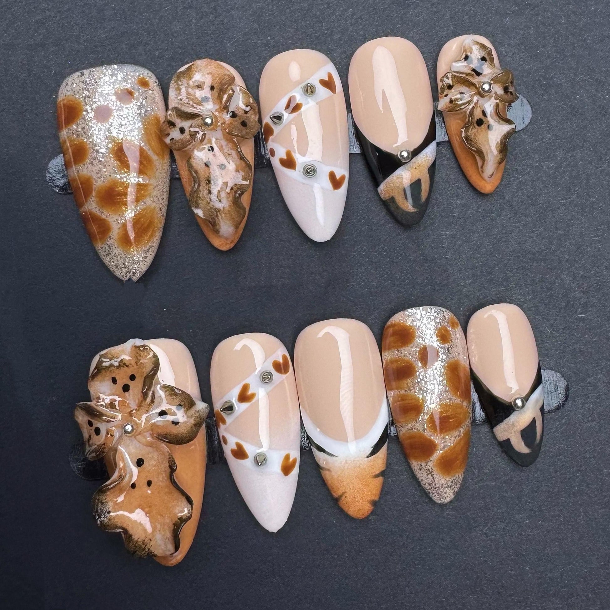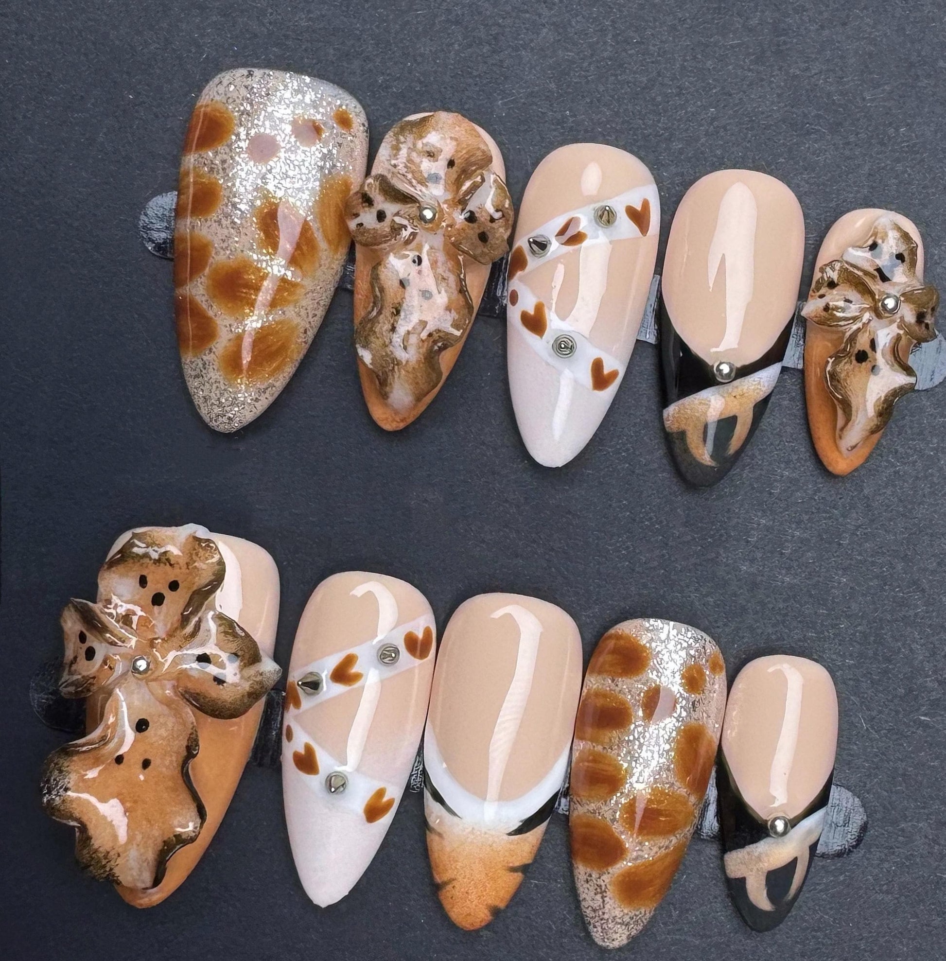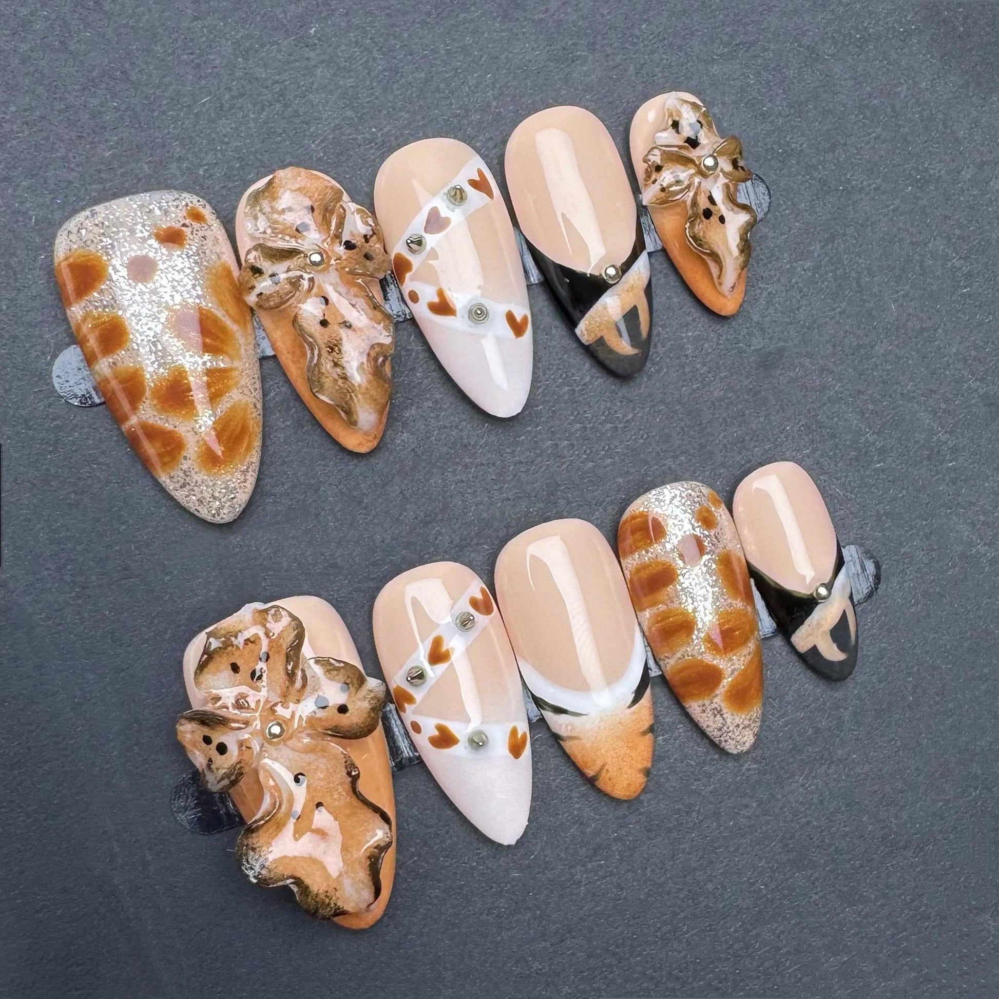 Step into the wild with these stunning giraffe-print inspired press on nails, designed in warm earthy tones of brown, caramel, and nude. The set features a mix of patterns including realistic animal spots, 3D sculpted giraffe shapes, mini heart trails, and glitter accents for extra flair. Bold 3D designs and mixed textures elevate these nails into wearable art, perfect for animal lovers, safari-chic styles, or anyone craving a statement look. A playful blend of wilderness and glam, these nails are handmade to stand out.