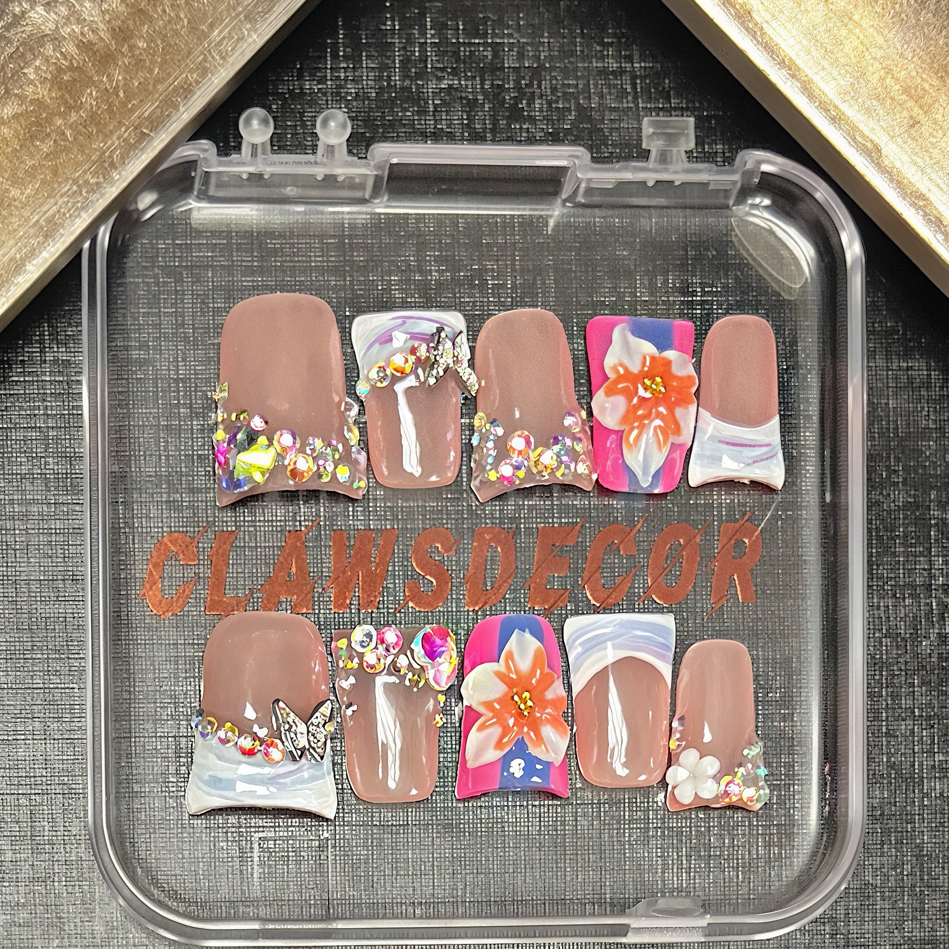 This set blends nude pink with tie-dye marble swirls in blue & magenta, topped with shimmering rhinestones and sculpted flowers for a dreamy, artistic finish. Each nail is crafted to catch the light beautifully, making it a perfect choice for vacations, parties, weddings, photoshoots, or everyday glam.