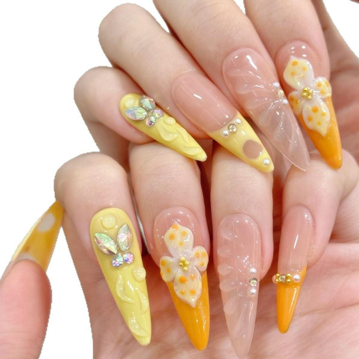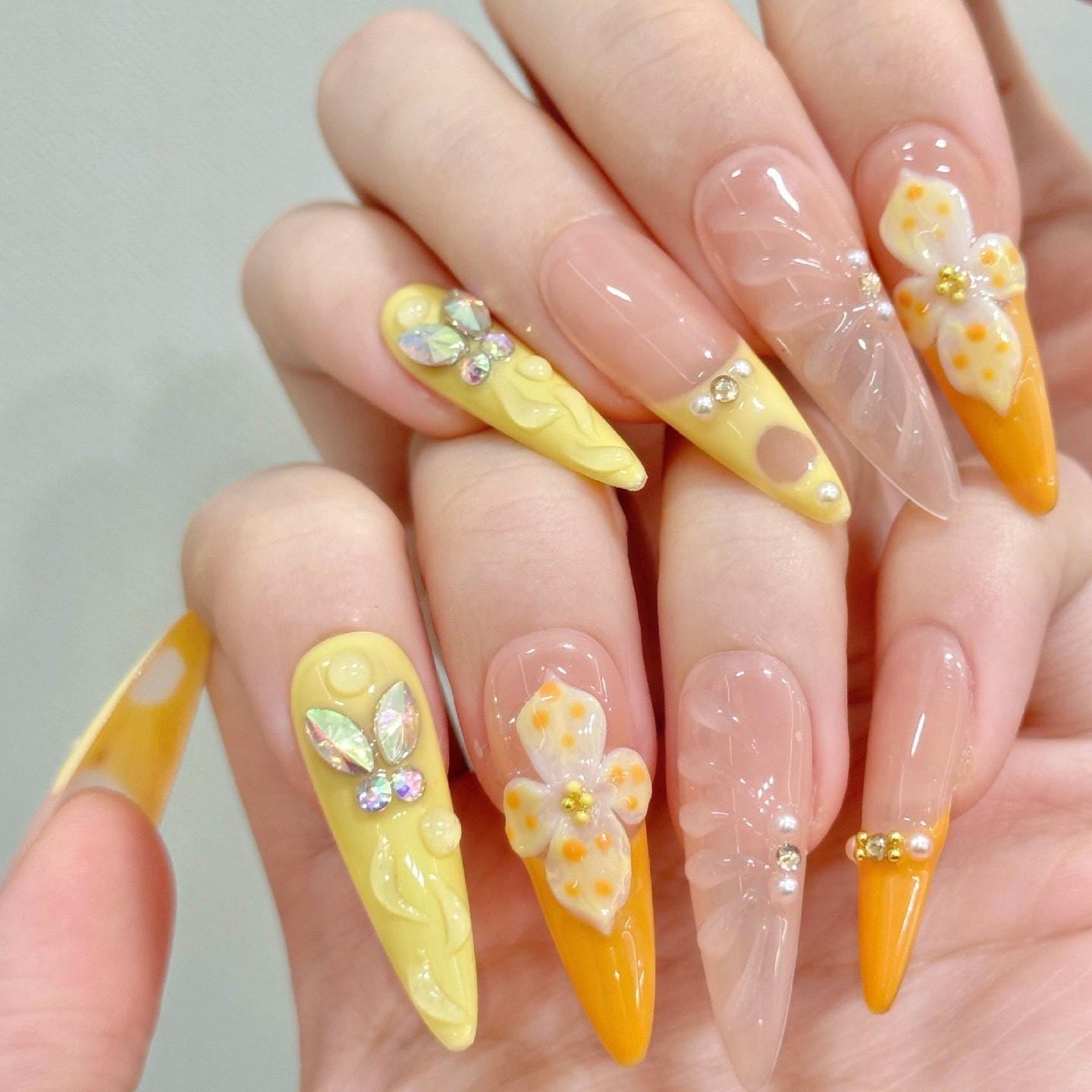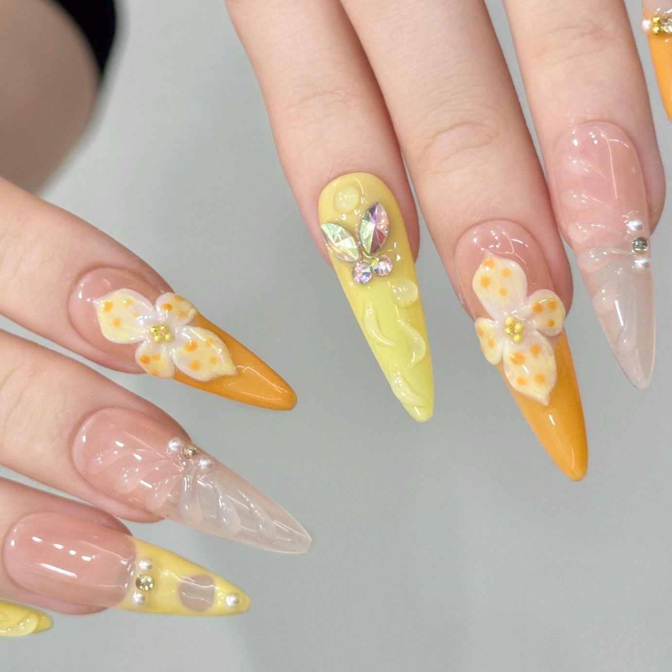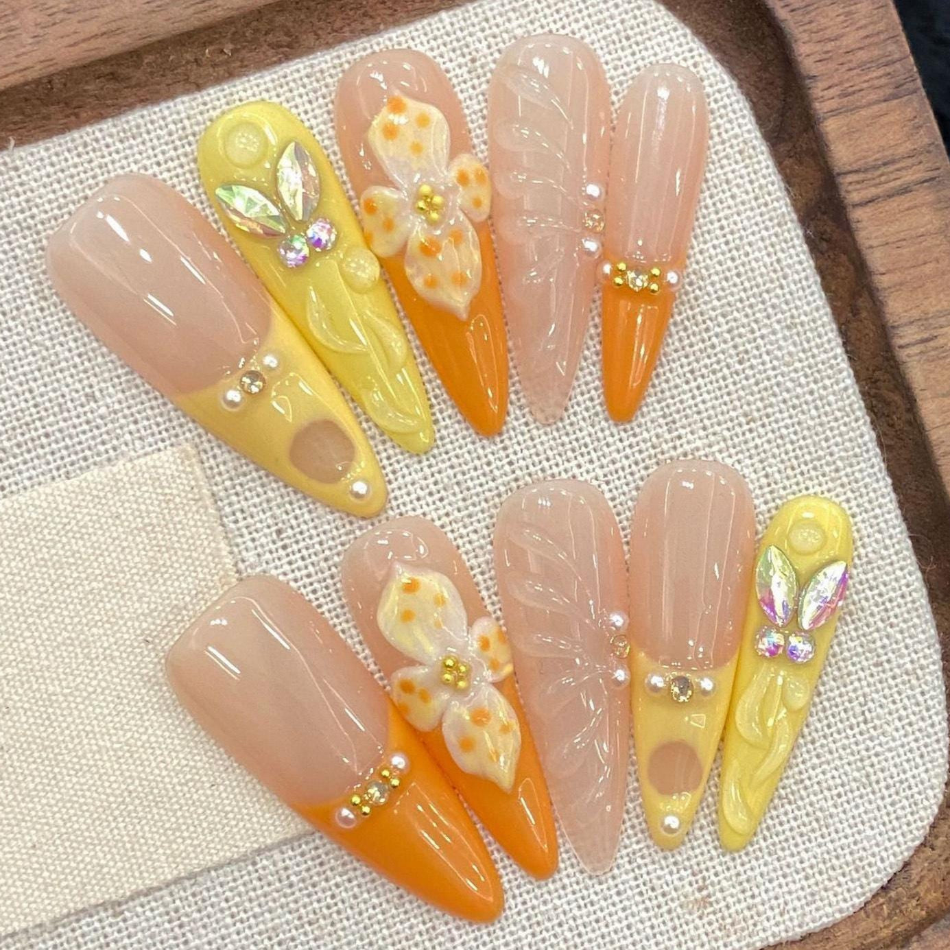 These handmade press-on nails bloom with springtime charm, featuring peachy nudes, citrusy yellow and orange tips, and intricate 3D floral and butterfly accents. Delicate pearl details and sculpted texture add a playful, fairy-inspired finish perfect for sunny vibes.
