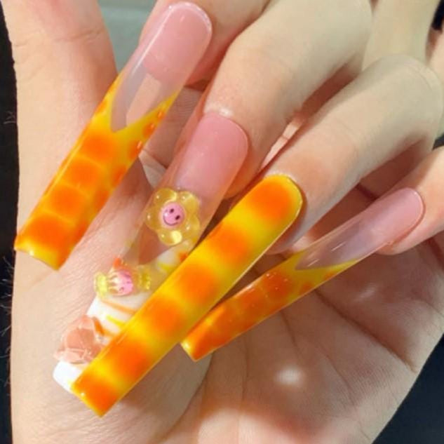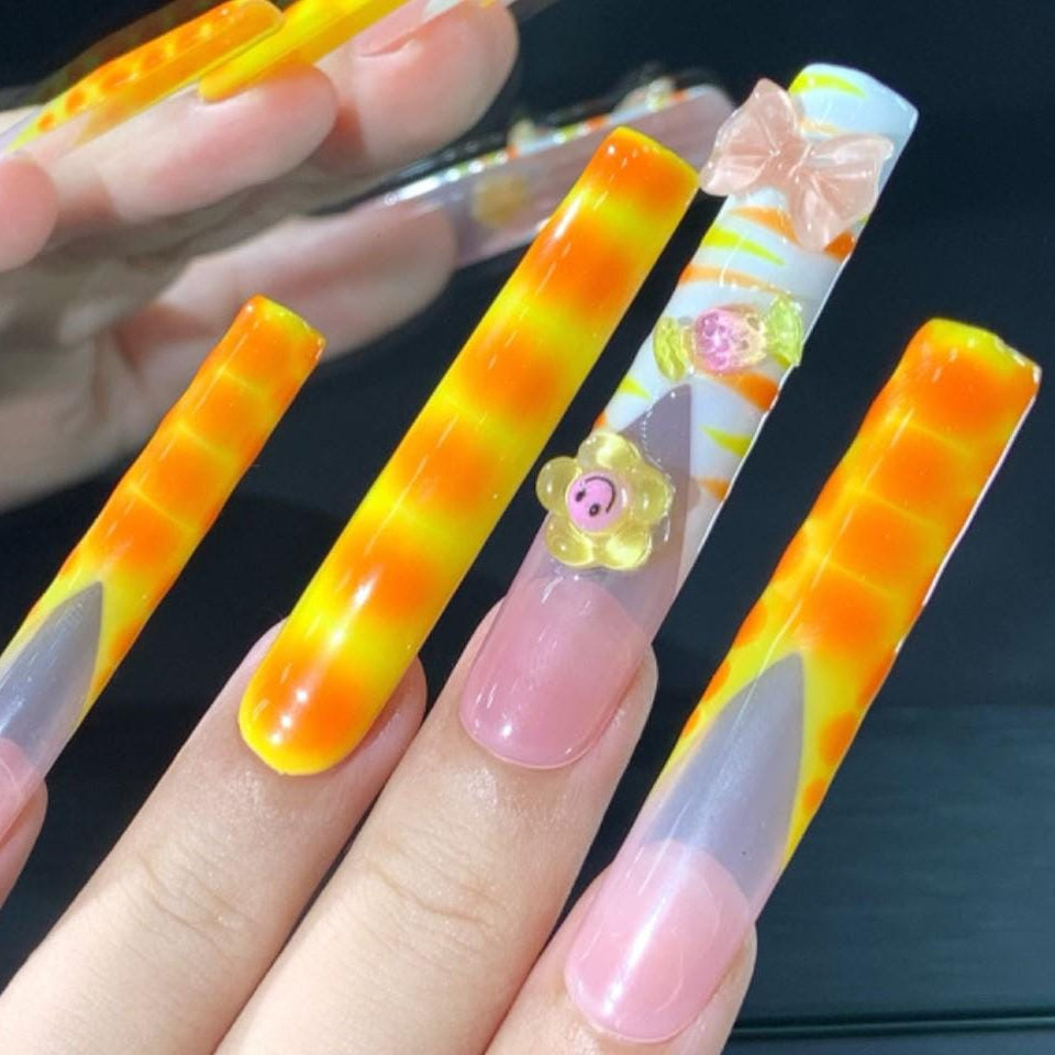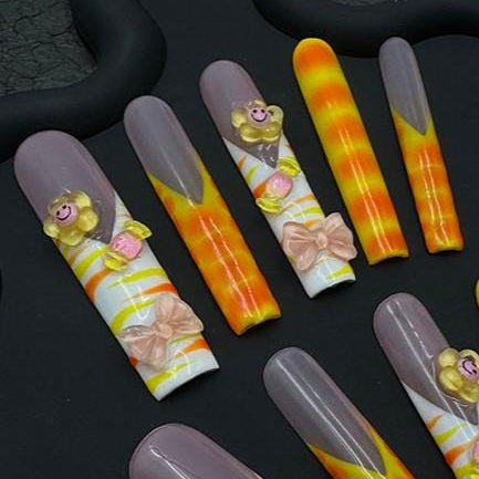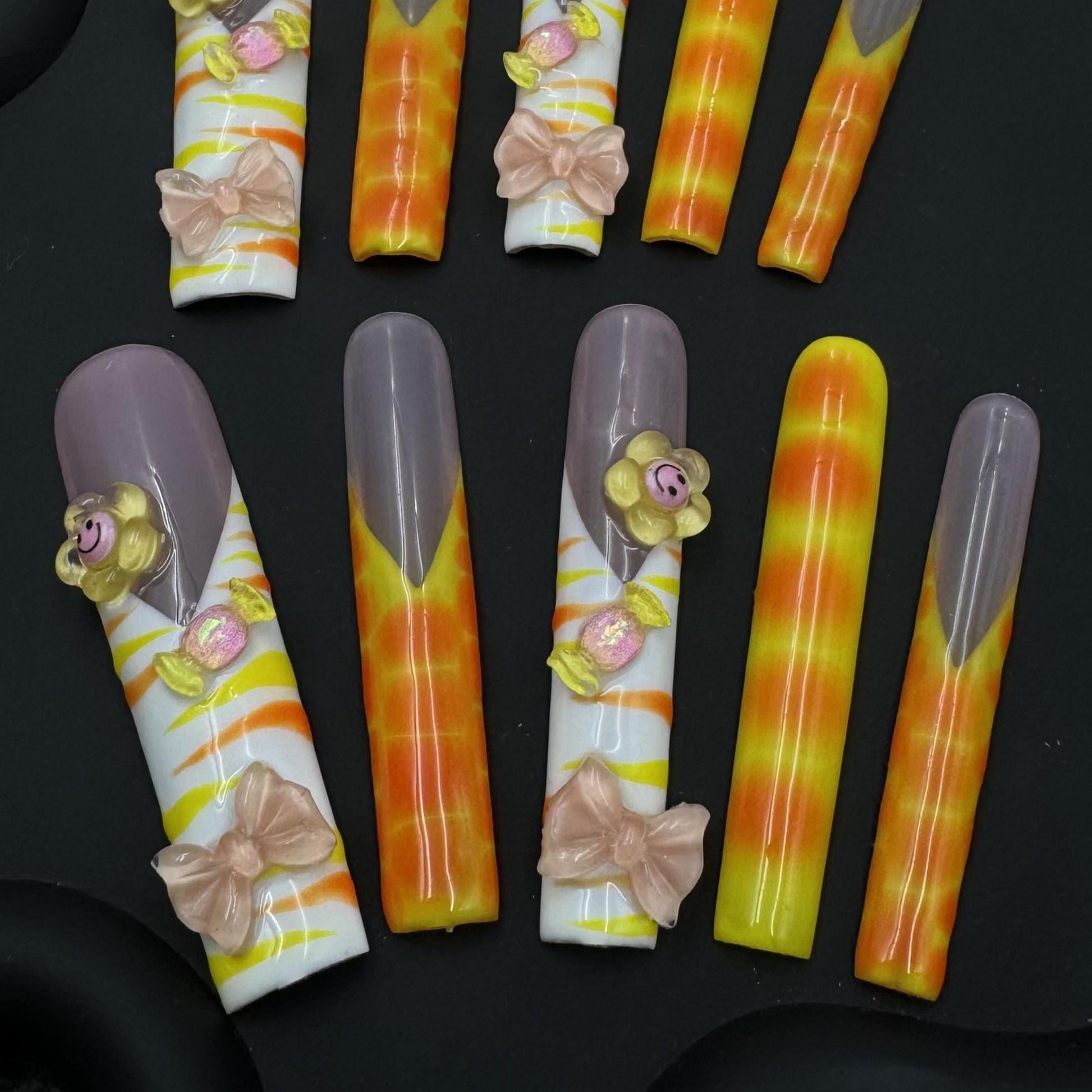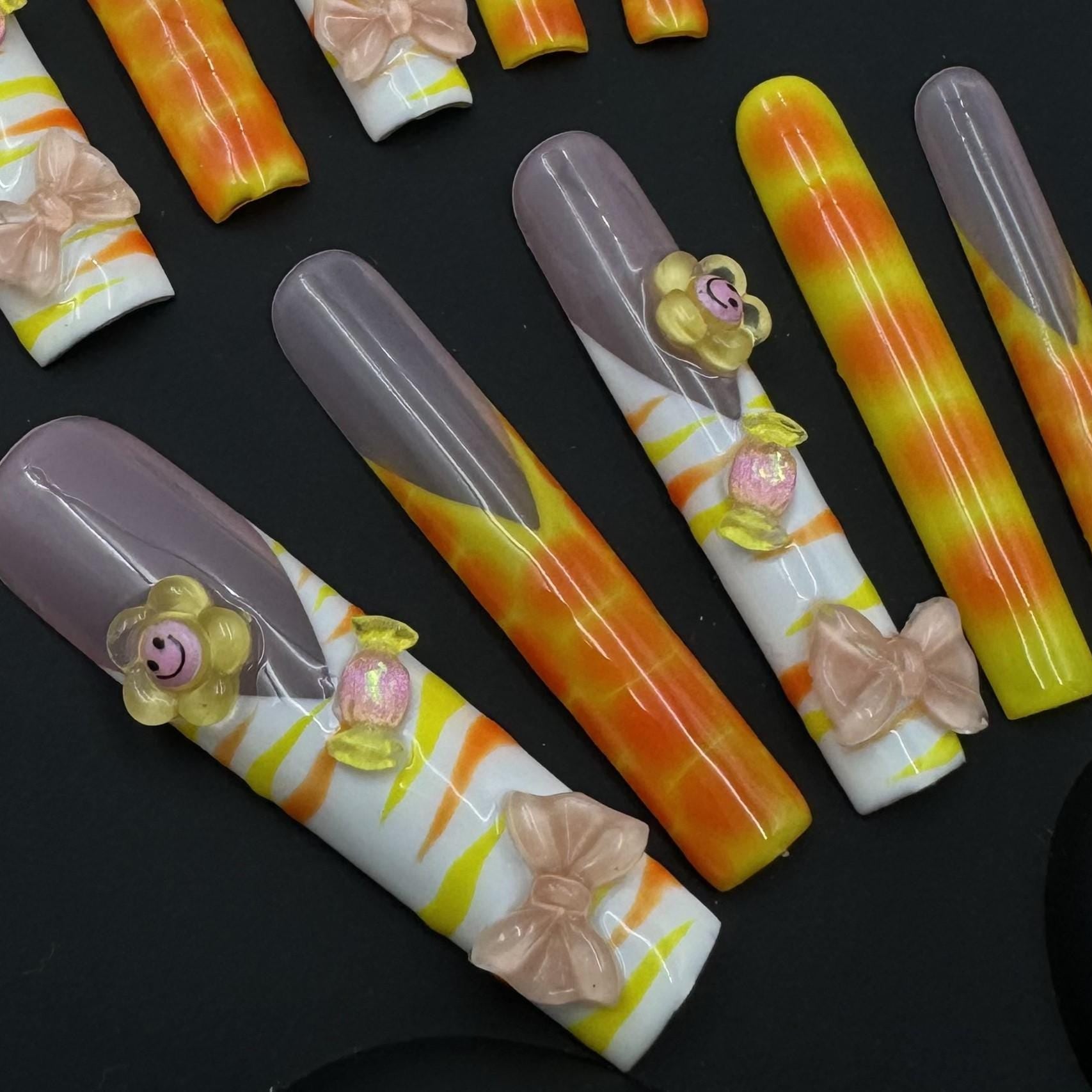 Brighten up your look with this playful press-on nail set featuring gradient orange-yellow flames, soft lilac tips, and candy stripe accents. Complete with adorable 3D charms like teddy bears, pastel bows, and candy pieces, these long nails are bursting with Y2K and kawaii vibes. Perfect for fun-loving fashionistas, party looks, or cute statement styling!