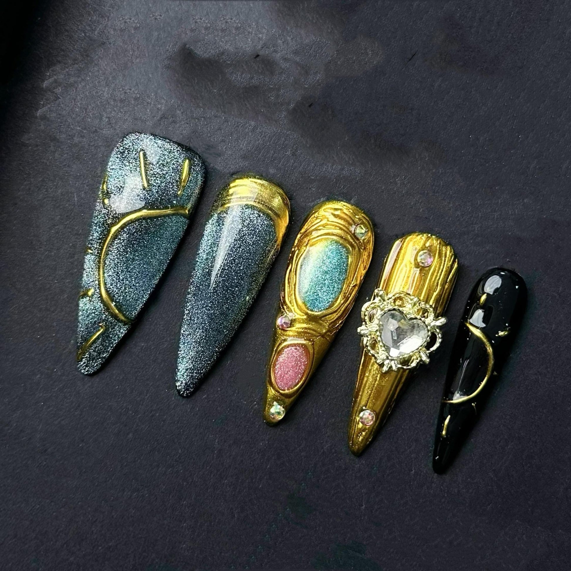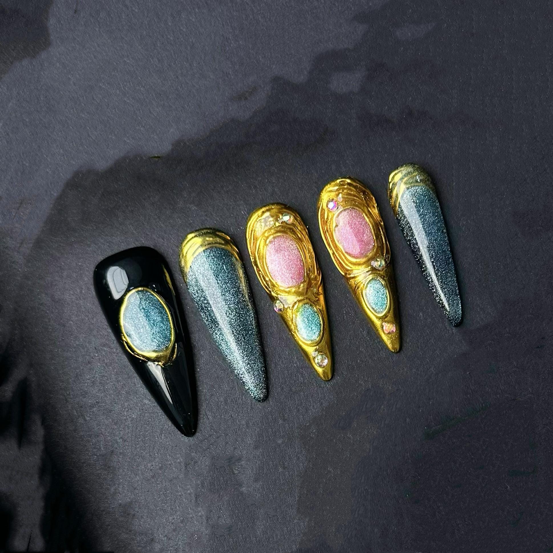Celestial Metallic Galaxy Press-On Nails with Gold Sculpted Detail and Gem Accents. Artificial reusable fake glue on faux manicure nail art.