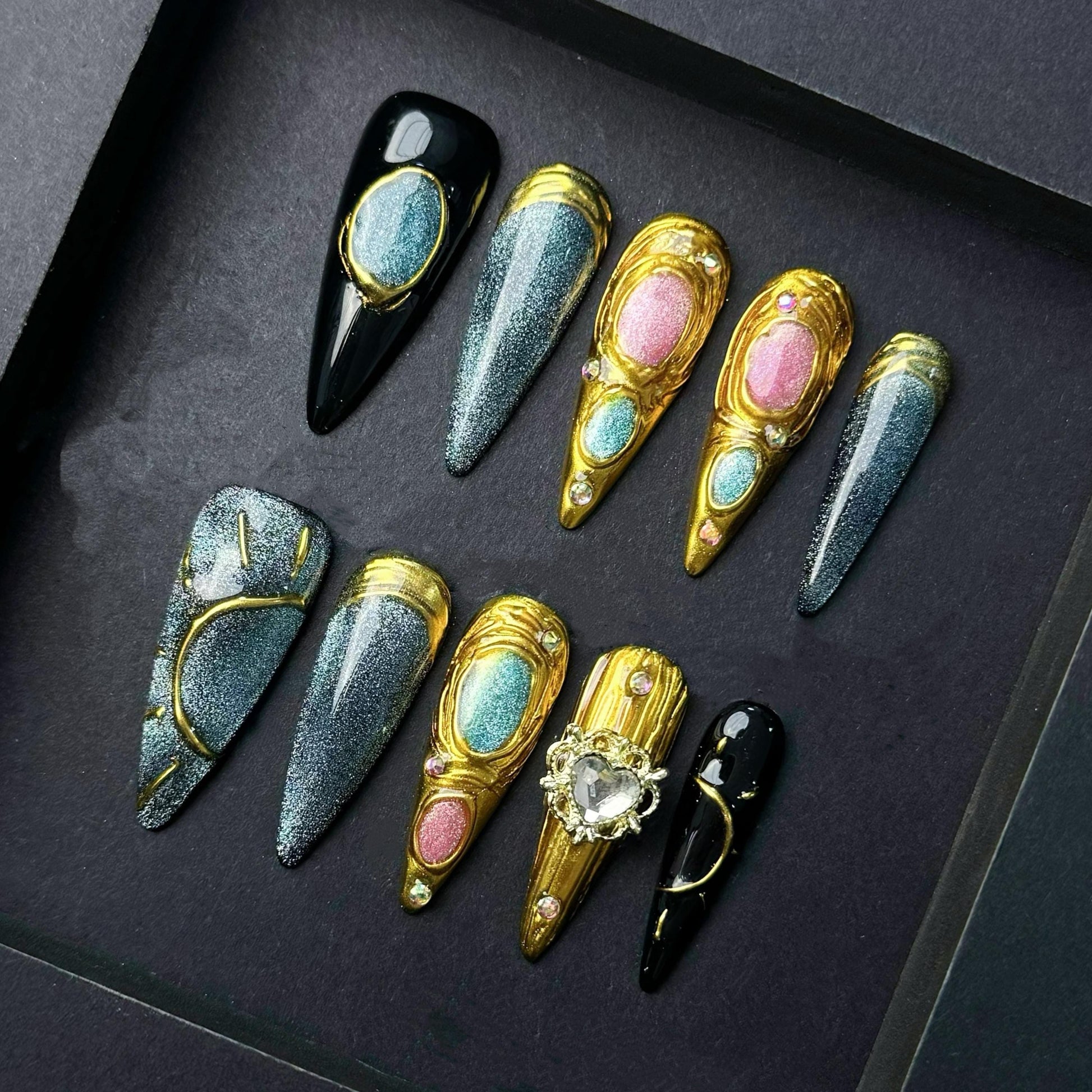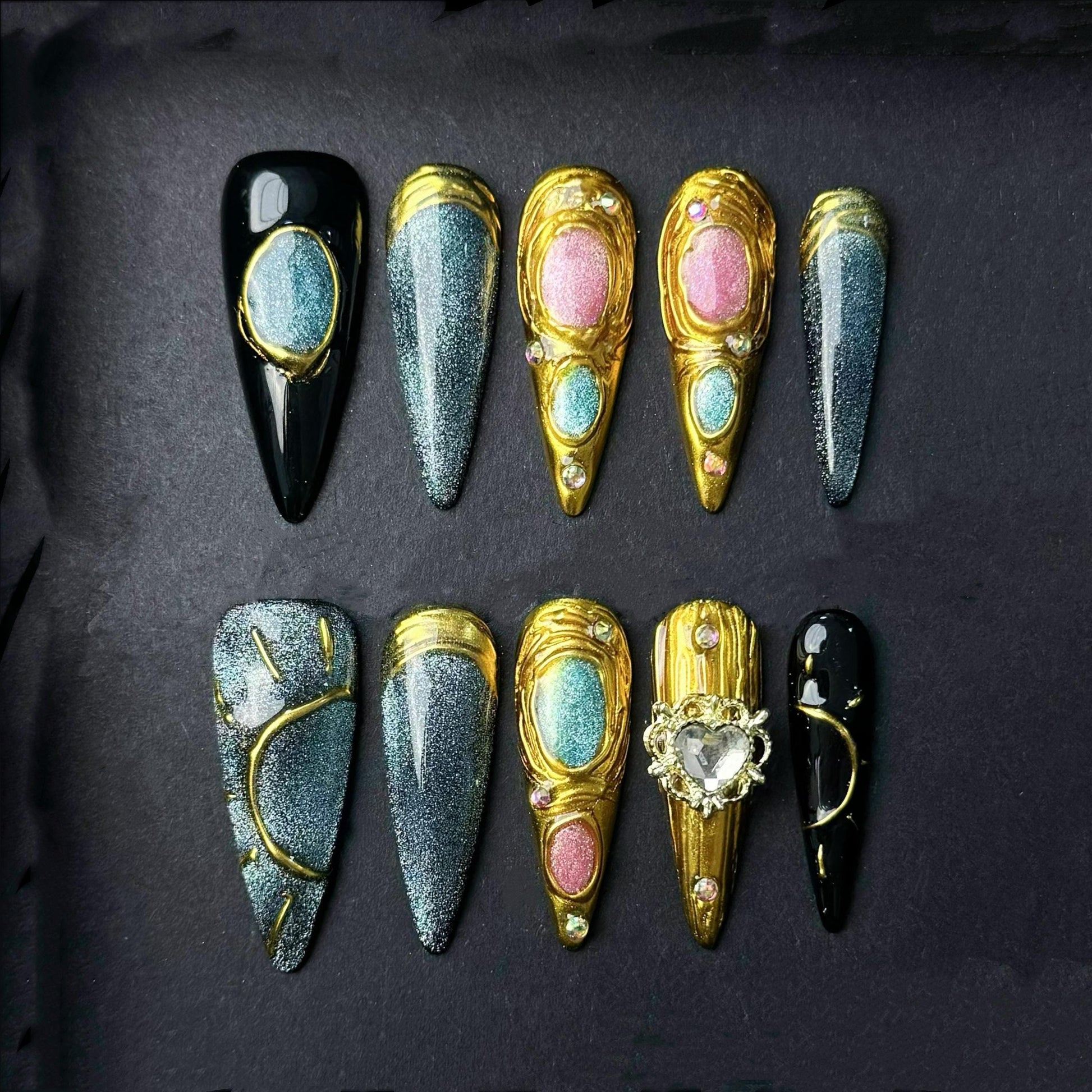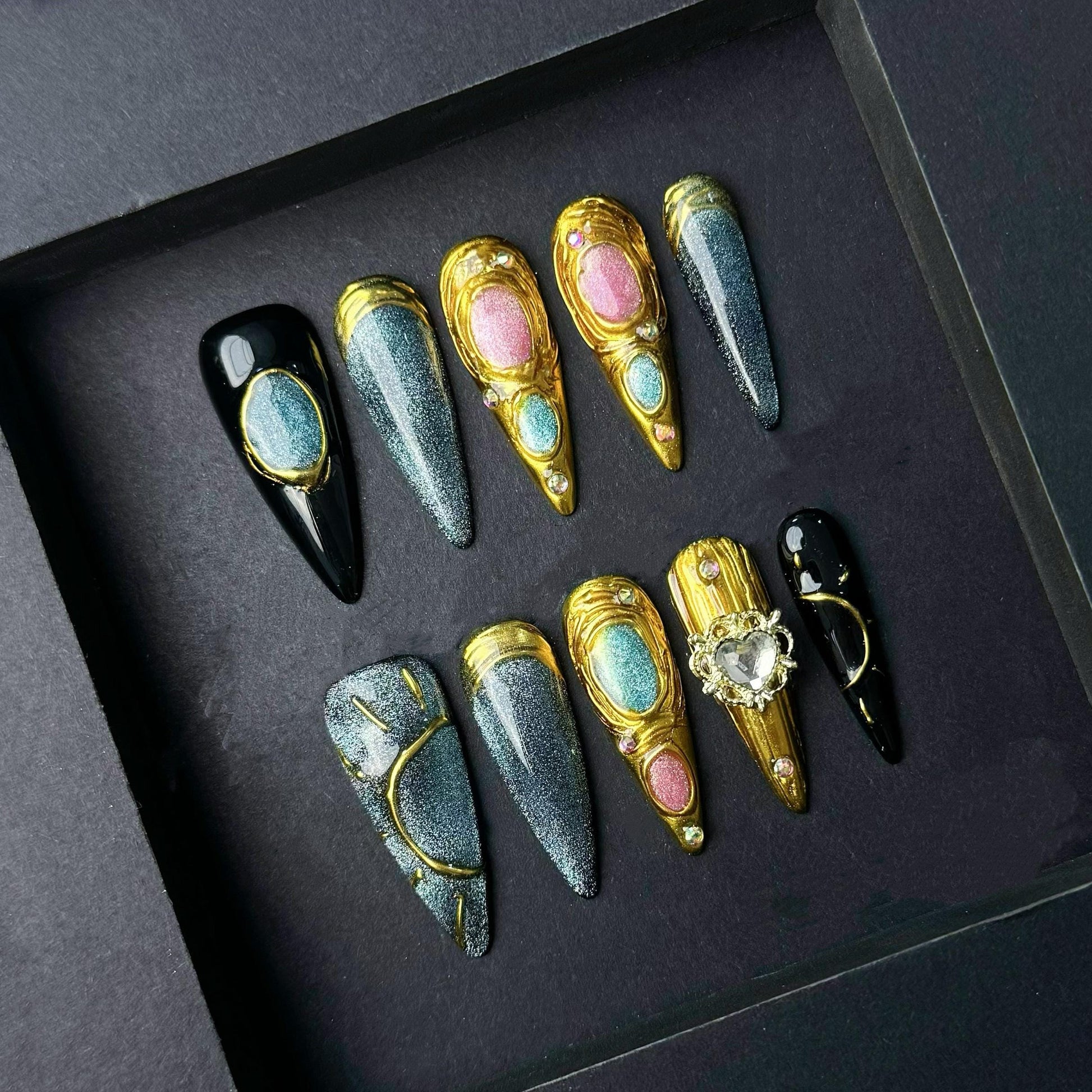 Step into a cosmic dream with this celestial-inspired press-on nail set. Featuring a mesmerizing blend of shimmery galaxy blue and soft cosmic pink encased in molten gold sculpting, each nail resembles a piece of wearable art. Accented with crescent moons, orb-like gems, and one heart-cut crystal centerpiece, the black and gold base tones bring dramatic contrast and lunar luxury. Perfect for stargazers, astrology lovers, or anyone craving a glamorous galactic statement. These nails are reusable and handmade with high-definition sparkle and shine.