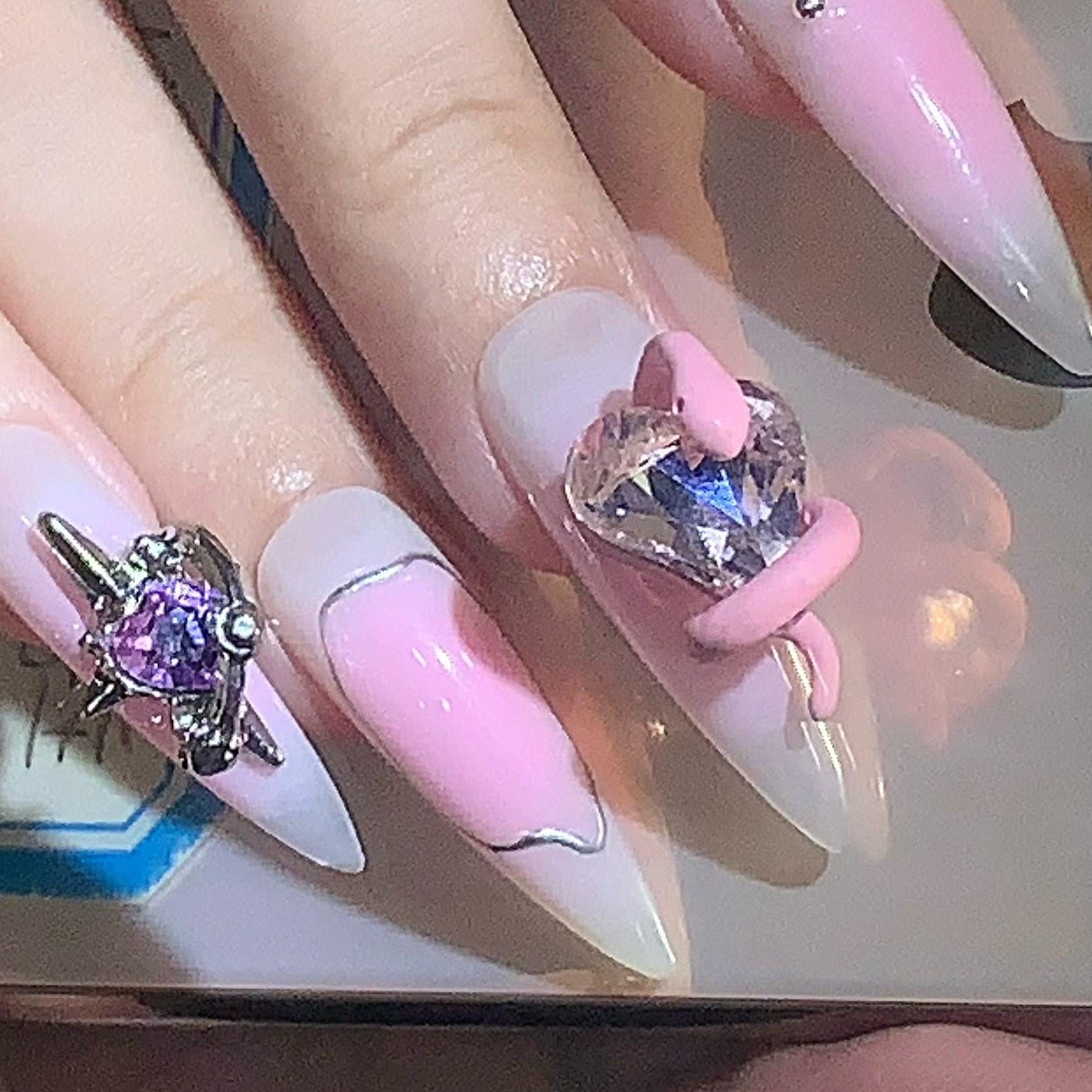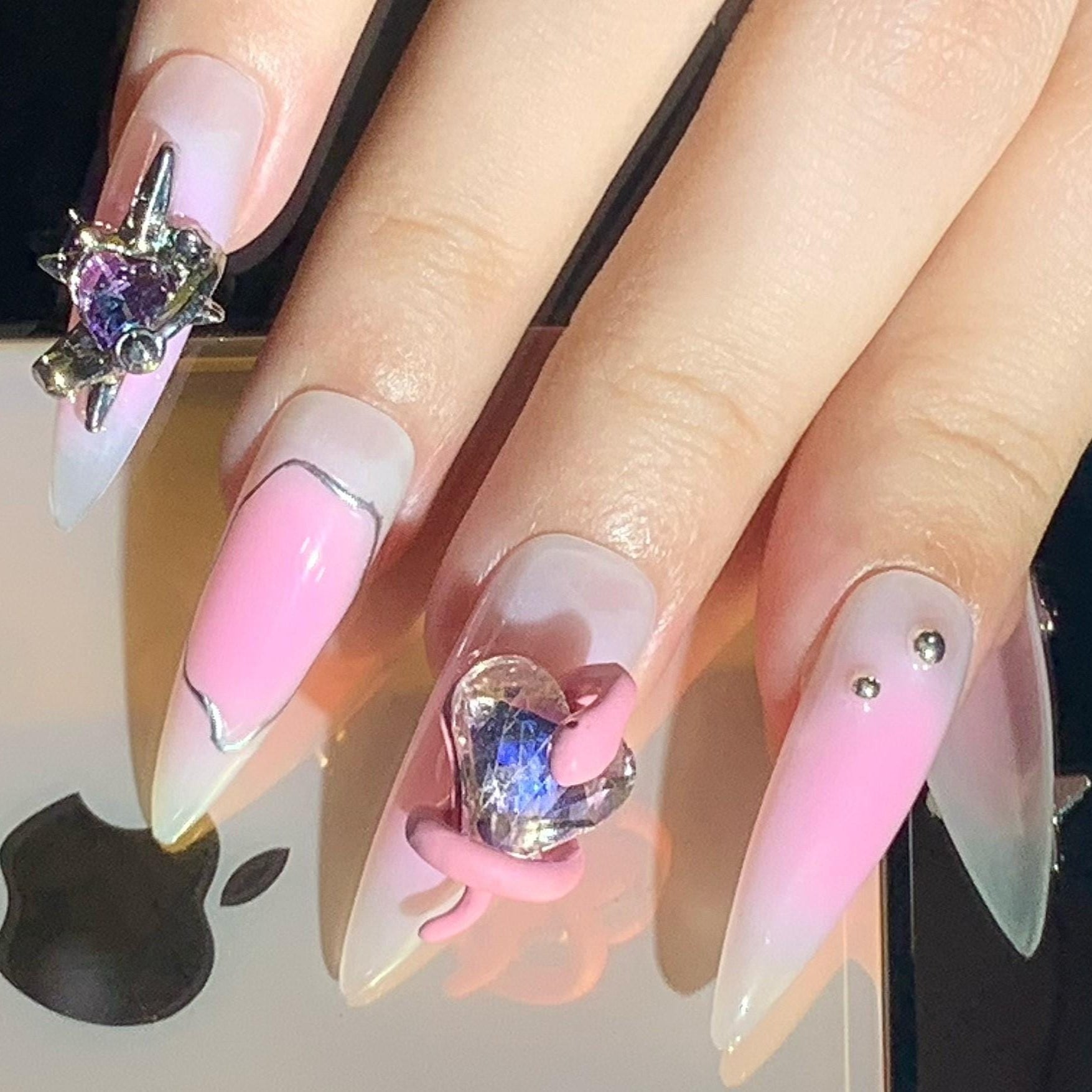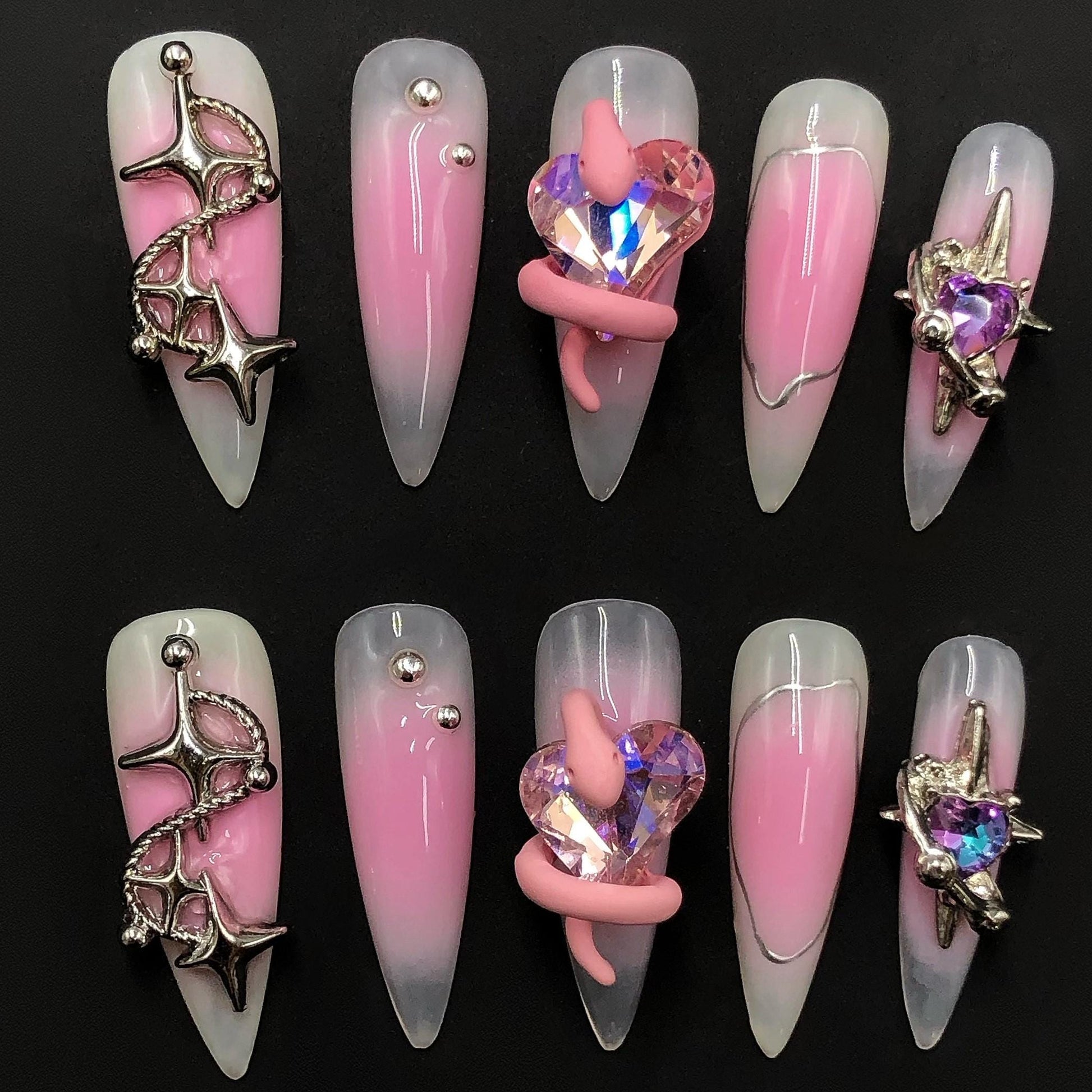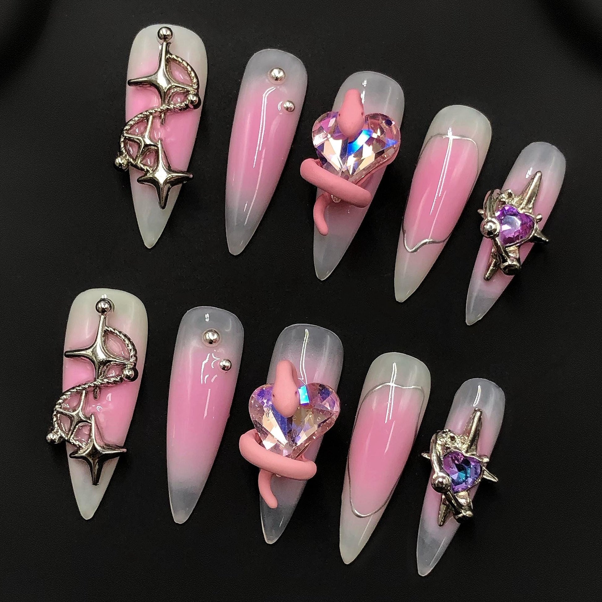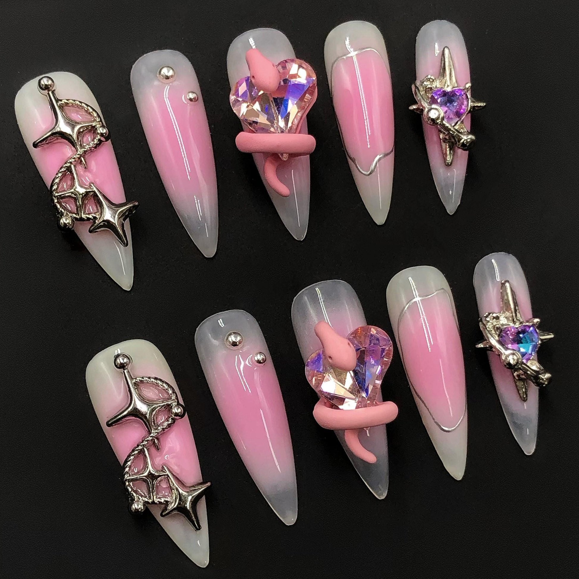 ell with this dreamy fantasy-inspired press-on nail set. Featuring soft pink chrome and milky white ombré tones, the design is elevated with radiant heart gems wrapped in pastel serpents, starry silver constellations, and jeweled spikes. These long stiletto nails blend sweet romance with mystical edge—perfect for celestial babes and fantasy lovers.