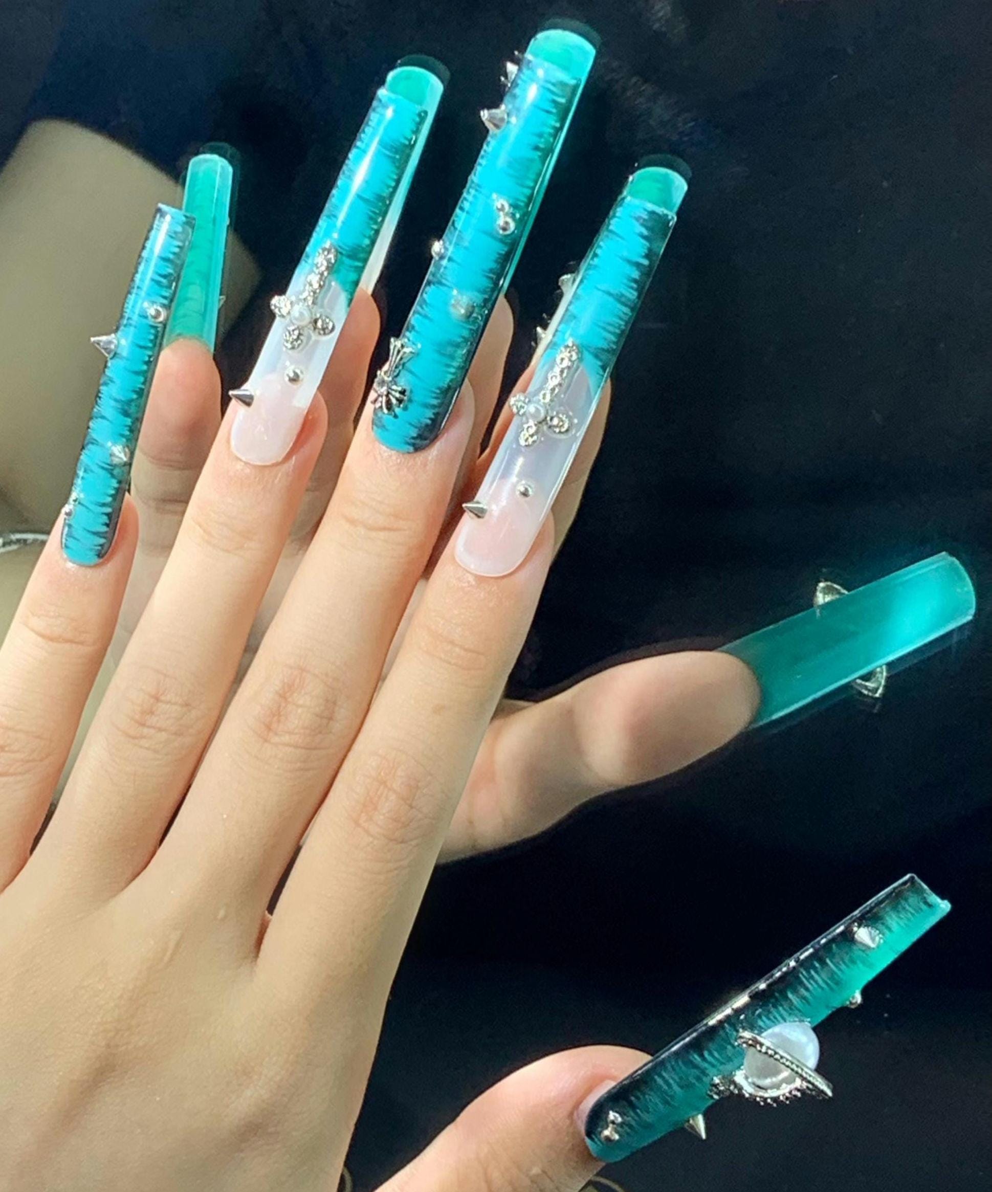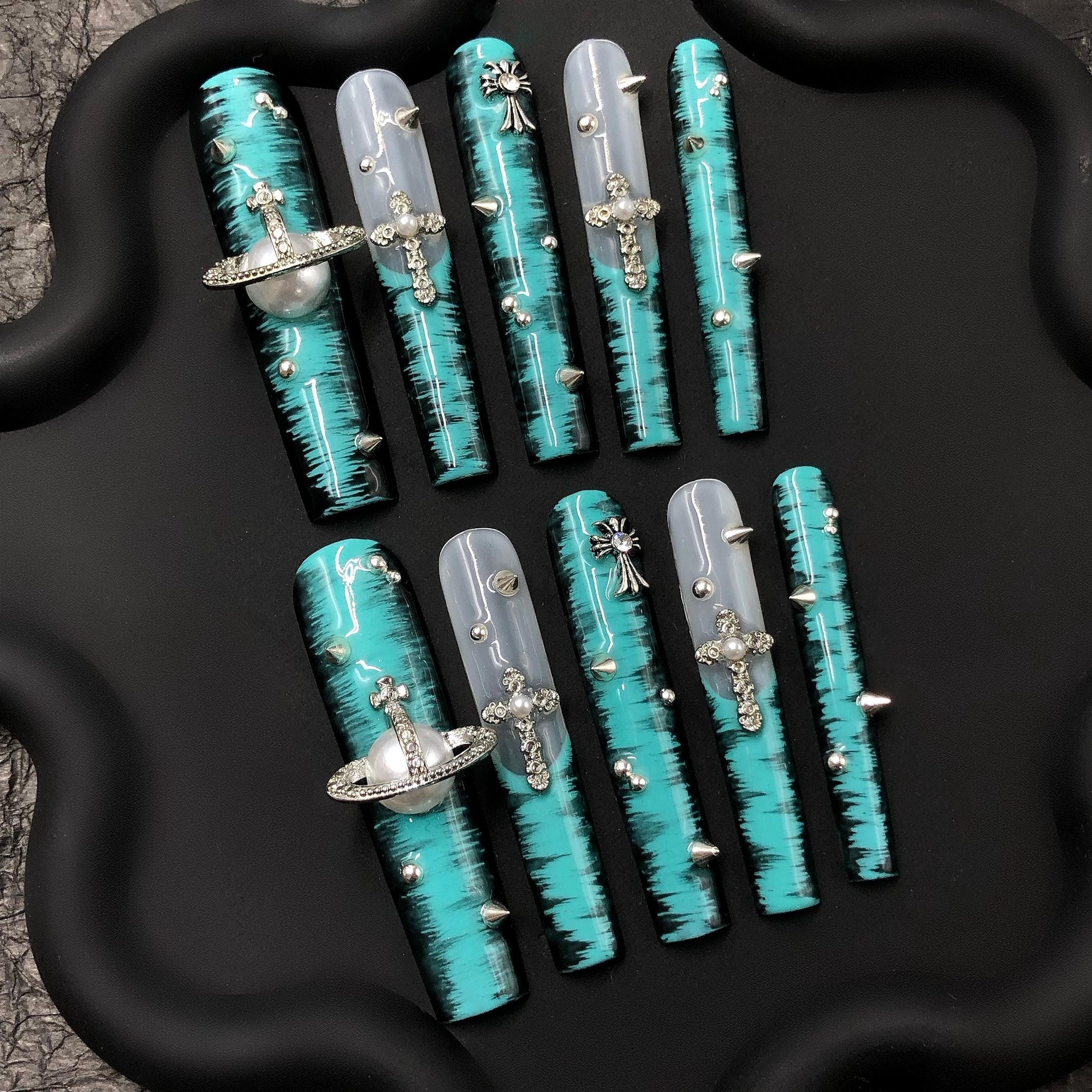 Celestial Teal Galaxy Nails – Long Coffin Press-Ons with Saturn Ring, Starry Cross Charms & Cosmic Spikes gothic glam nails punk rock nails
