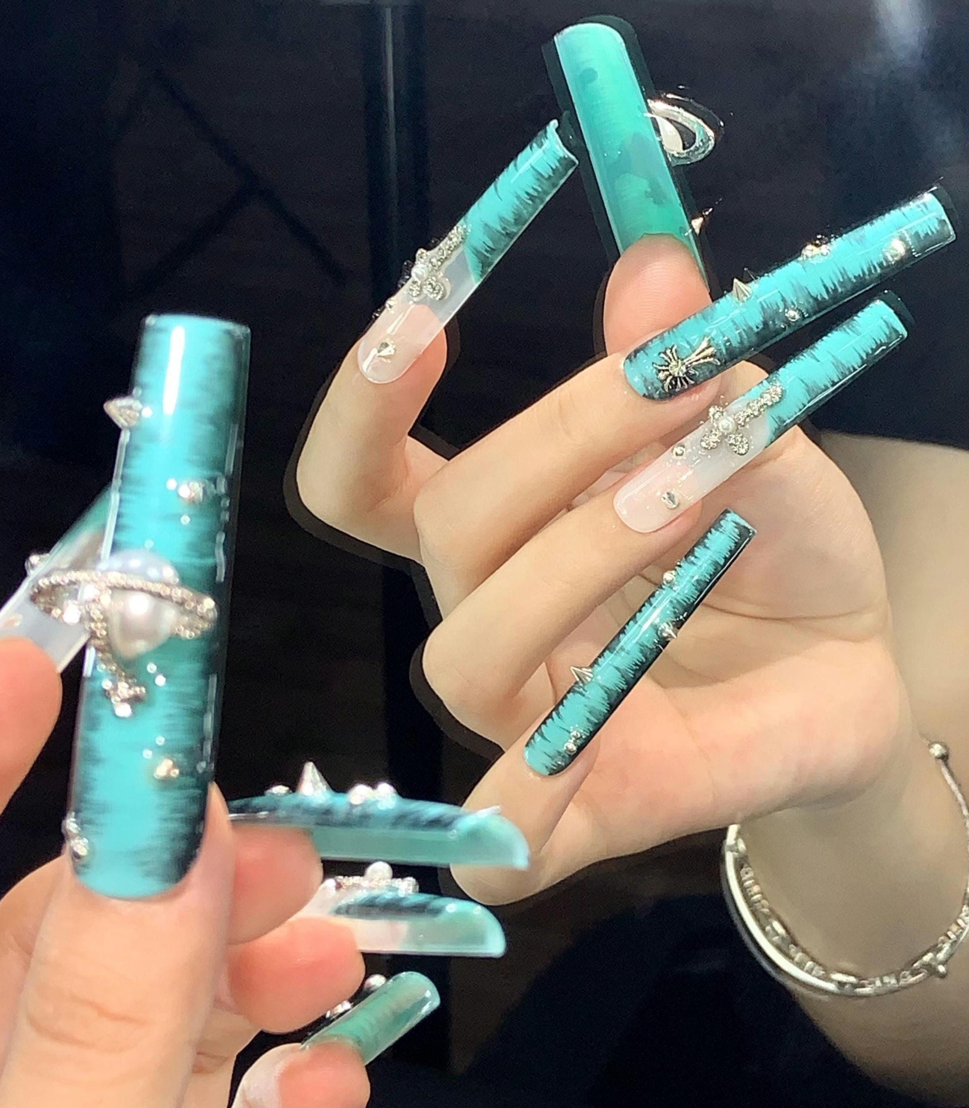 Channel cosmic energy with these celestial-inspired teal galaxy nails. Designed with a shimmering, brushstroke nebula effect, this long coffin set features stunning 3D details—sparkling star crosses, metallic spikes, radiant pearls, and an iconic Saturn ring charm. Each nail feels like a piece of the cosmos, making this set perfect for stargazers, moonlit nights, or anyone drawn to the mystic and the bold. Ethereal meets edgy in this one-of-a-kind design—handmade and reusable for out-of-this-world beauty.