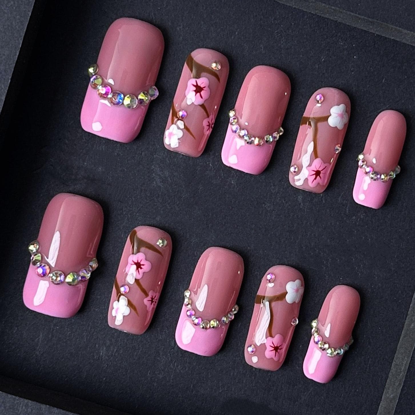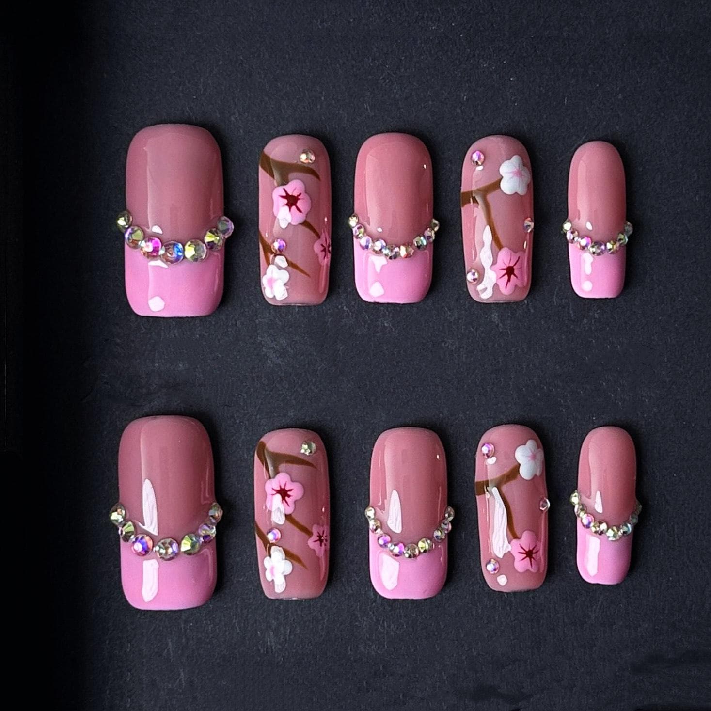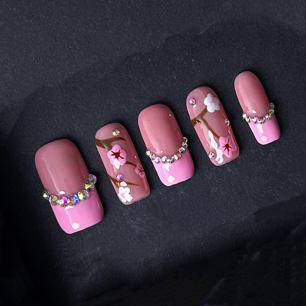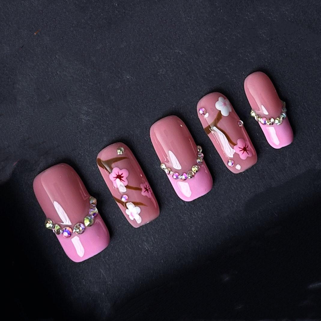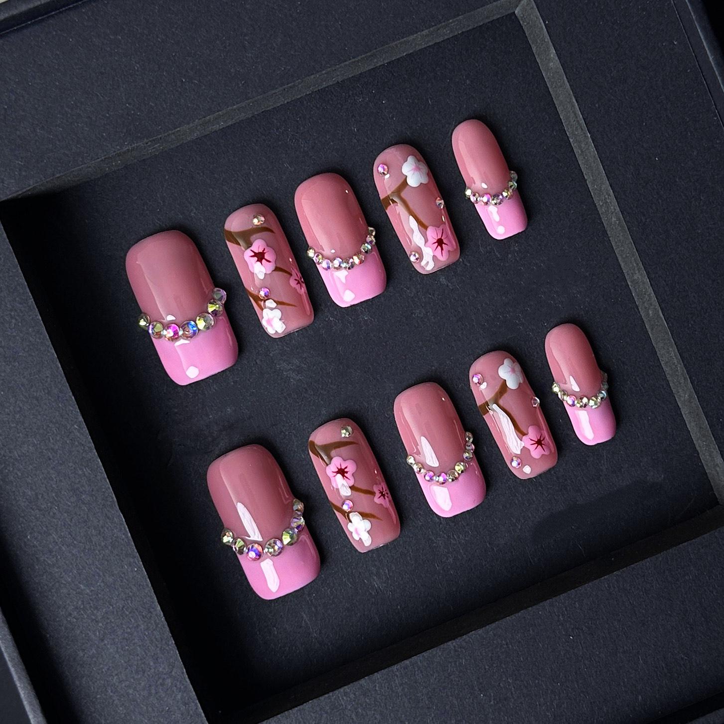 Cherry Blossom Rhinestone Press On Nails in Mauve and Pink Gradient Artificial reusable fake glue on faux manicure nails trendy art