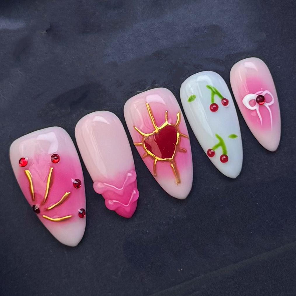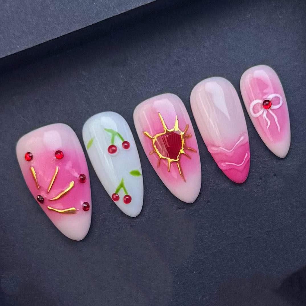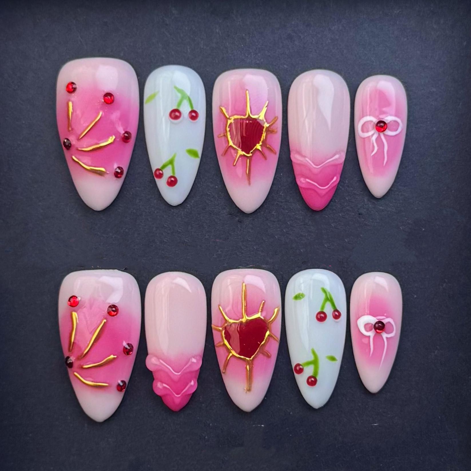 Add a touch of sweetness and edge with these cherry heart pink press on nails Featuring hand painted cherries shimmering red rhinestones delicate pink bows and a bold broken heart gold accent these almond shaped nails are perfect for a girly yet edgy style Great for special occasions casual wear or a fun date night look Handmade with love for a flawless glossy finish