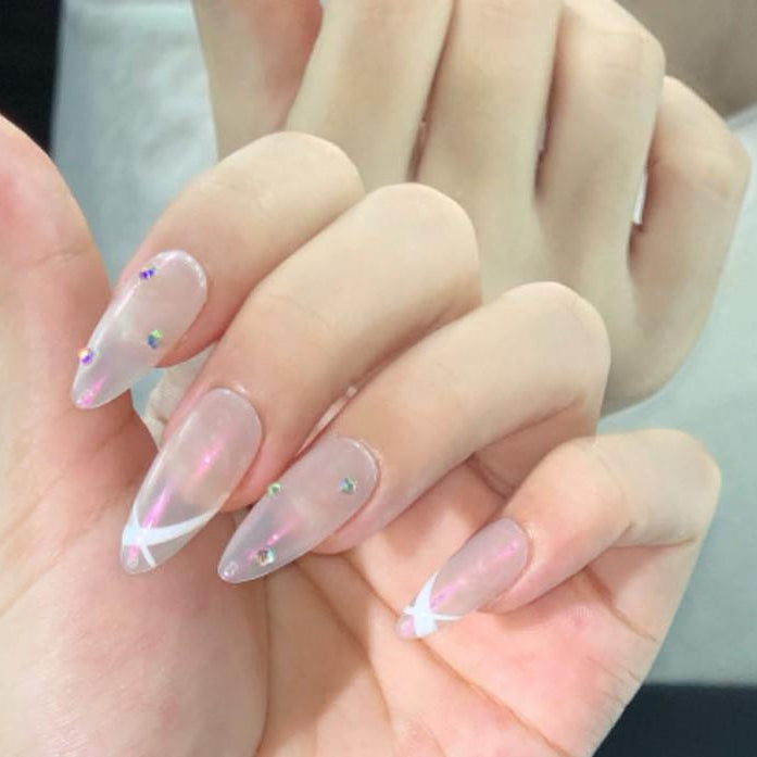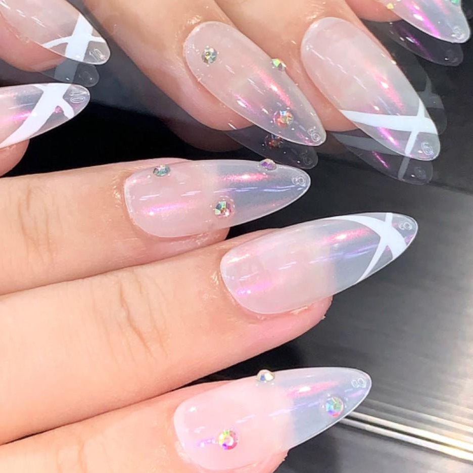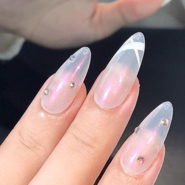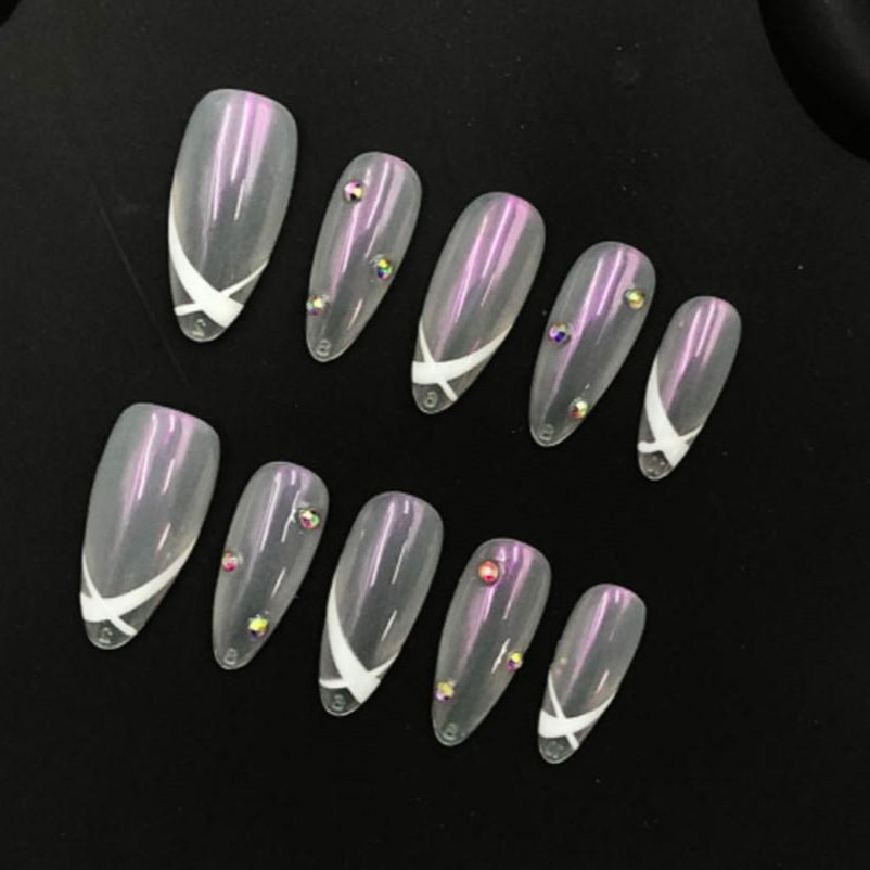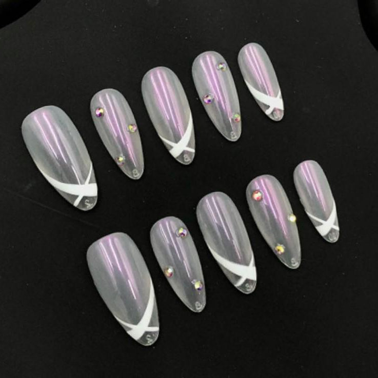 Elevate your style with these sleek iridescent press-on nails featuring a bold white X design and sparkling rhinestone accents. A perfect blend of modern and minimalistic elegance for any occasion.