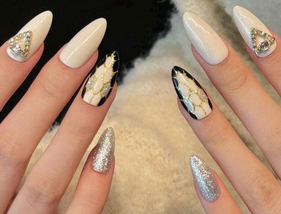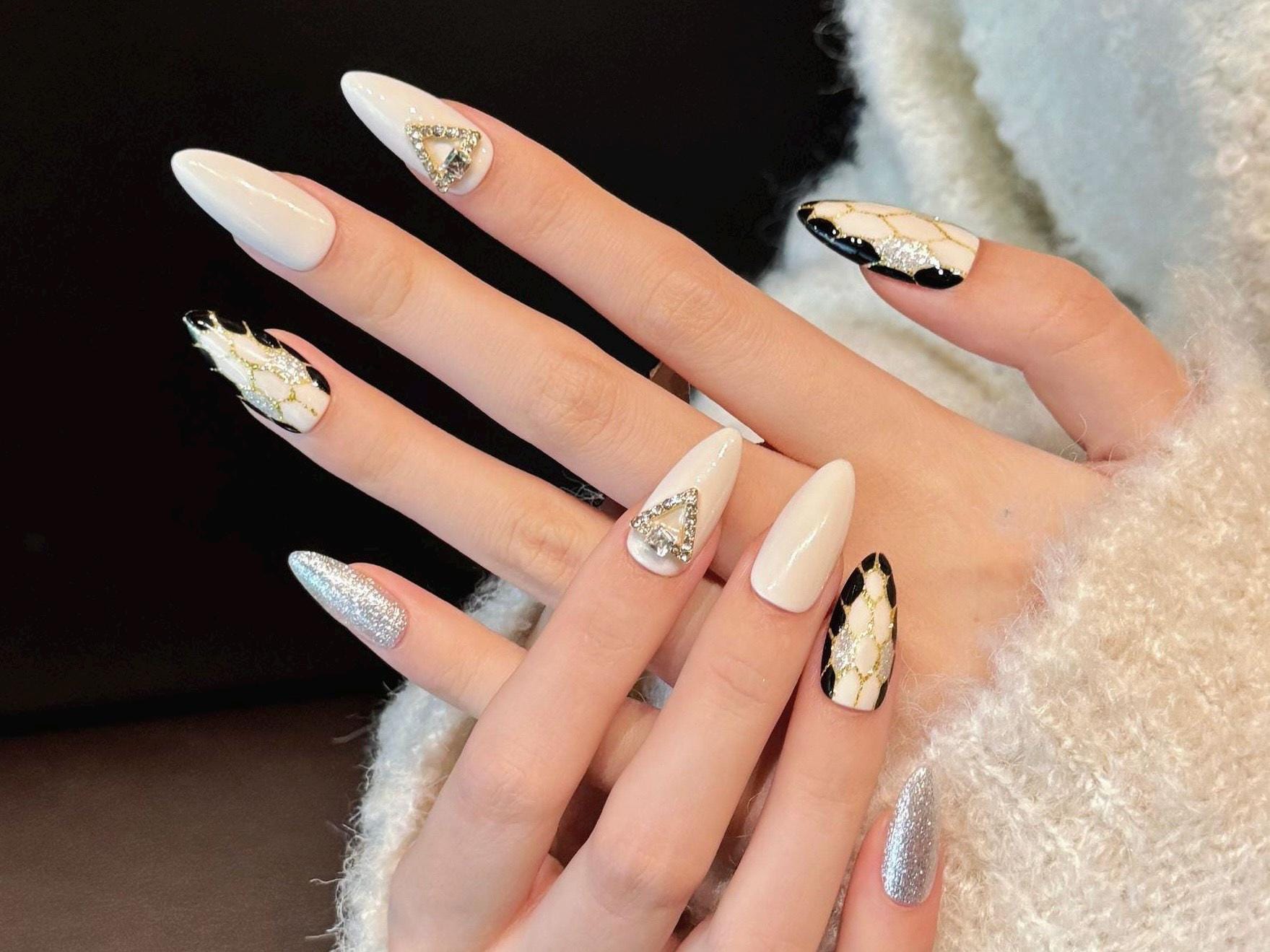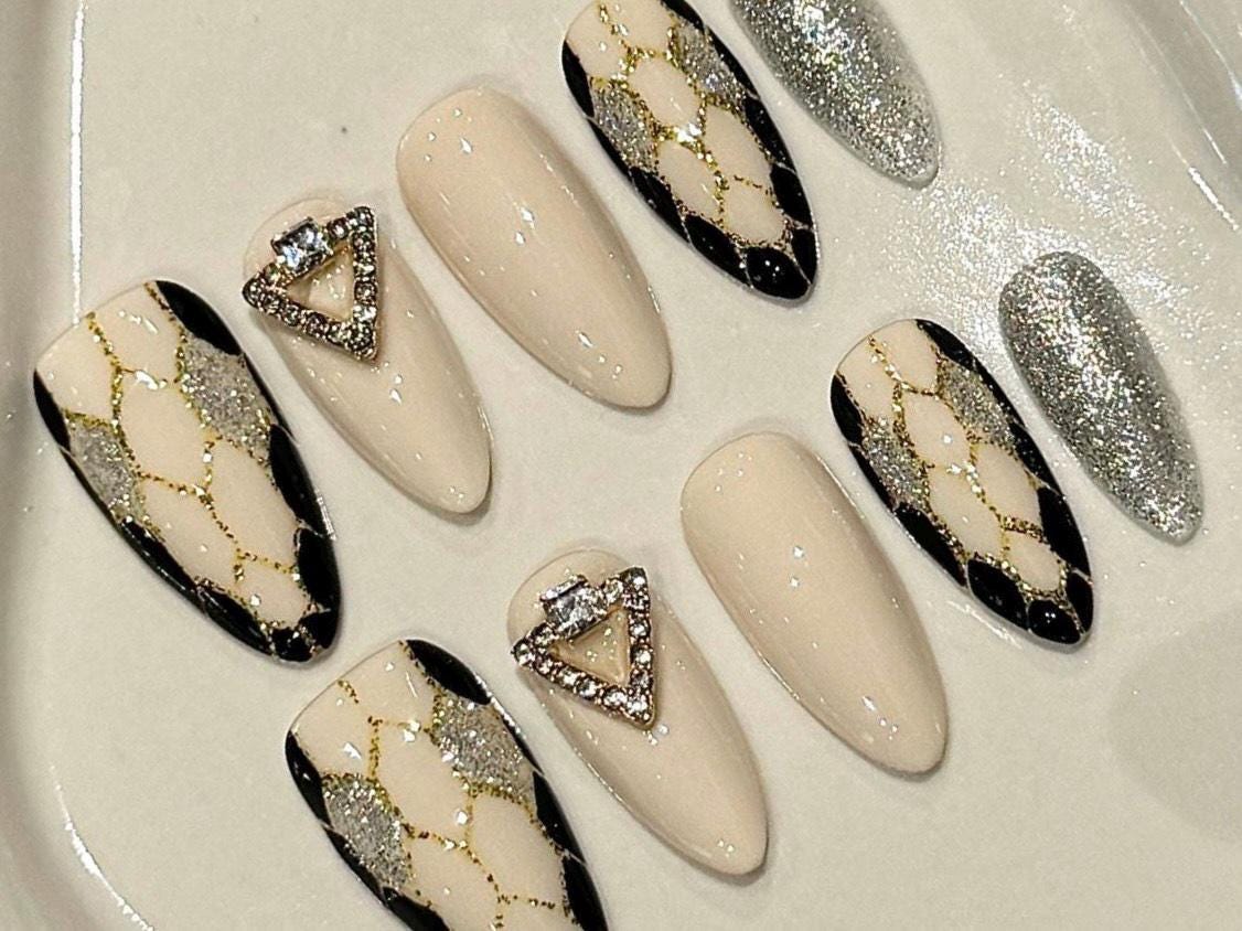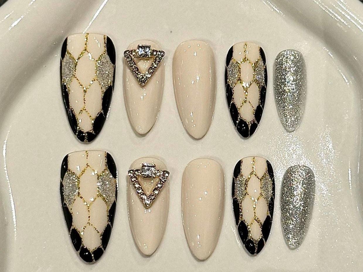 These luxurious press-on nails feature a classy nude base with black and gold lattice detailing, bold silver glitter accents, and a standout rhinestone triangle charm for a touch of elegance. Designed in a medium almond shape, this set combines modern sophistication with high-glam flair—perfect for special events, parties, or elevating everyday style. Reusable, durable, and handmade with care for a flawless salon-quality finish at home.
