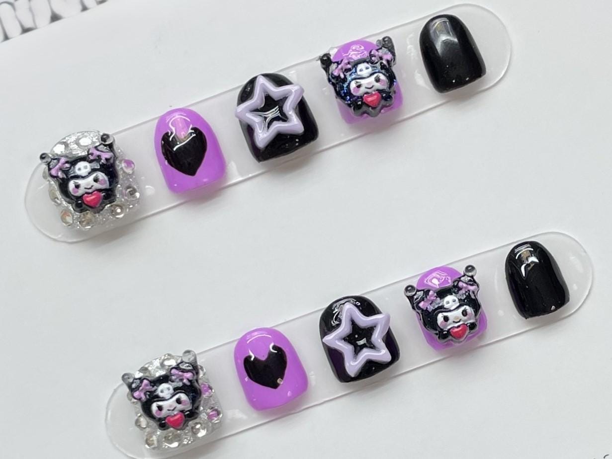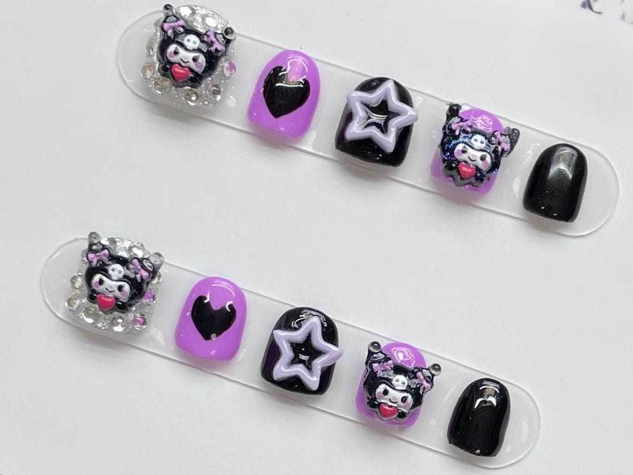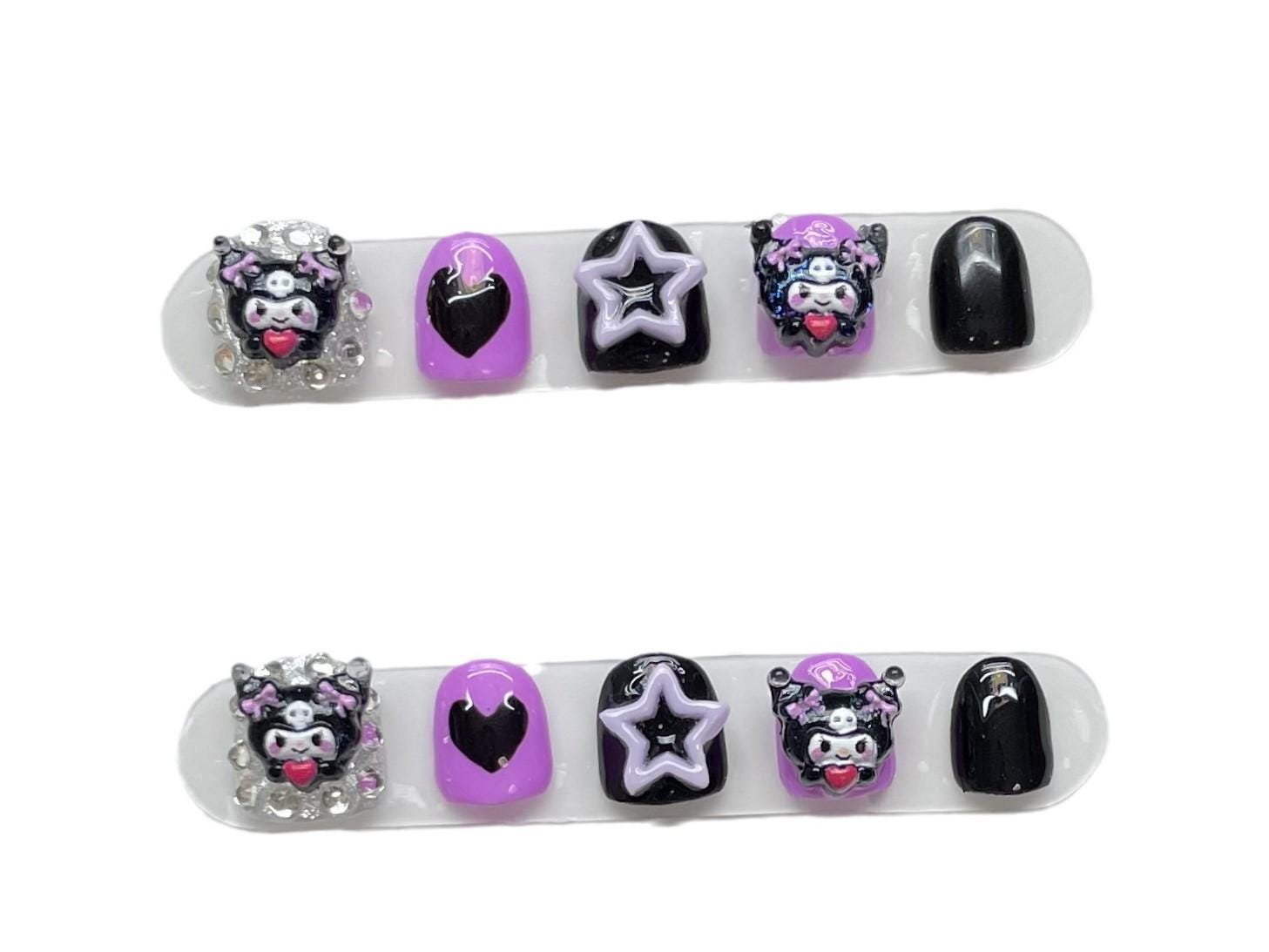 Child nails Gothic Kawaii Kuromi Press-On Nails – 3D Star & Heart Charm Set glue on bold purple cosplay artificial nails handmade nail art