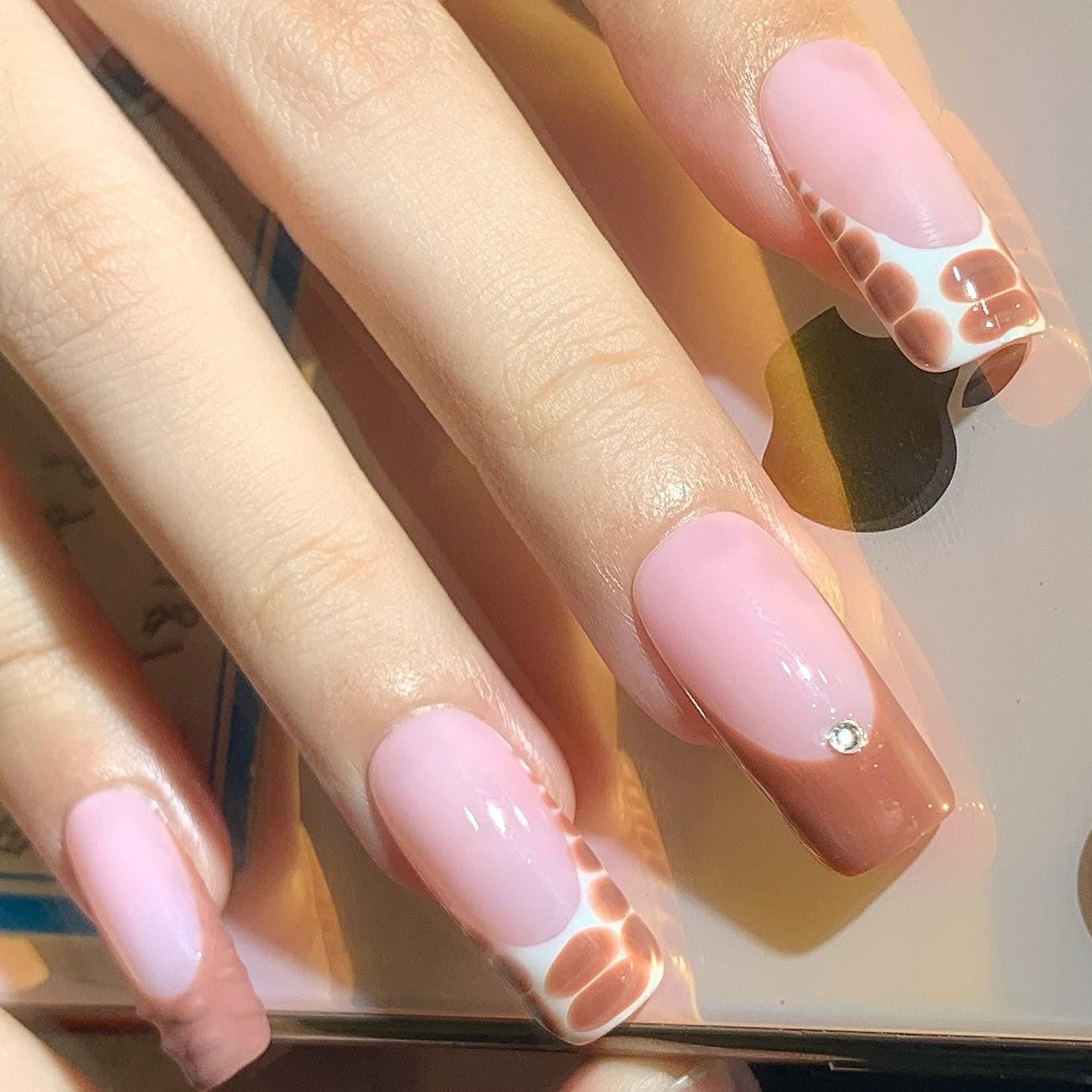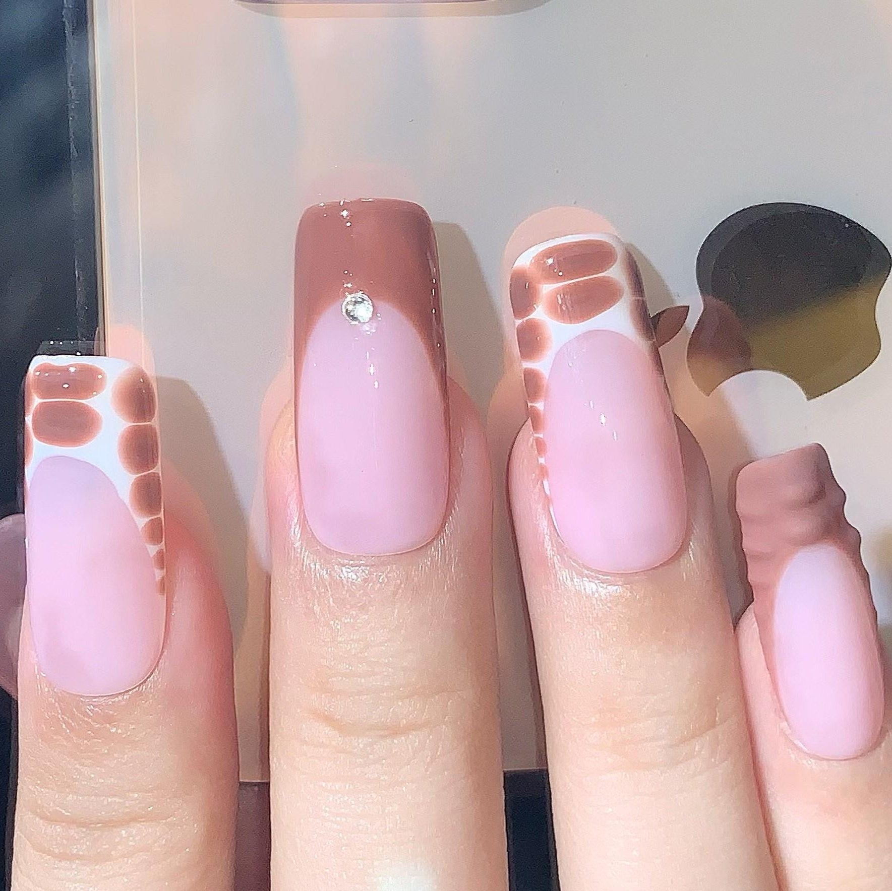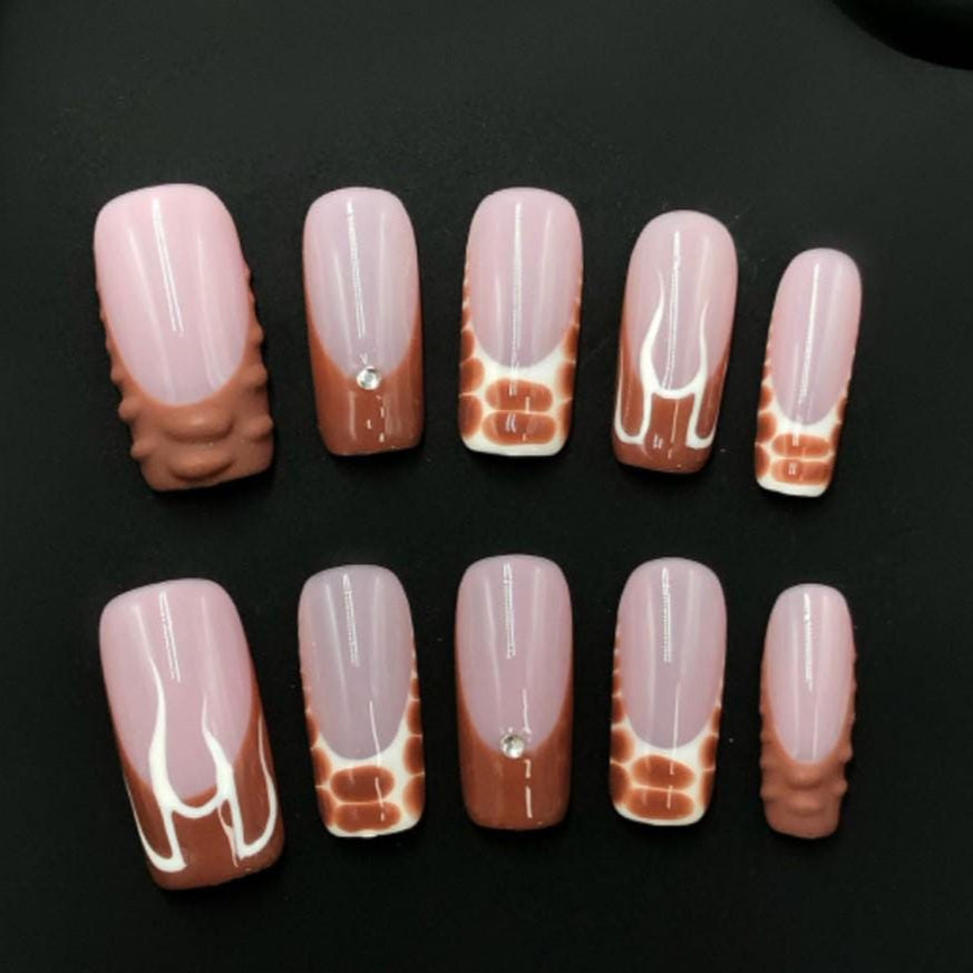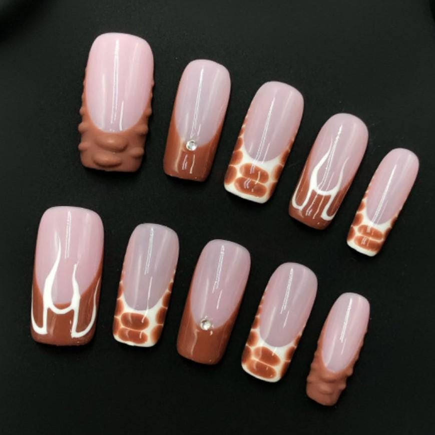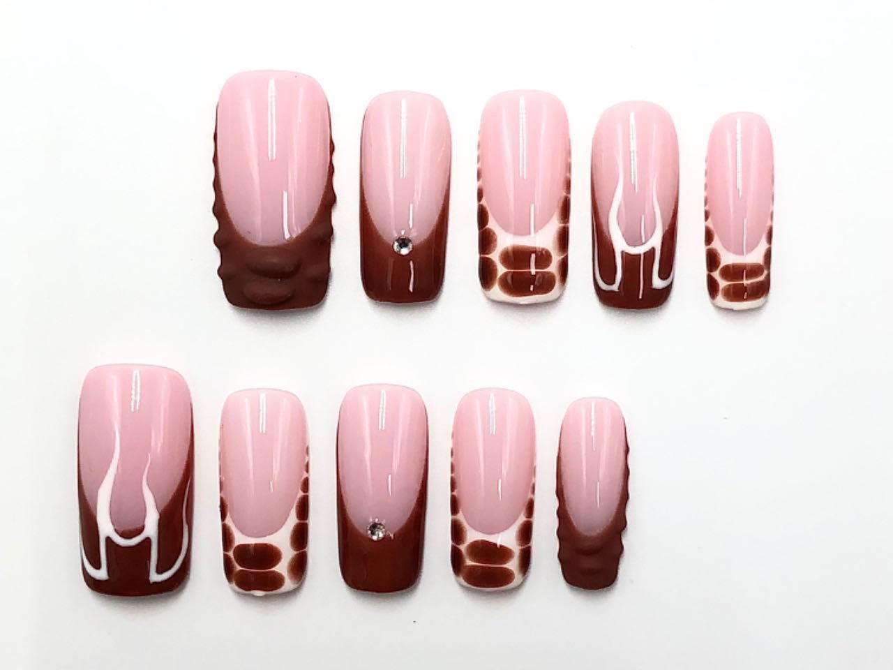 Indulge your sweet side with this chic chocolate-inspired press-on nail set, featuring a glossy nude base paired with brown sculpted drips, abstract swirls, and textured cocoa patterns. Finished with a touch of rhinestone sparkle, these stylish nails are perfect for dessert lovers, fashionistas, and anyone craving a cozy-cool aesthetic.