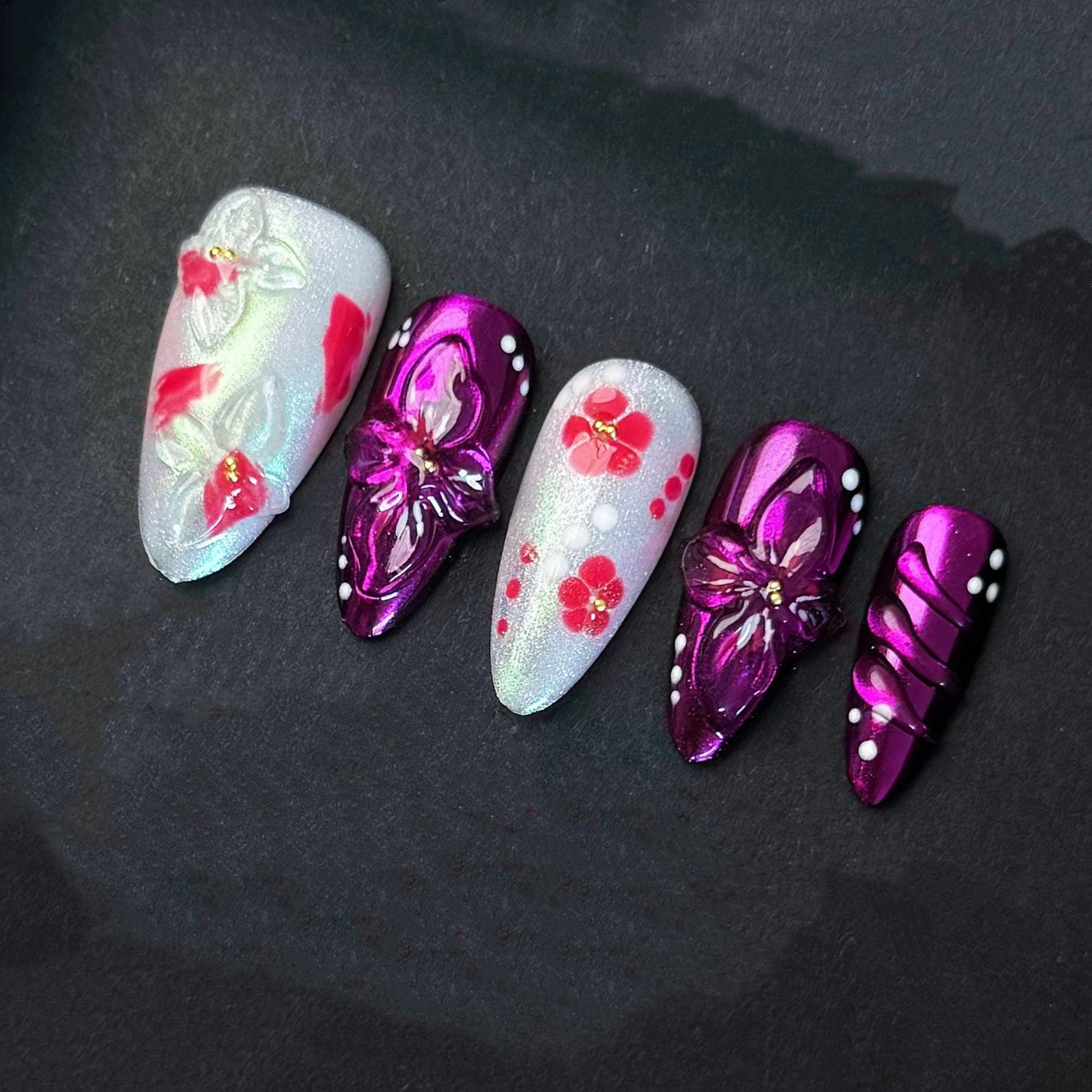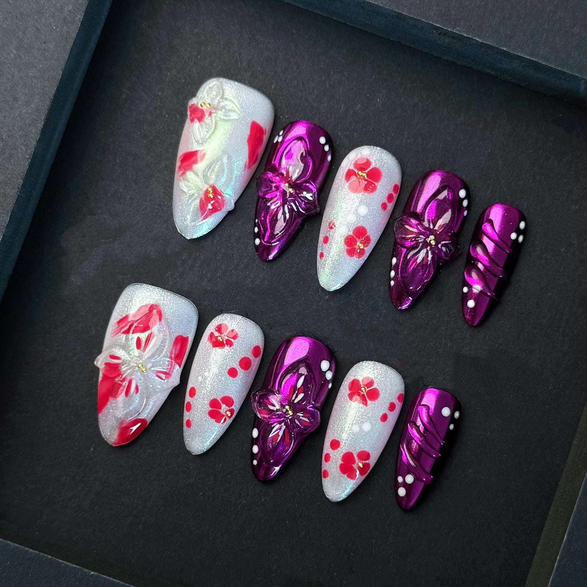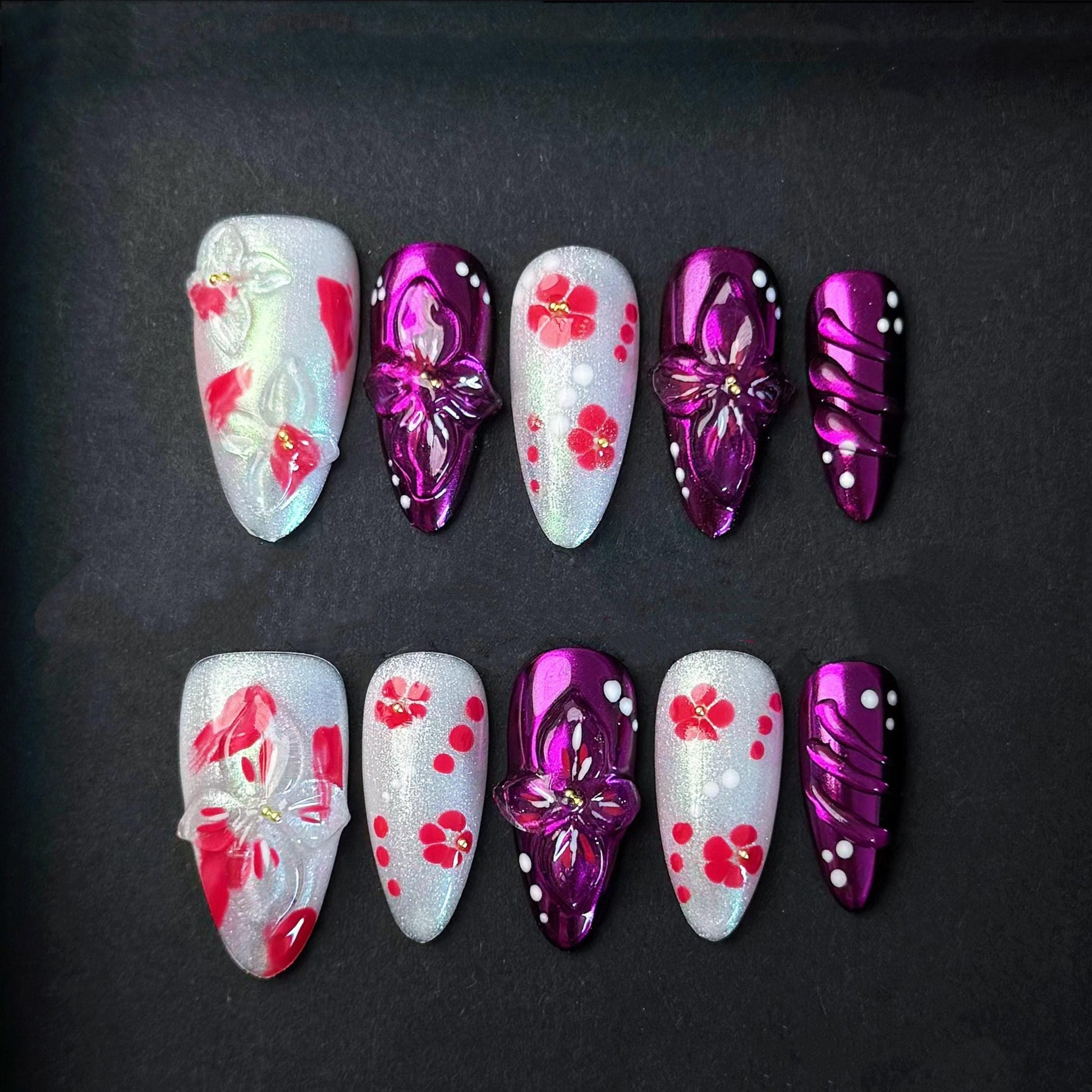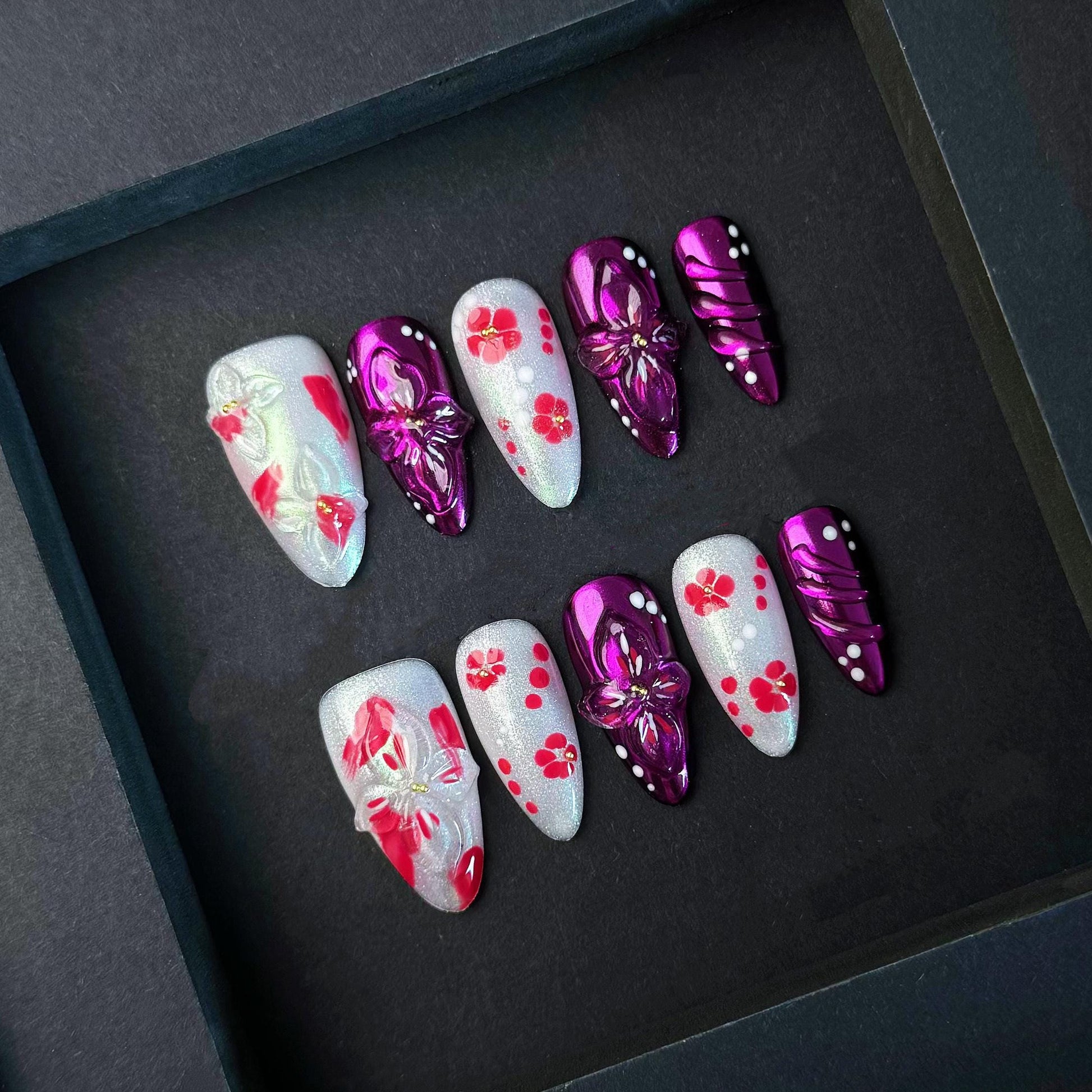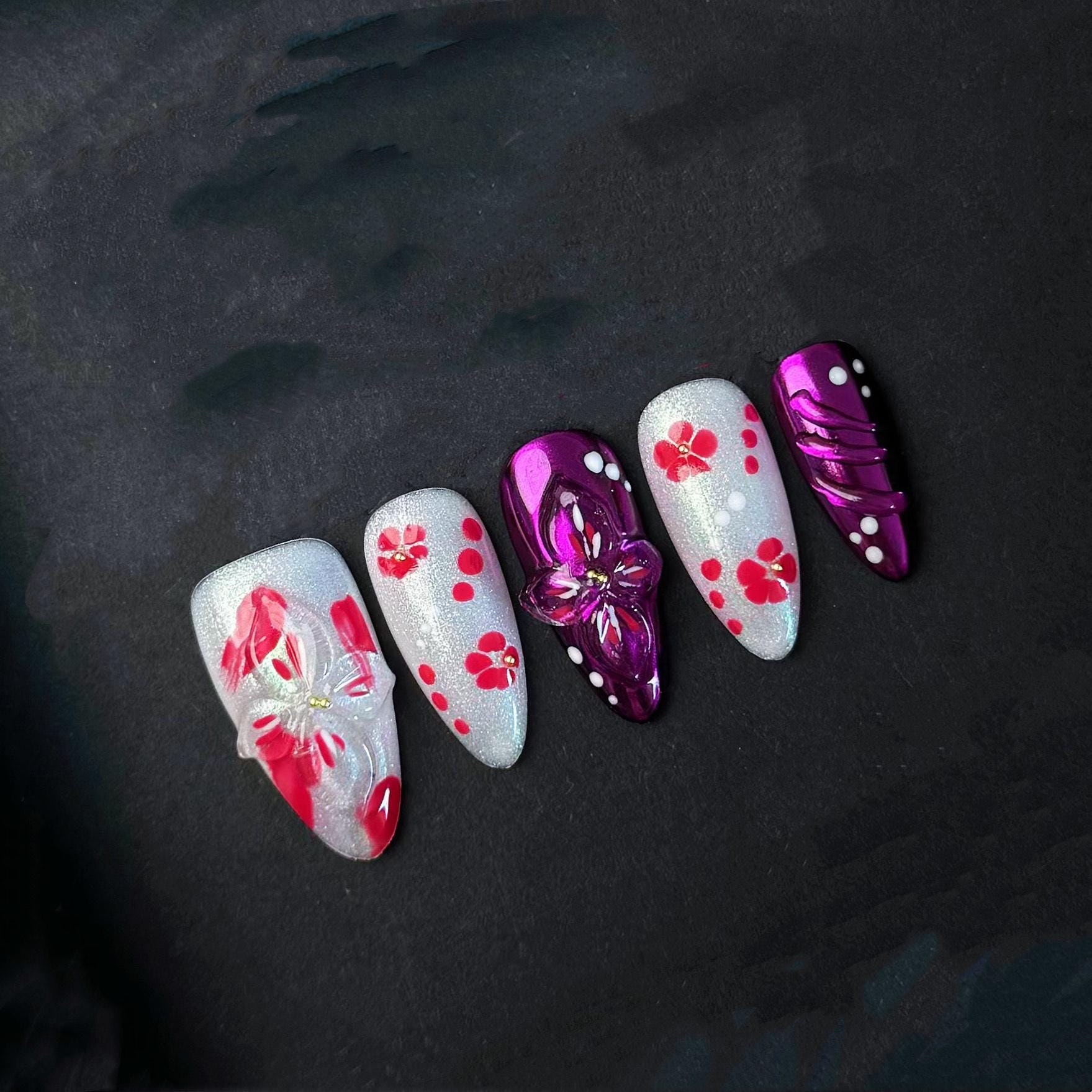 This eye-catching set of press-on nails features a dazzling contrast of radiant chrome fuchsia and soft pearl white with a shimmering finish. Each nail is uniquely adorned with vibrant red floral motifs, complemented by 3D blossoms and dotted detailing. The mix of high-shine metallic and opalescent glitter creates a bold yet elegant look perfect for parties, date nights, or anytime you want to stand out. These nails combine fun, femininity, and fierce glamour, offering an easy and reusable salon-quality manicure at home.