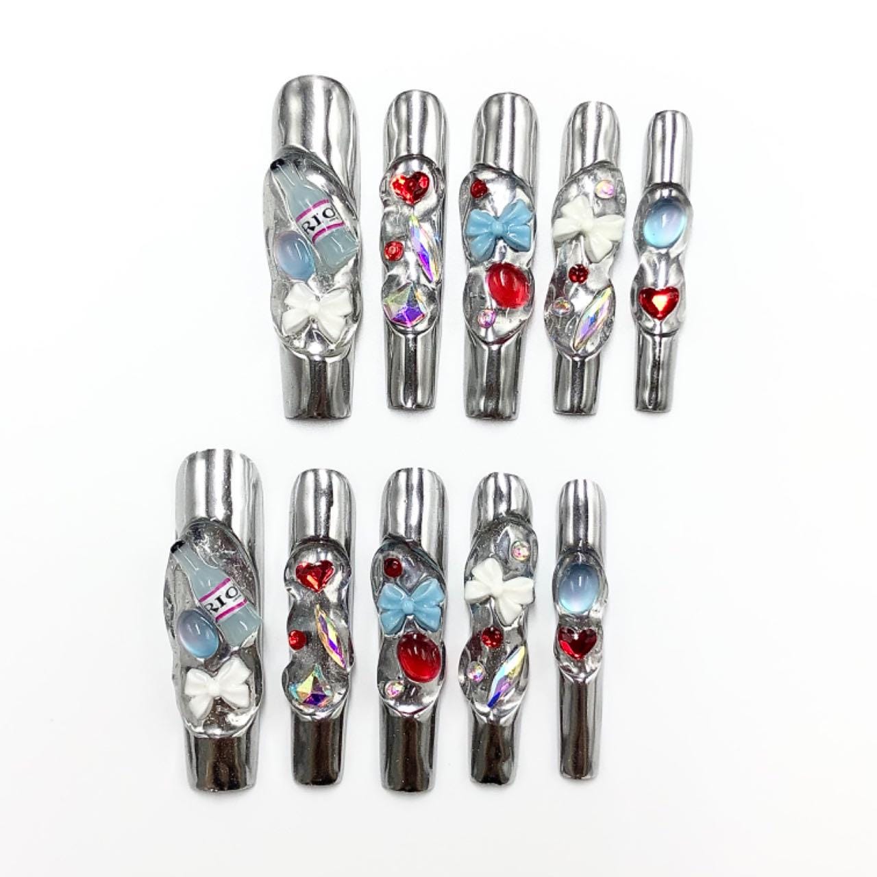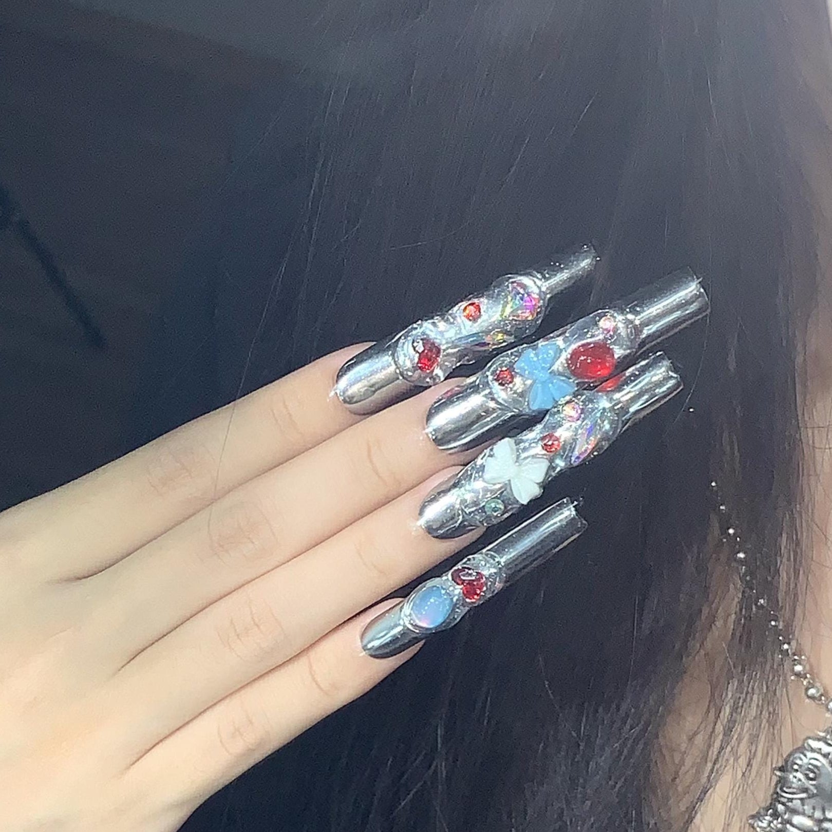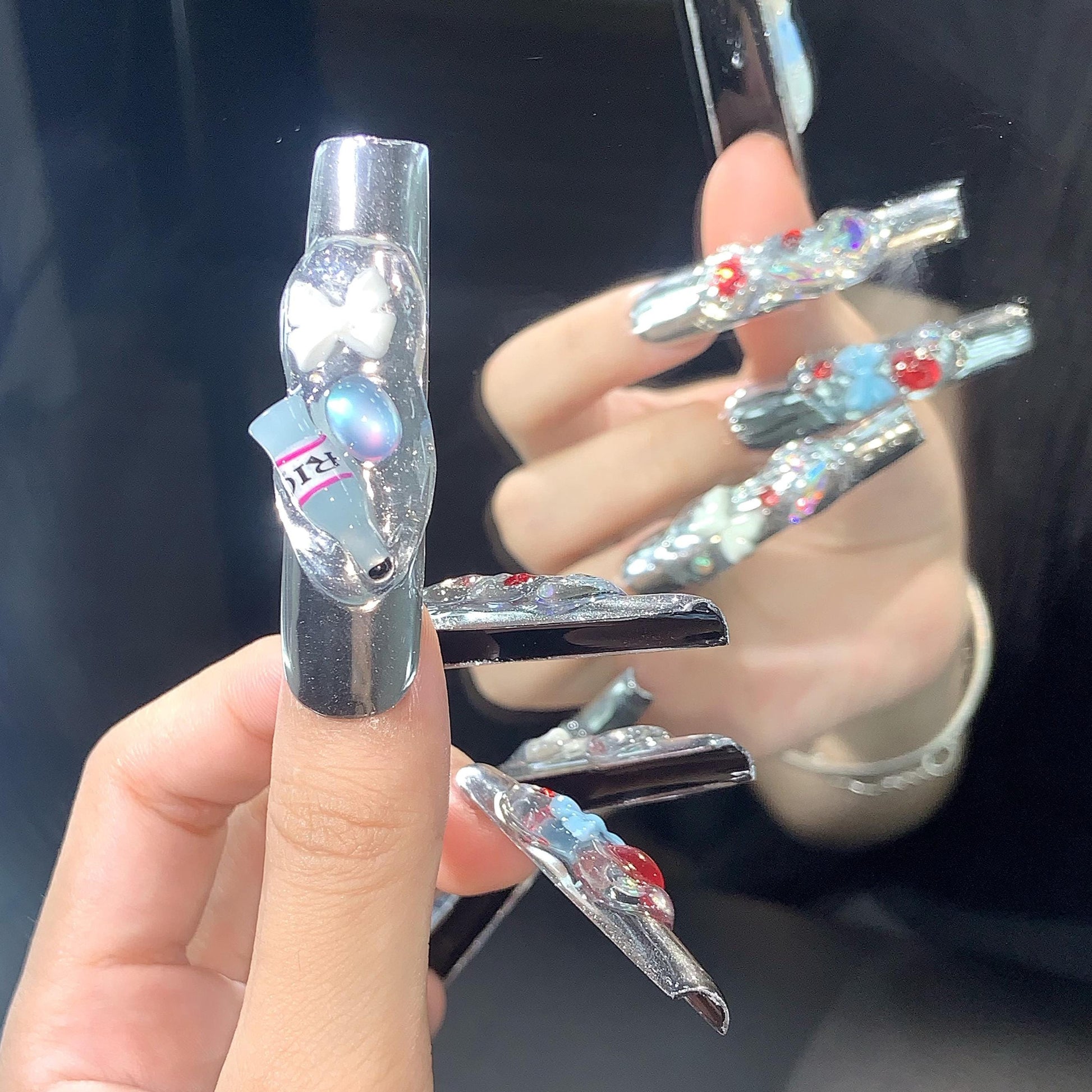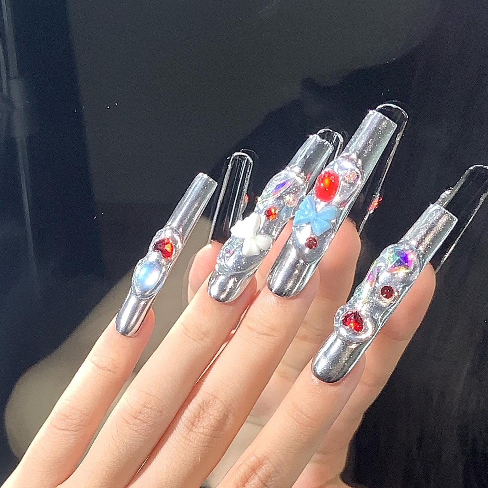 Step into the future with this edgy silver chrome press-on nail set, featuring embedded capsule-like 3D charms. Adorned with hearts, bows, florals, and iridescent gems, these long square nails create a bold, high-fashion look that’s both playful and sci-fi inspired. Perfect for trendsetters who love maximalist, avant-garde designs.