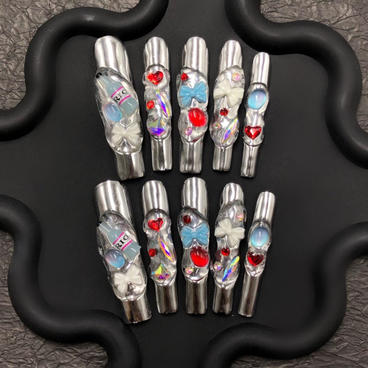 Chrome Heart Capsule Press On Nails – 3D Bow & Bubble Charm Futuristic Set Artificial reusable fake glue on faux manicure nails trendy art