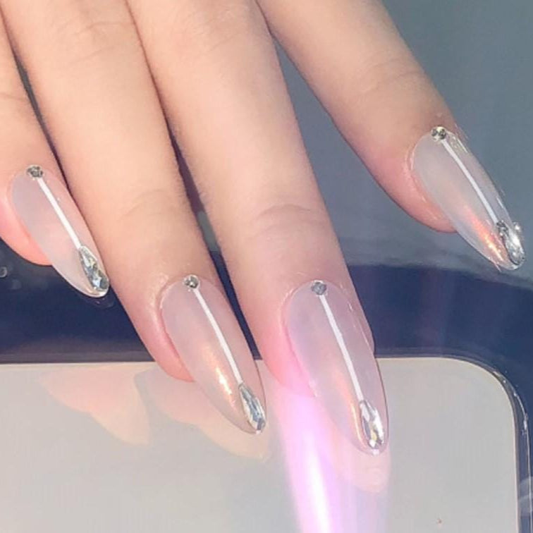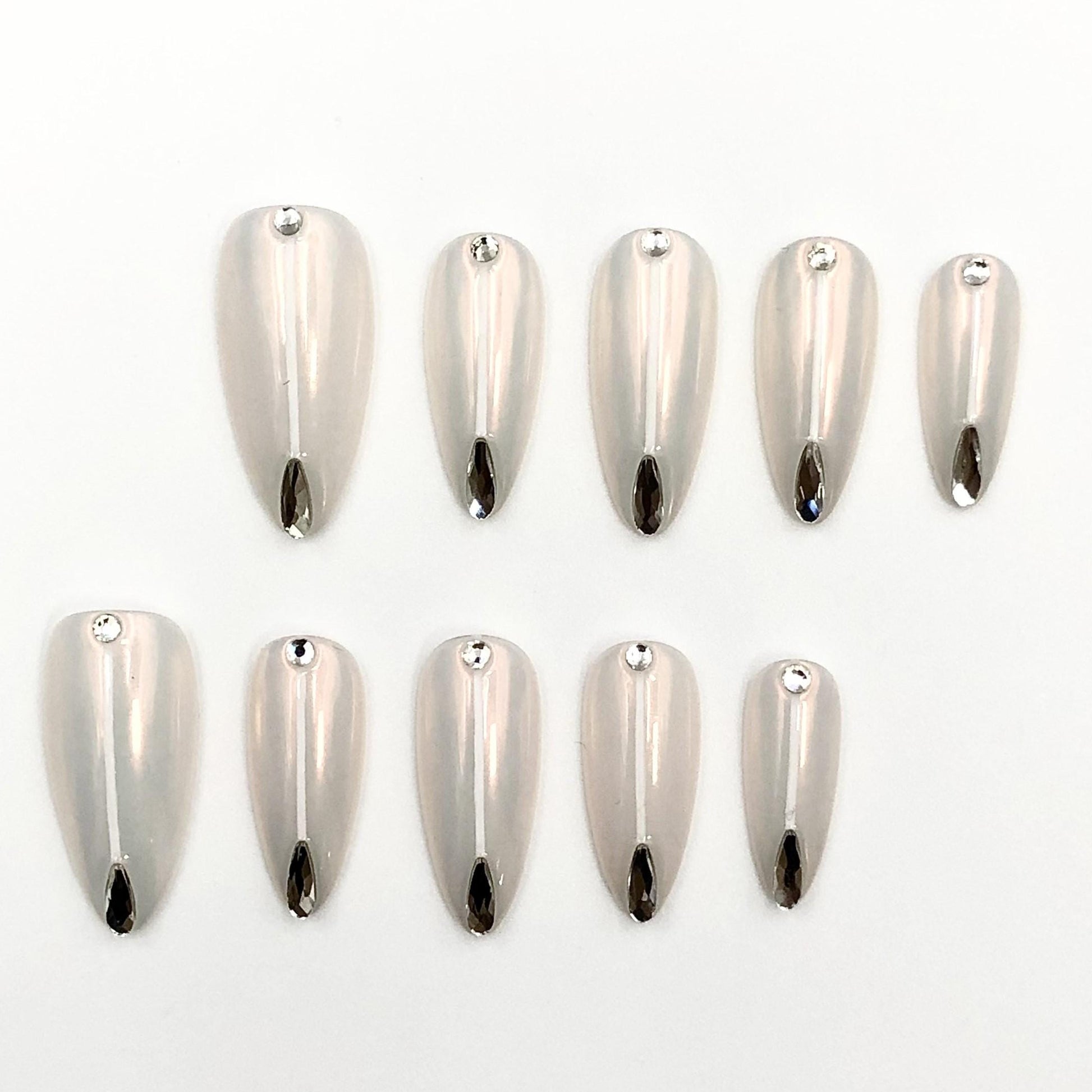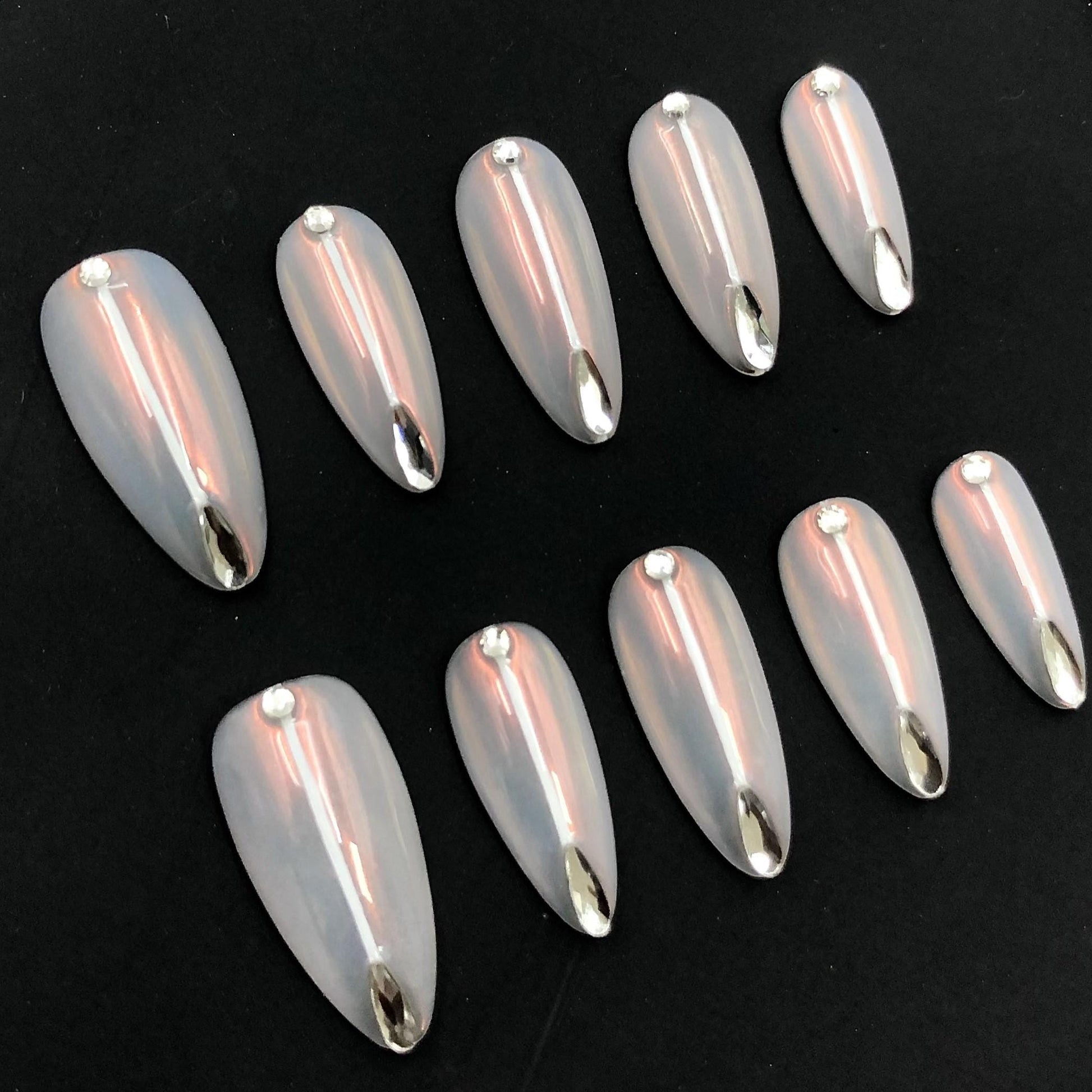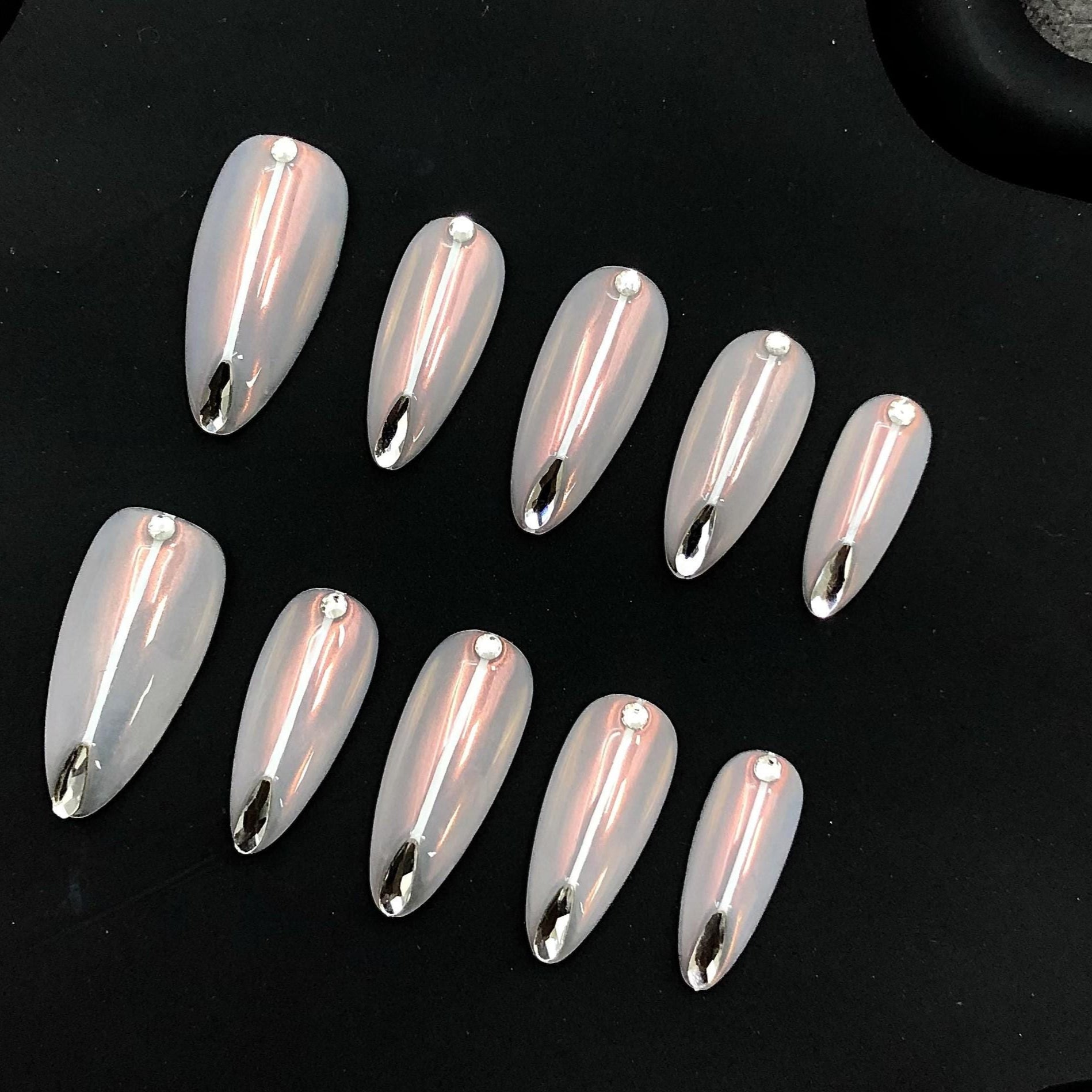 Sleek, modern, and effortlessly elegant — this chrome pearl aura press-on nail set features a soft iridescent finish with a glossy silver droplet at the cuticle and a subtle gem accent. The minimalist yet luxe design makes it perfect for bridal looks, special events, or anyone who loves futuristic, clean beauty.