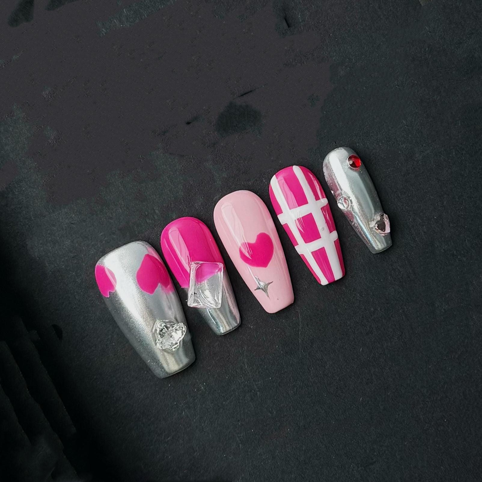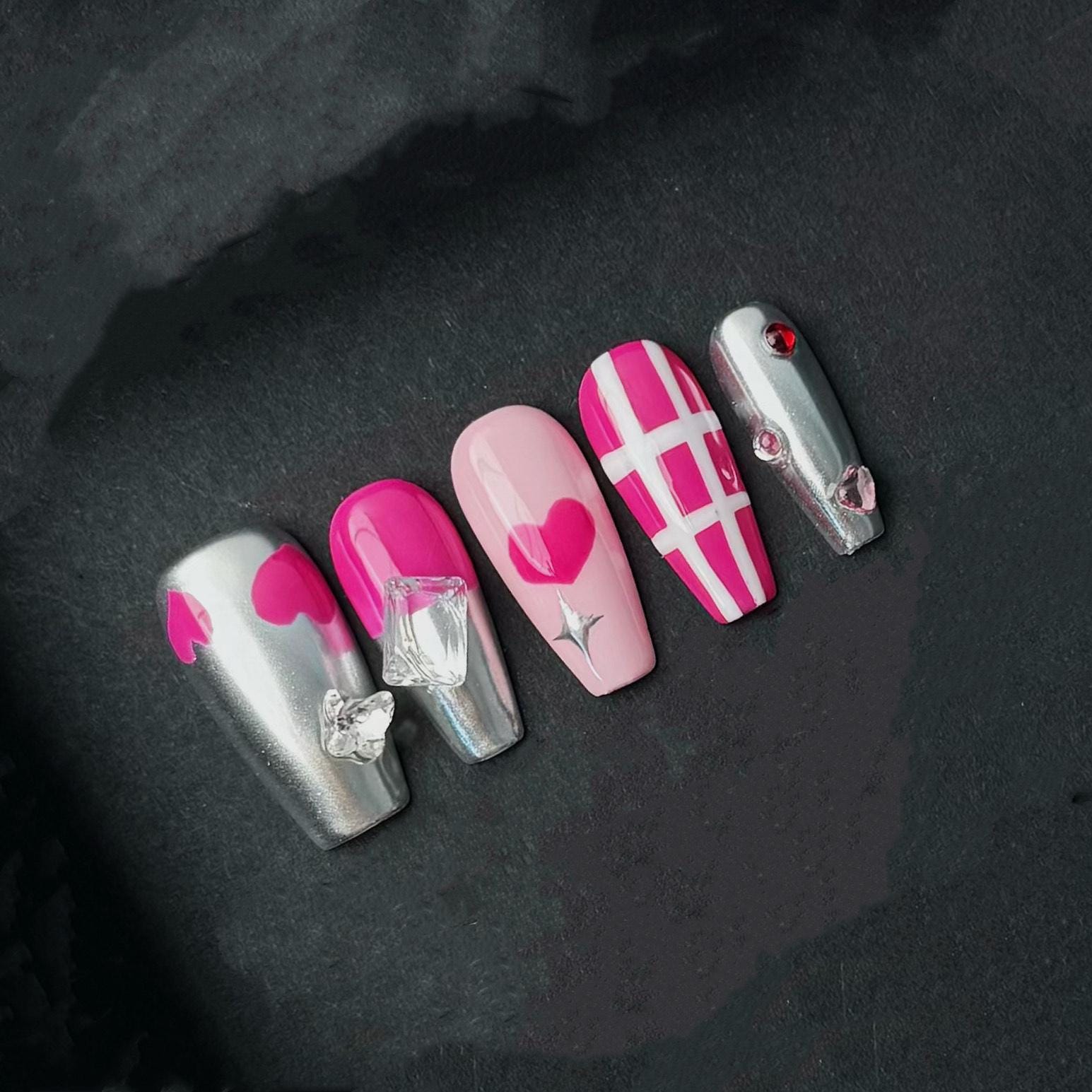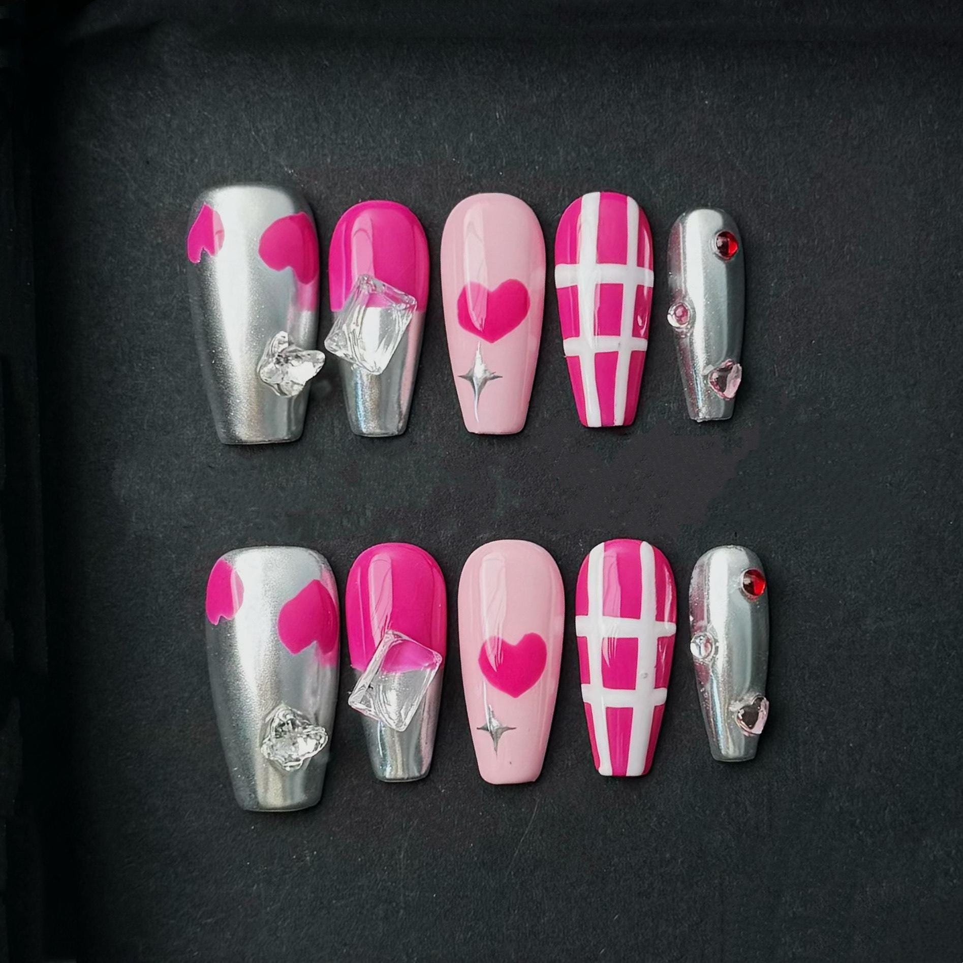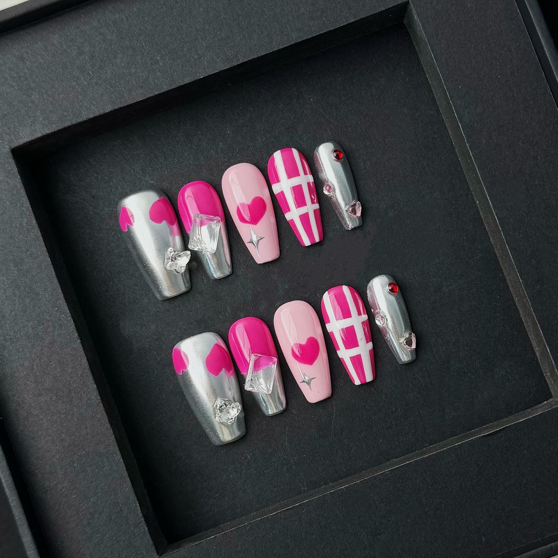 Bold, playful, and full of love—this press-on nail set features an eye-catching mix of hot pink, baby pink, and silver chrome finishes. The design includes a variety of graphic elements such as solid and outlined hearts, white grid line art, and shimmering metallics. Each nail is topped with dazzling 3D gems, from angular ice-like crystals to dainty rhinestones, giving the set a luxurious, high-glam look. These medium-length square nails are ideal for Valentine’s Day, date nights, or anytime you want to flaunt your flirty side with a futuristic edge.