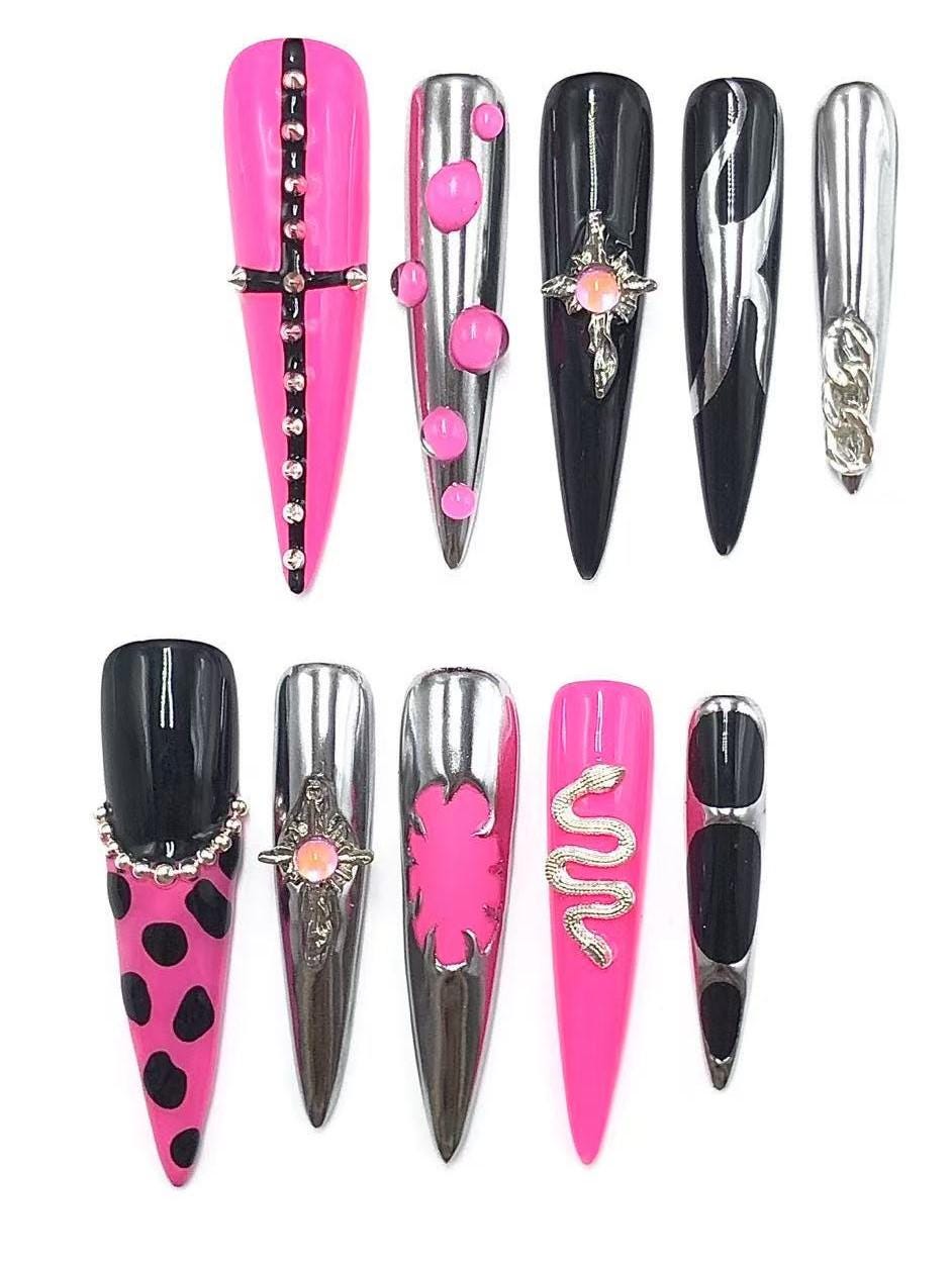 Chrome Punk Press-On Nails – Hot Pink Black Silver with Crosses Snakes & Chains Manicure glue on artificial fake faux reusable trendy nail