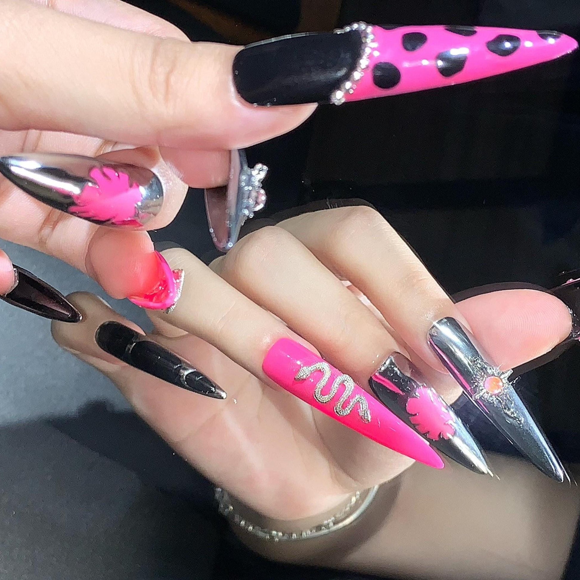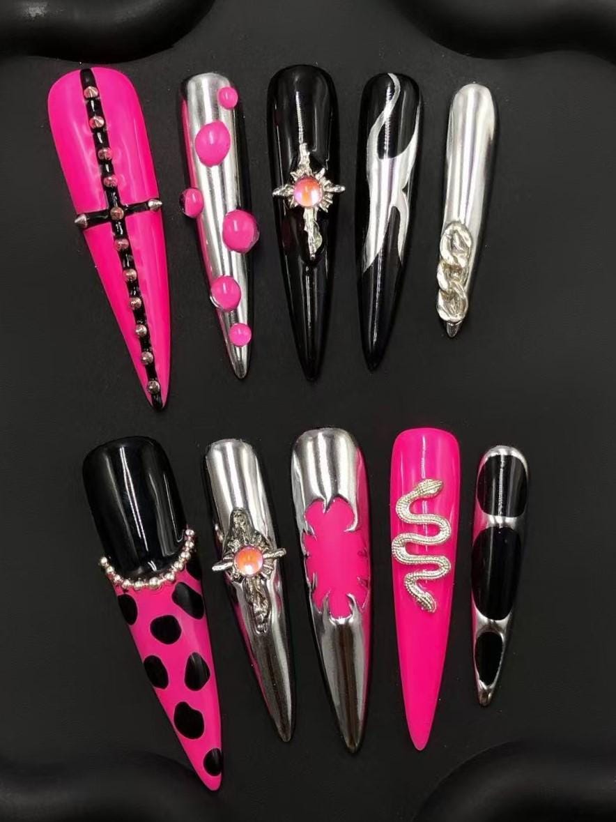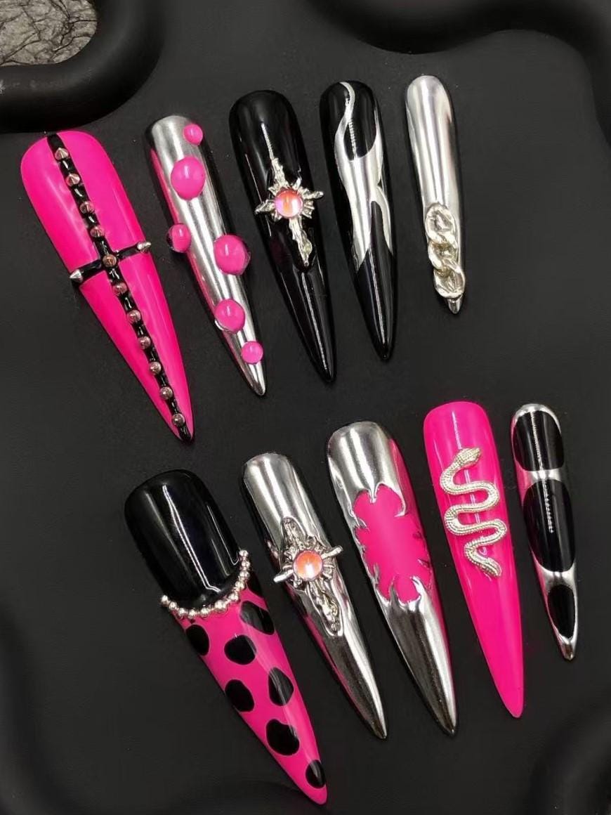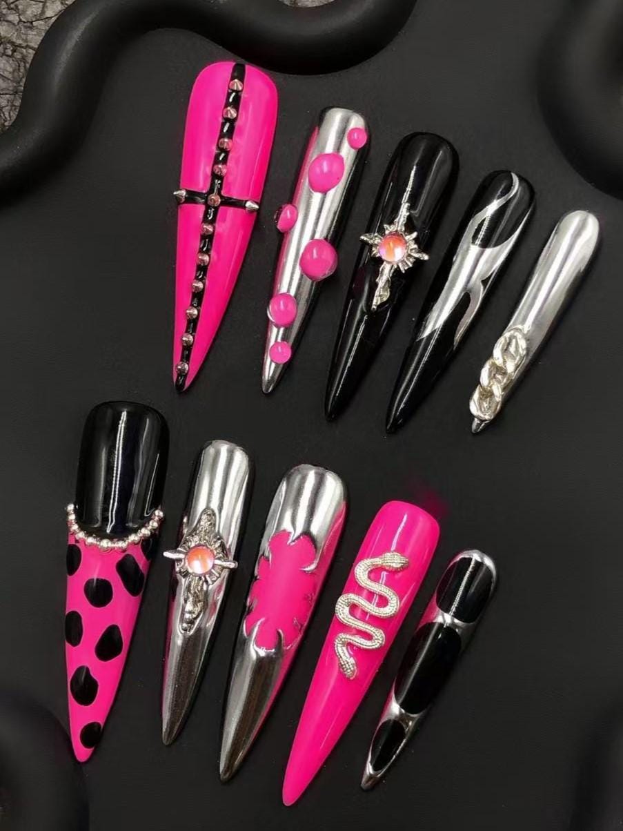 Unleash your inner rock star with this fierce Chrome Punk press-on nail set. Featuring a high-contrast combo of hot pink, jet black, and mirror silver, these long stiletto nails come decked out in bold designs like 3D chains, snakes, studs, flames, and gothic crosses. A statement-worthy set for rebels, ravers, and trendsetters alike.