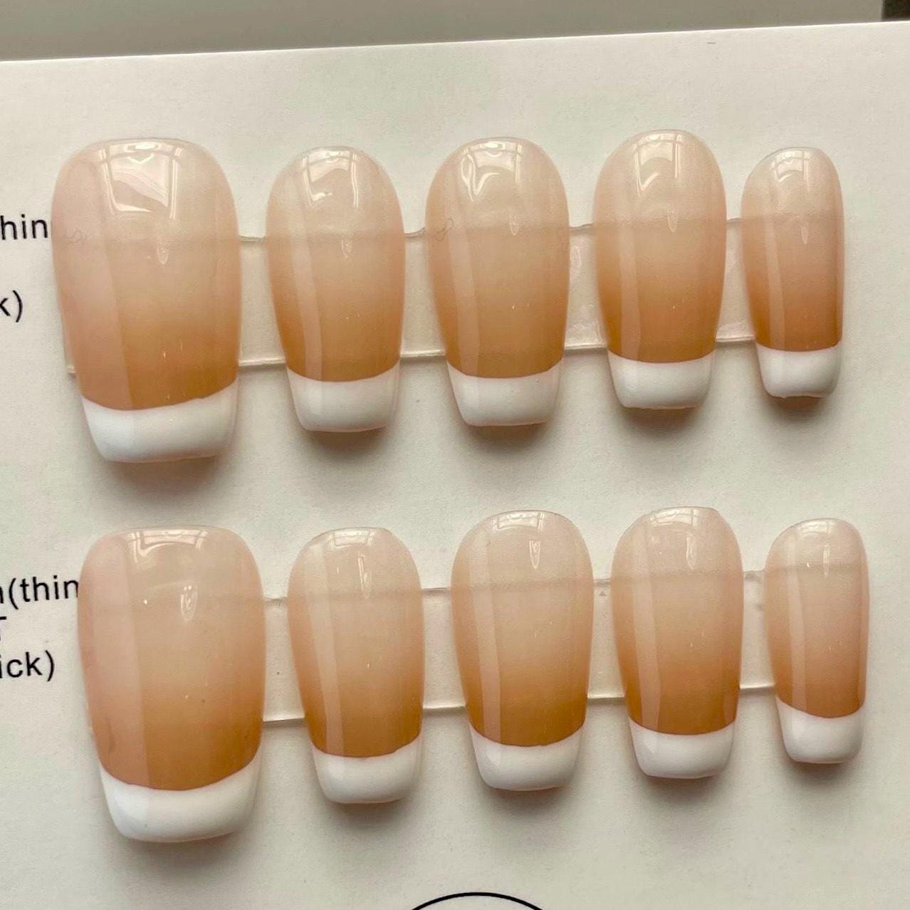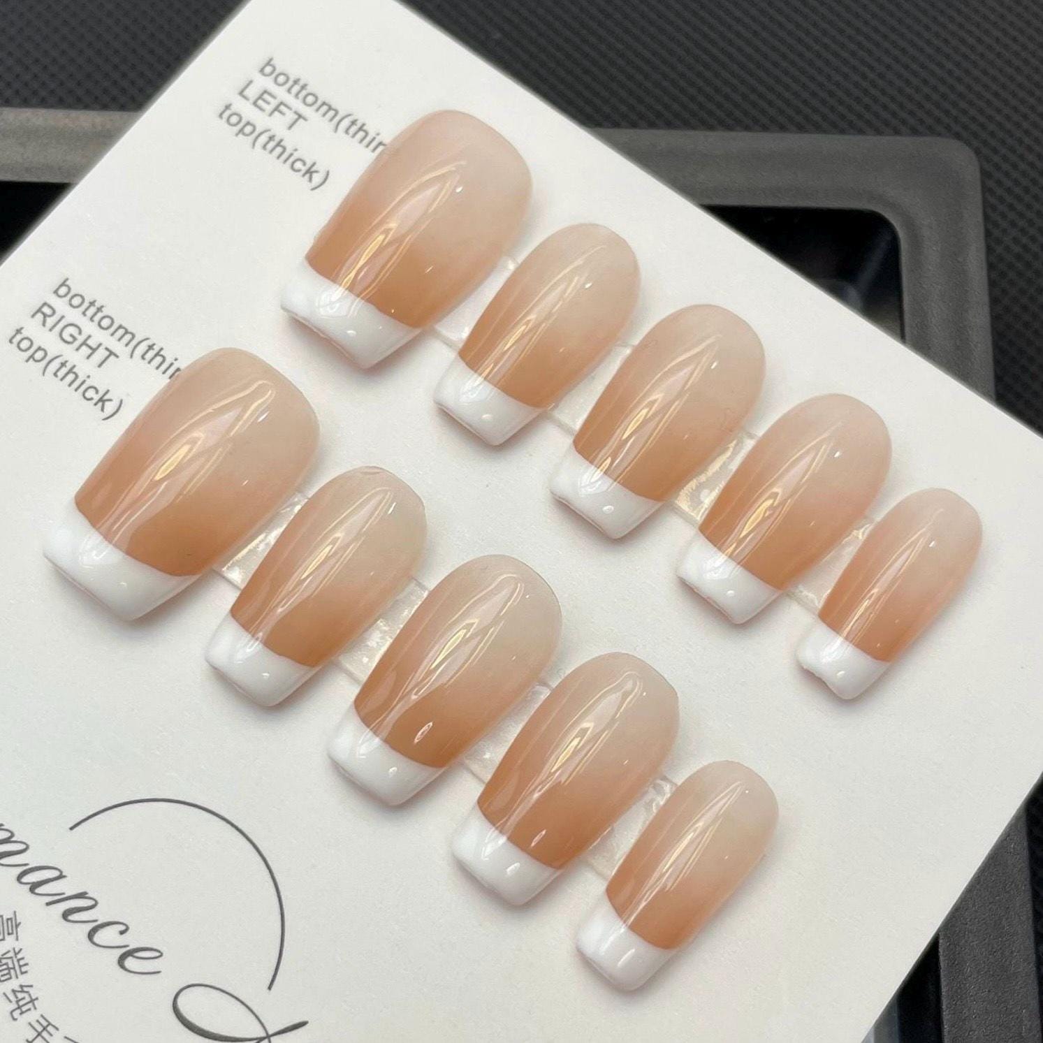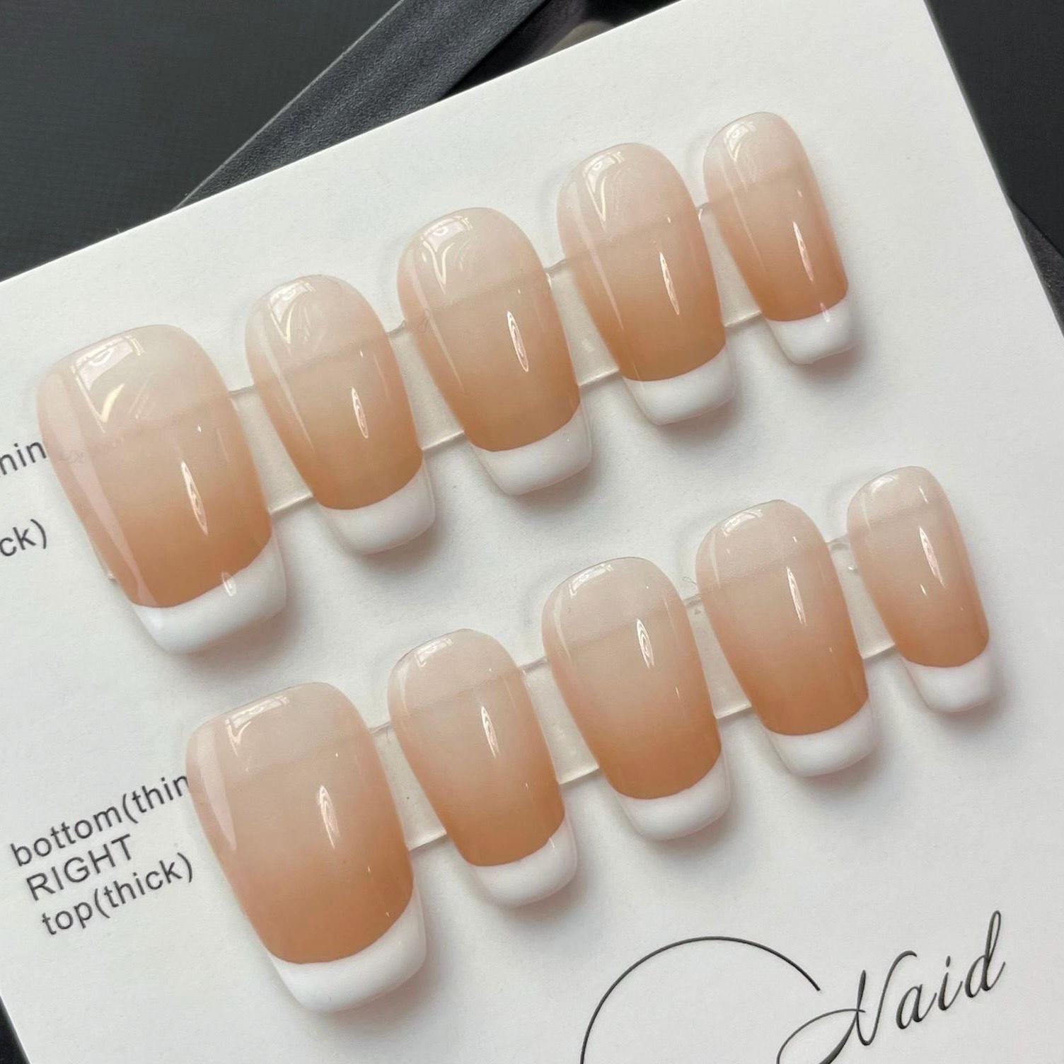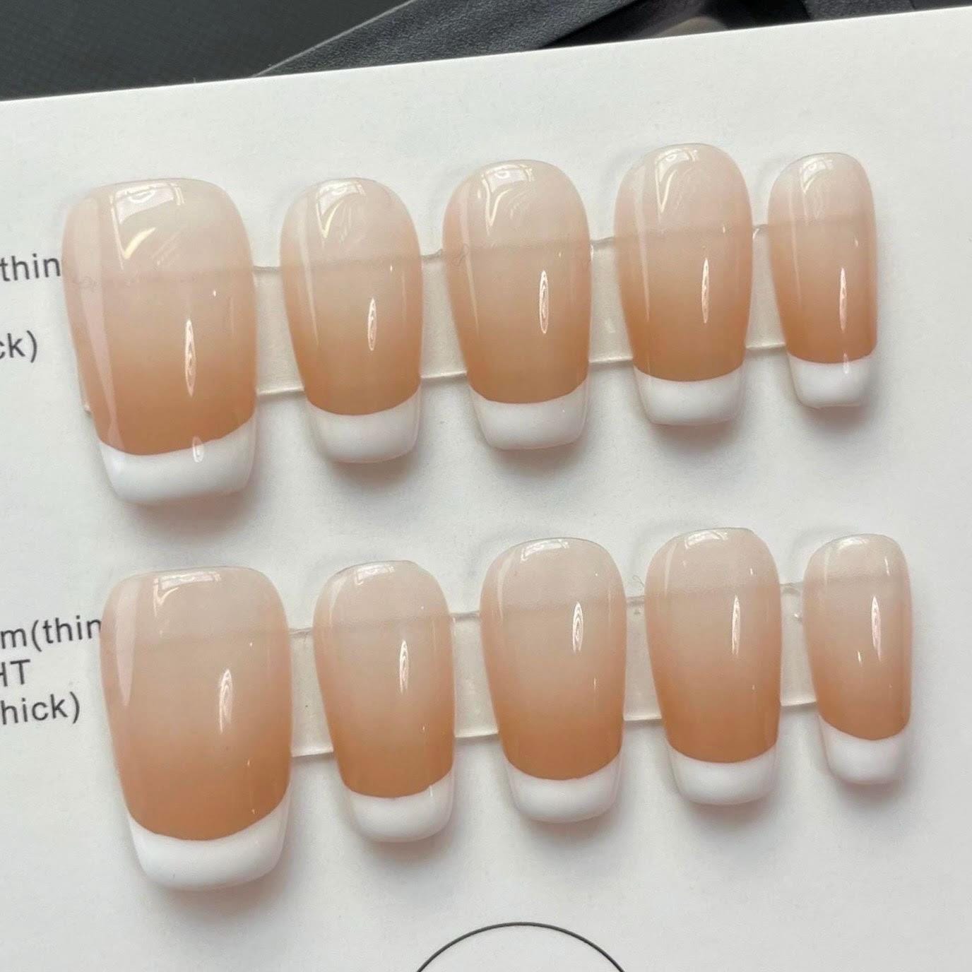 Classic French Tip Nude Press-On Nails – Short Square Shape. Artificial reusable fake glue on faux manicure nails trendy art.