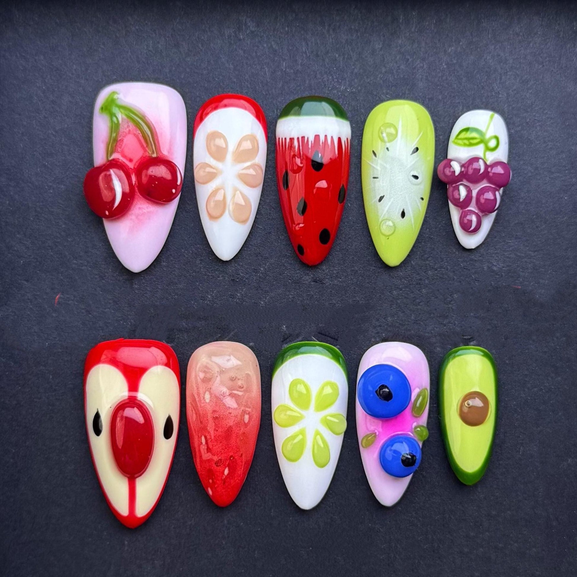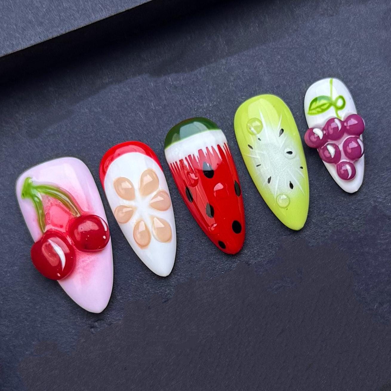 Colorful Fruit Salad Press On Nails with 3D Fruit Art and Glossy Finish Artificial reusable fake glue on faux manicure nails trendy art