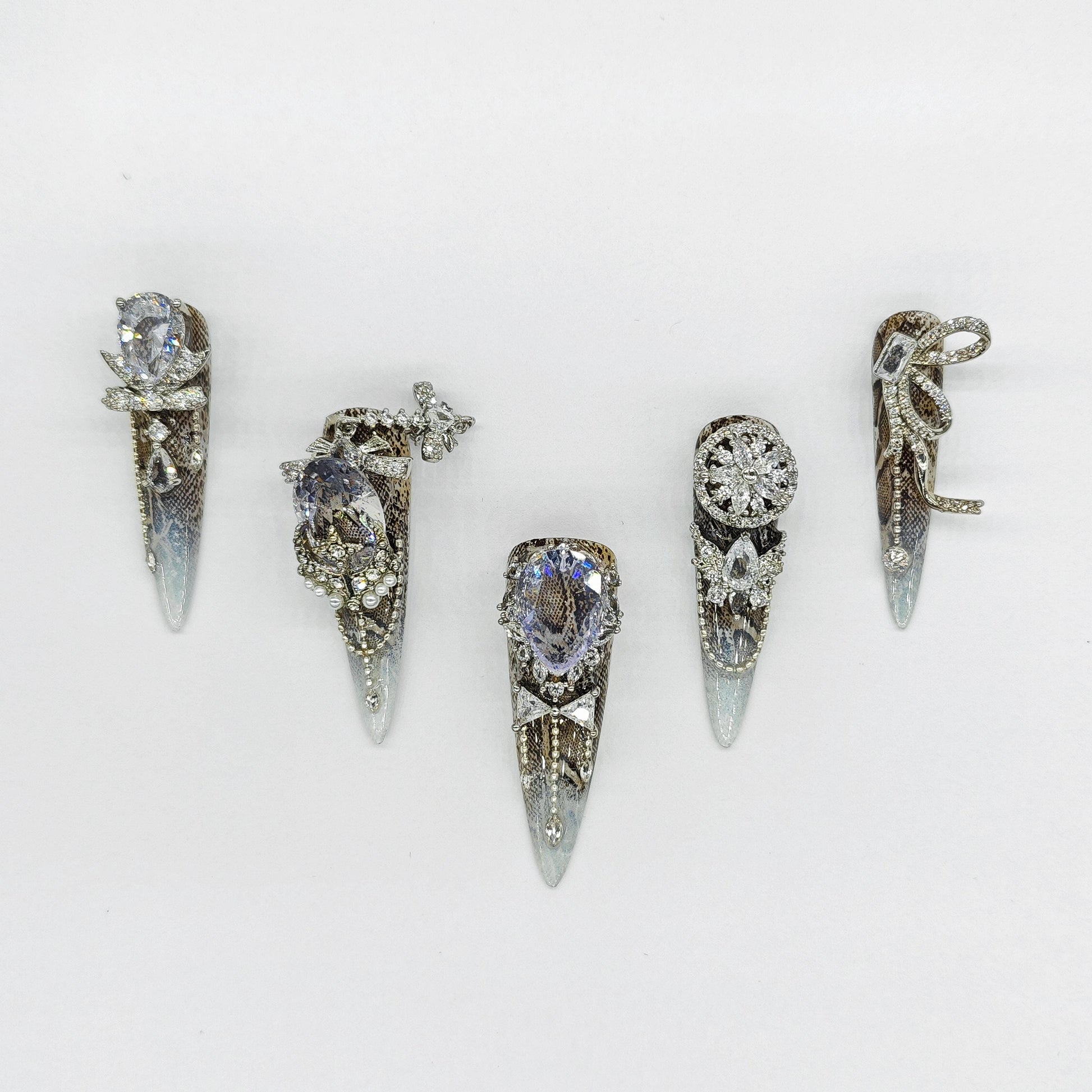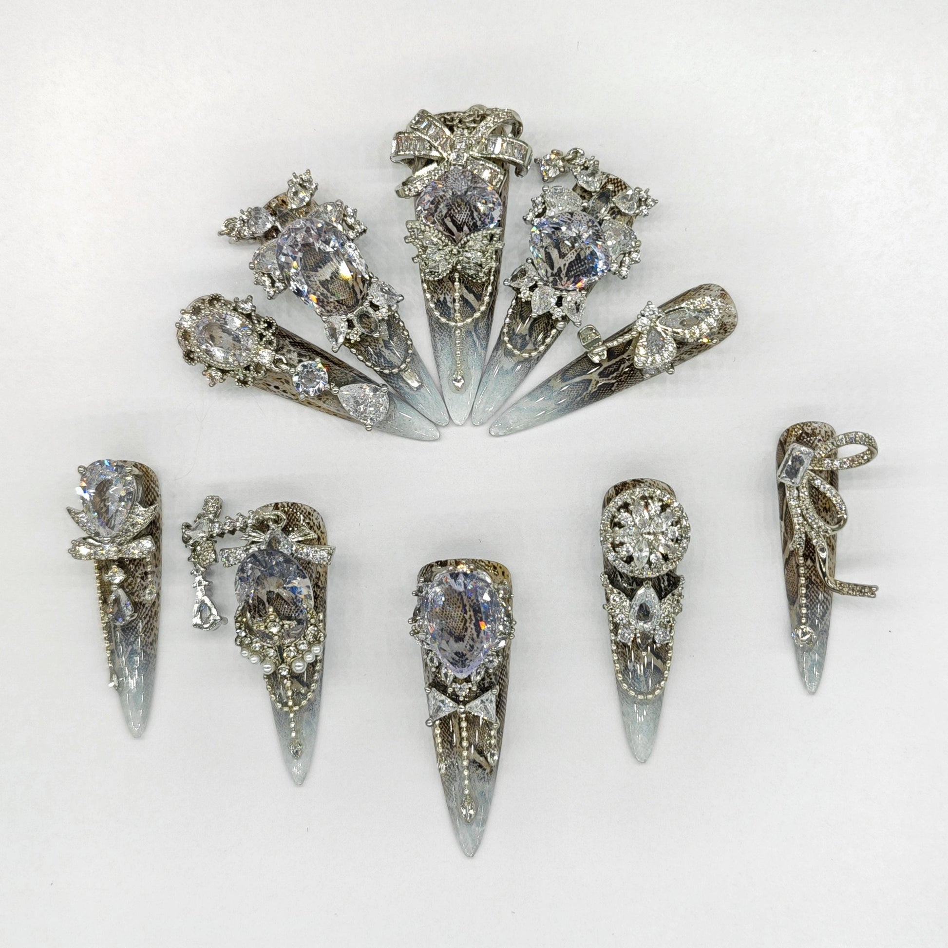 Unveil your inner ice queen with this stunning set of luxury press-on nails featuring a silver chrome base and encrusted with oversized crystals, diamonds, and intricate metallic lace detailing. The nails shimmer with an ombré gradient that fades into a cool frost-tip, resembling icy elegance. Embellished with large teardrop and round-cut rhinestones, pearl accents, metallic bows, and cross charms, each nail exudes high-end couture. This set is perfect for weddings, galas, fashion shows, or any occasion that demands next-level glamour. A true showstopper for those who crave bold and brilliant beauty.