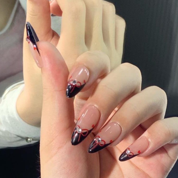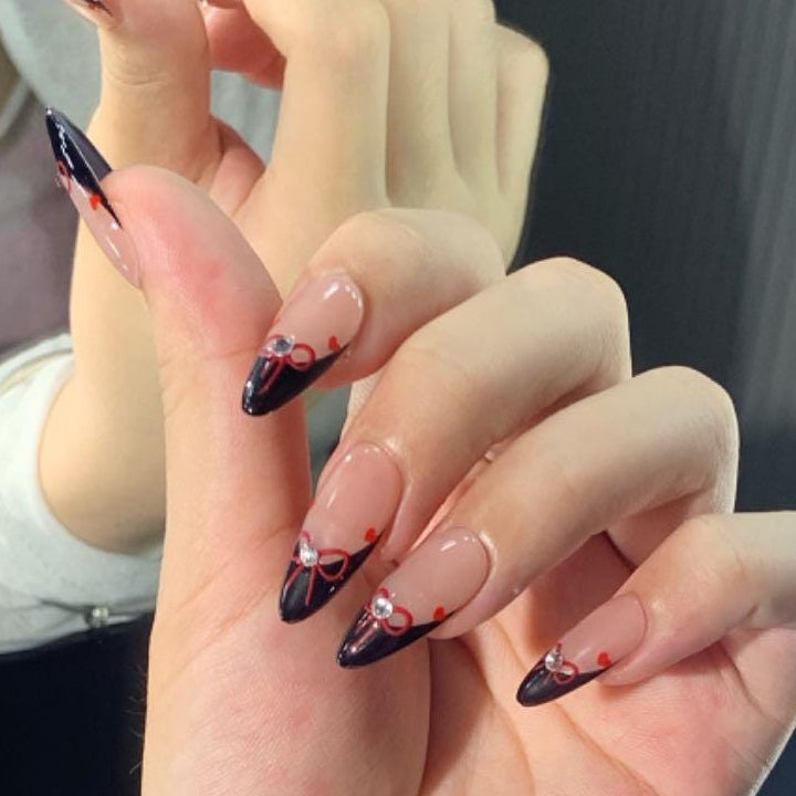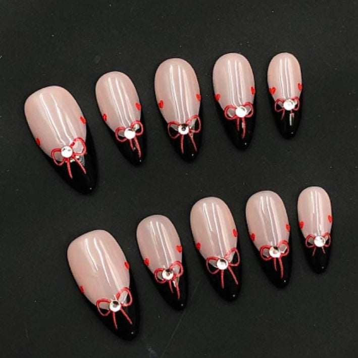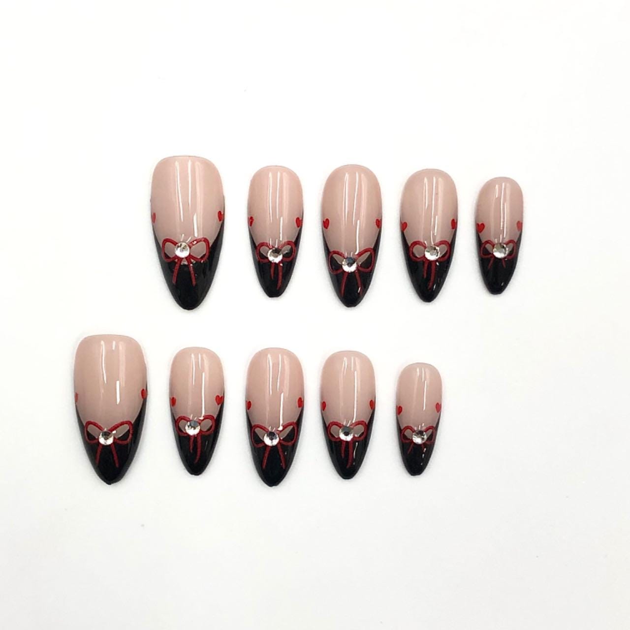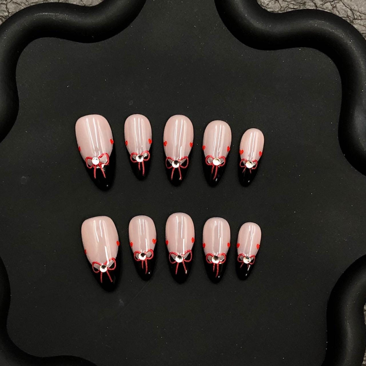 cute bow nails nude black medium girly elegant valentine's red french tip medium rhinestone red ribbon art charming press on nail art almond