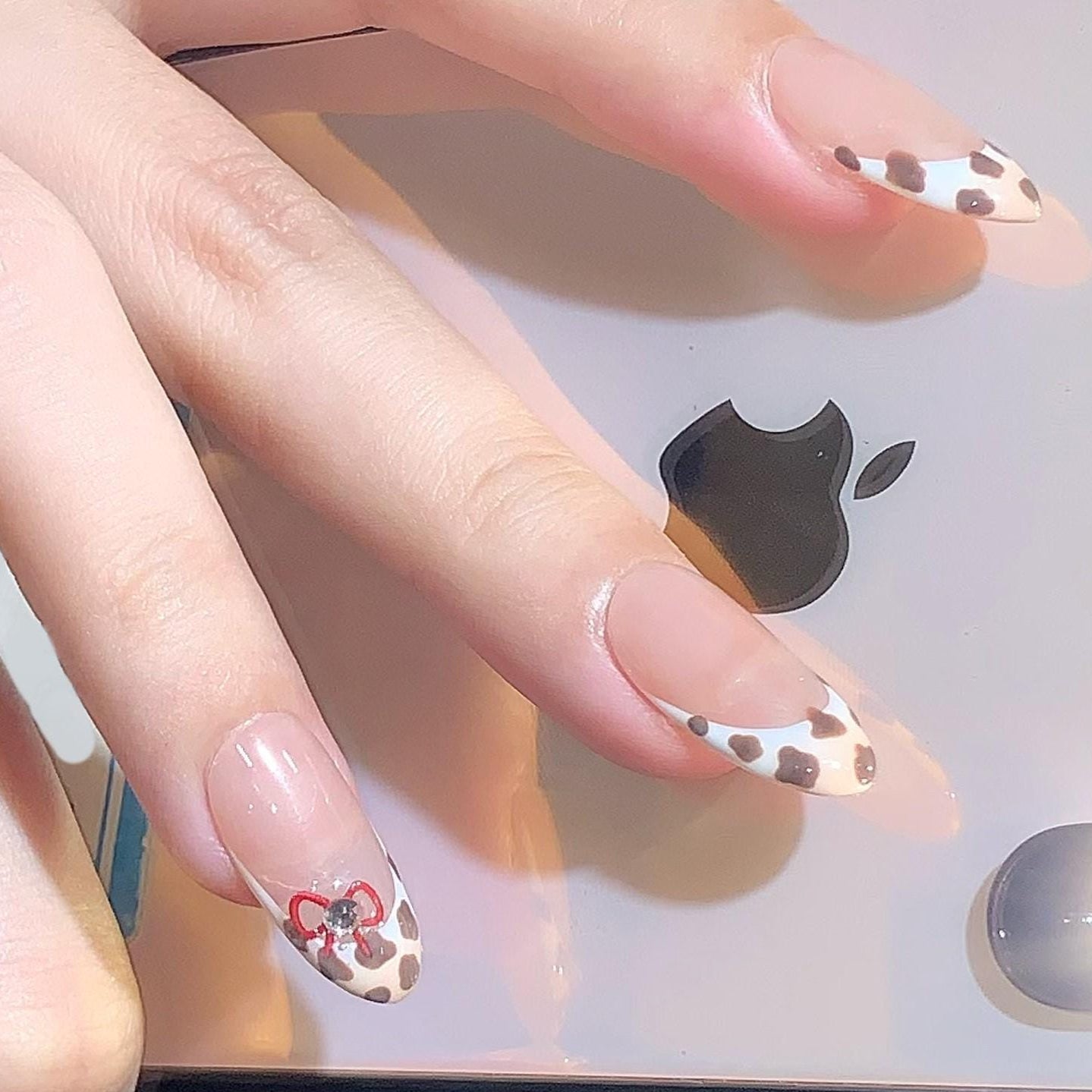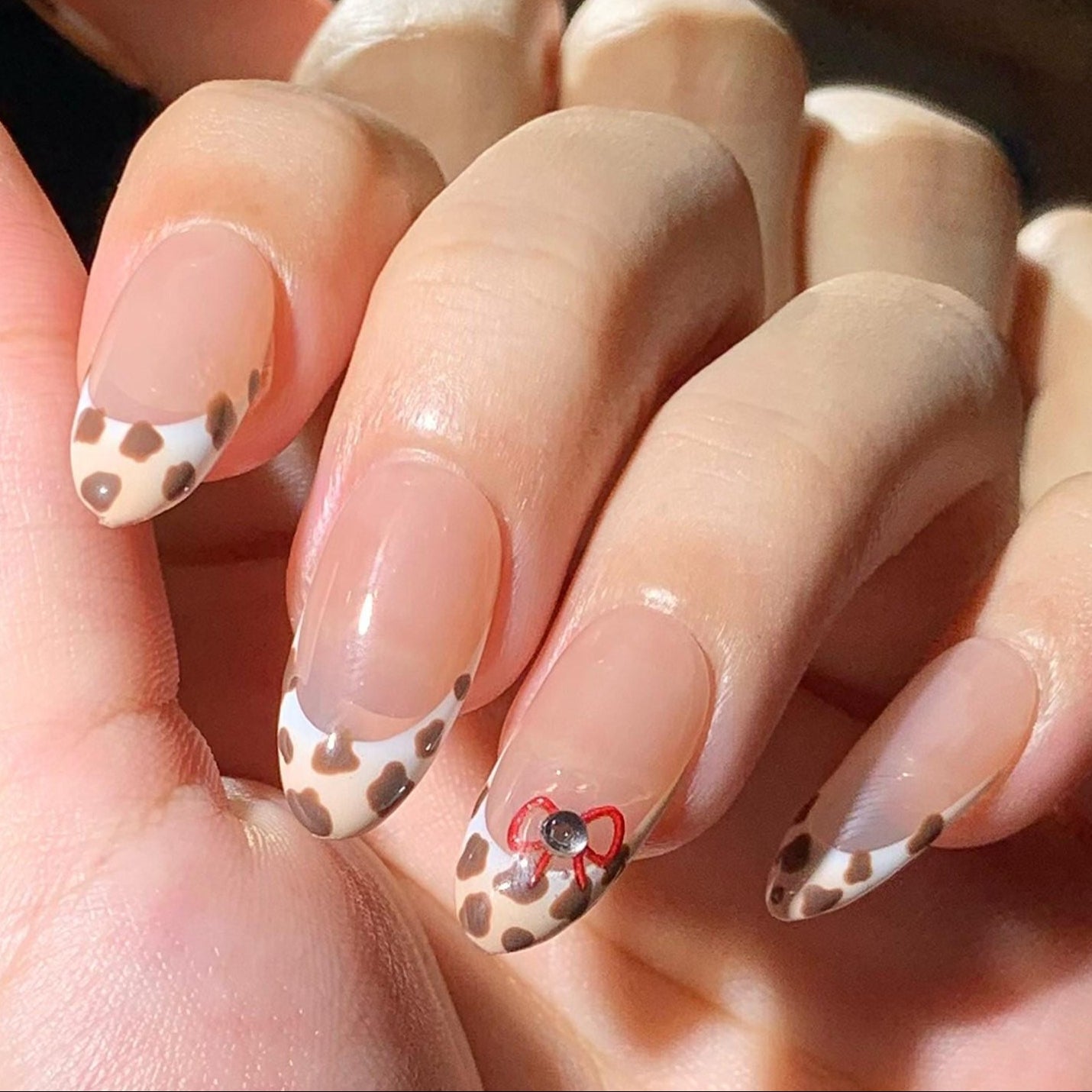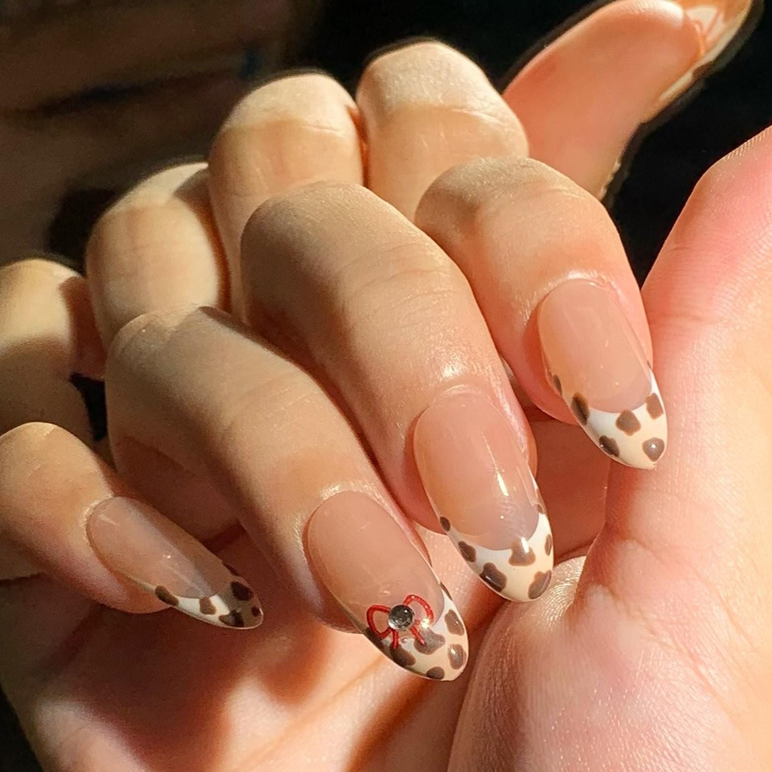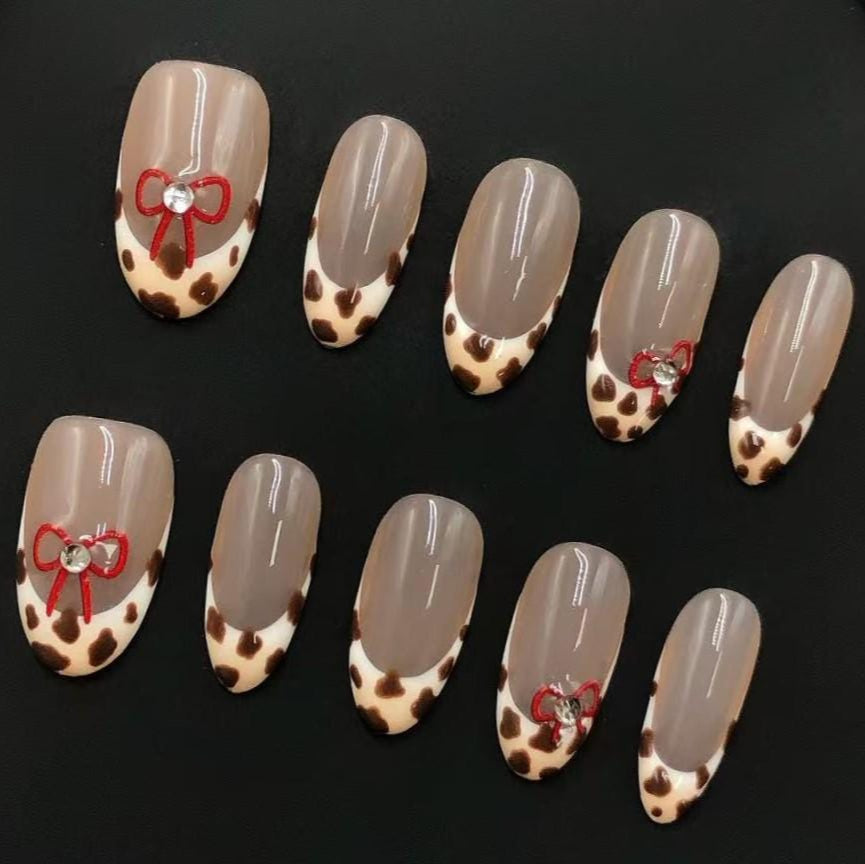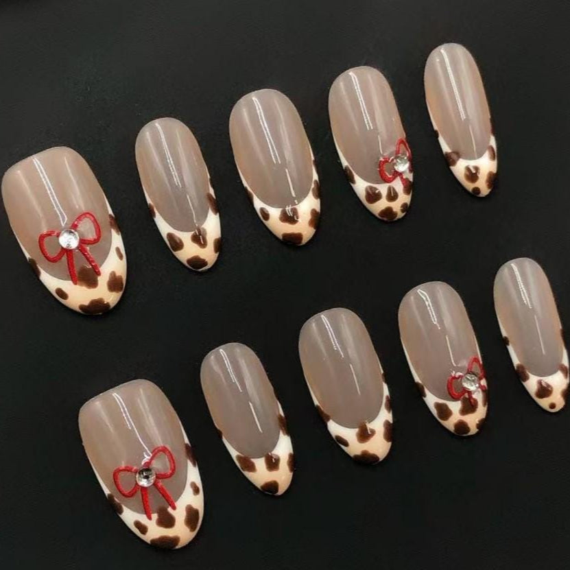 Moo-ve into style with this adorable cow print press-on nail set! Featuring a soft nude base and trendy brown and white cow print French tips, these almond-shaped nails add playful charm to your everyday look. A delicate red bow and gem accent on the ring finger adds the perfect girly touch.