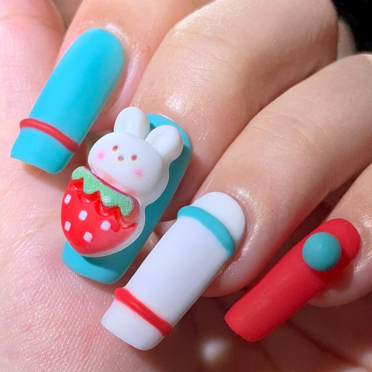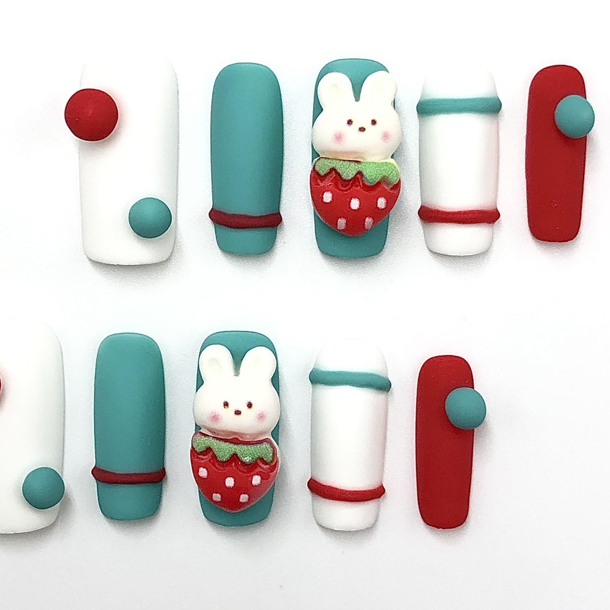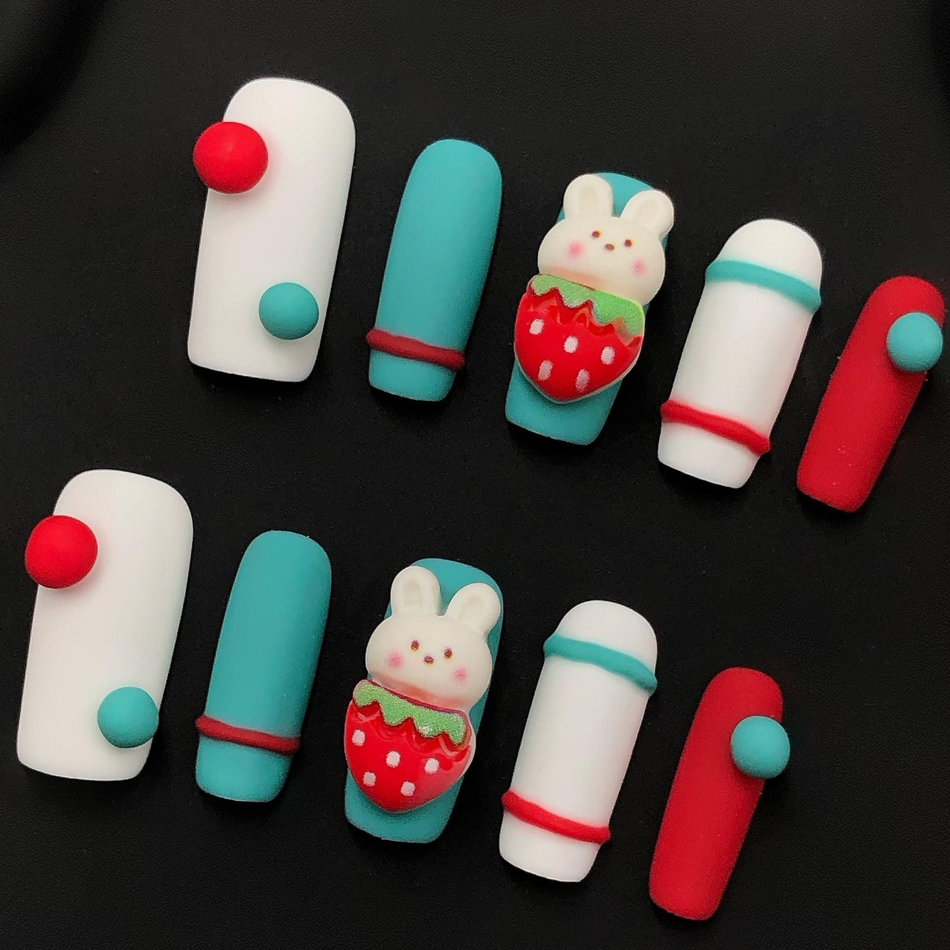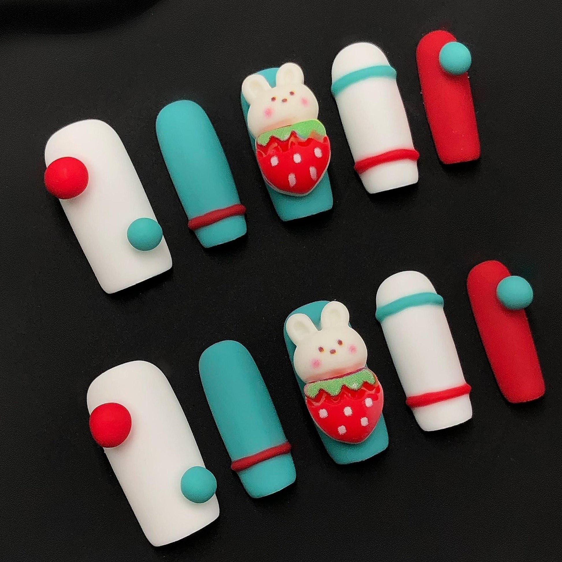 Add a burst of fun to your fingertips with this playful matte press-on nail set! Featuring vibrant red, teal, and white color blocking, 3D button accents, and an adorable bunny holding a strawberry, these kawaii-inspired nails are perfect for playful personalities and lovers of all things cute. Great for themed looks, gifts, or just a fun style switch-up.