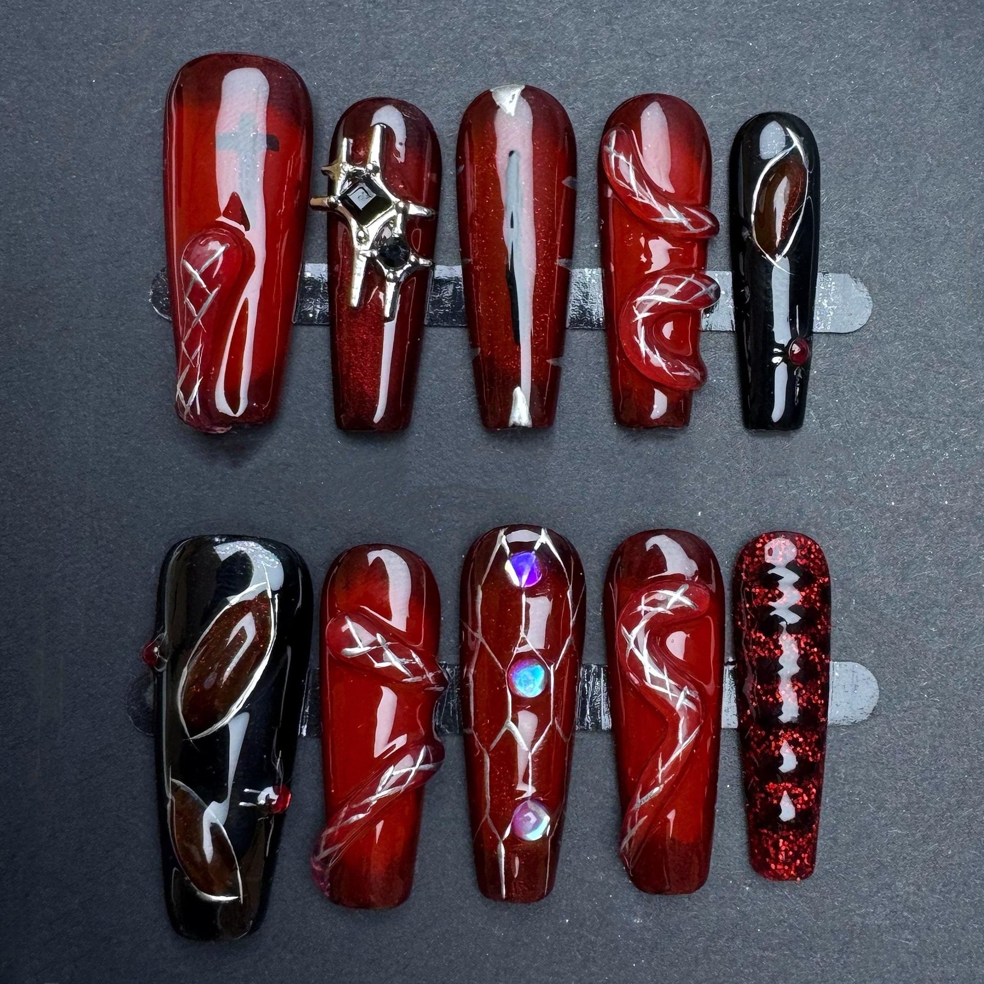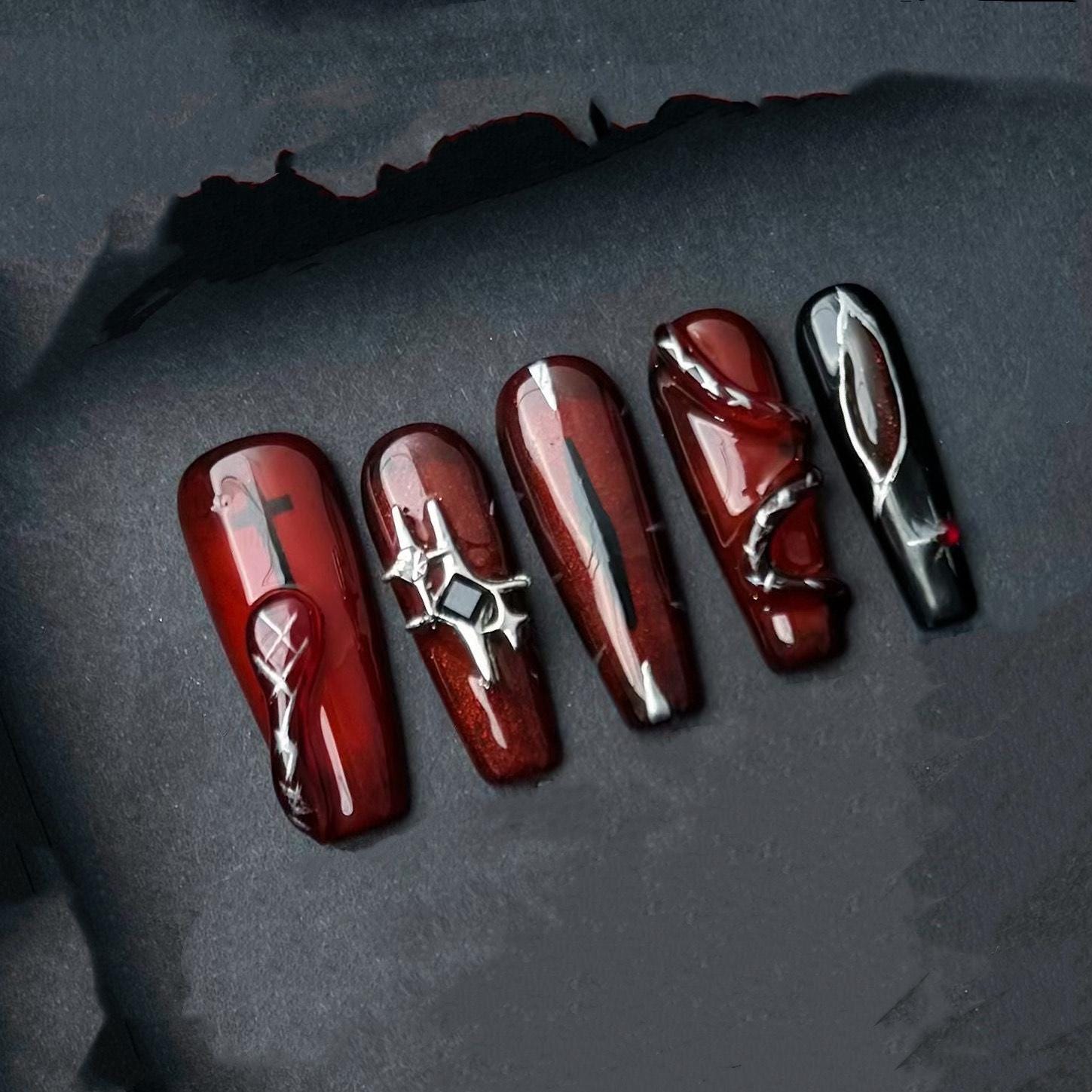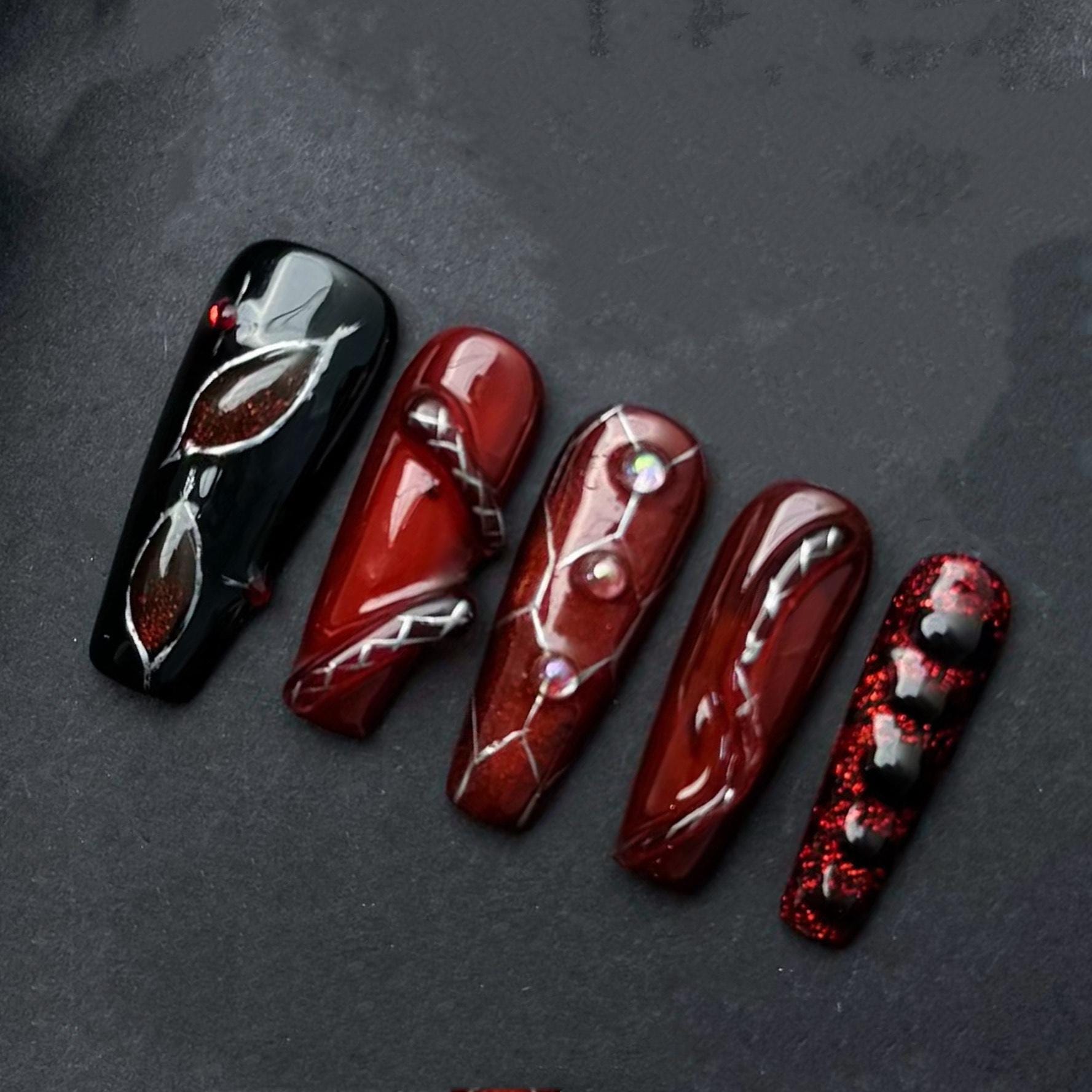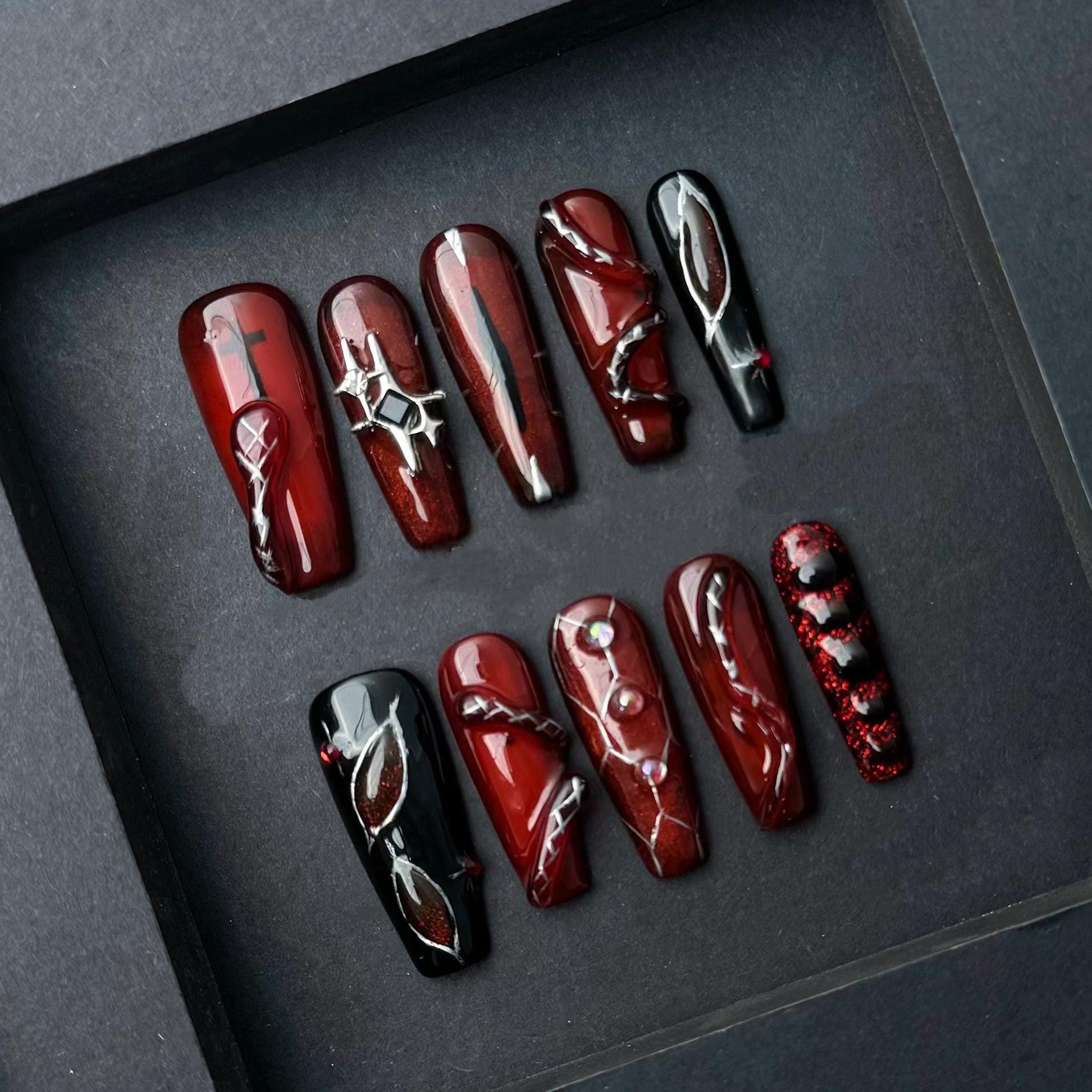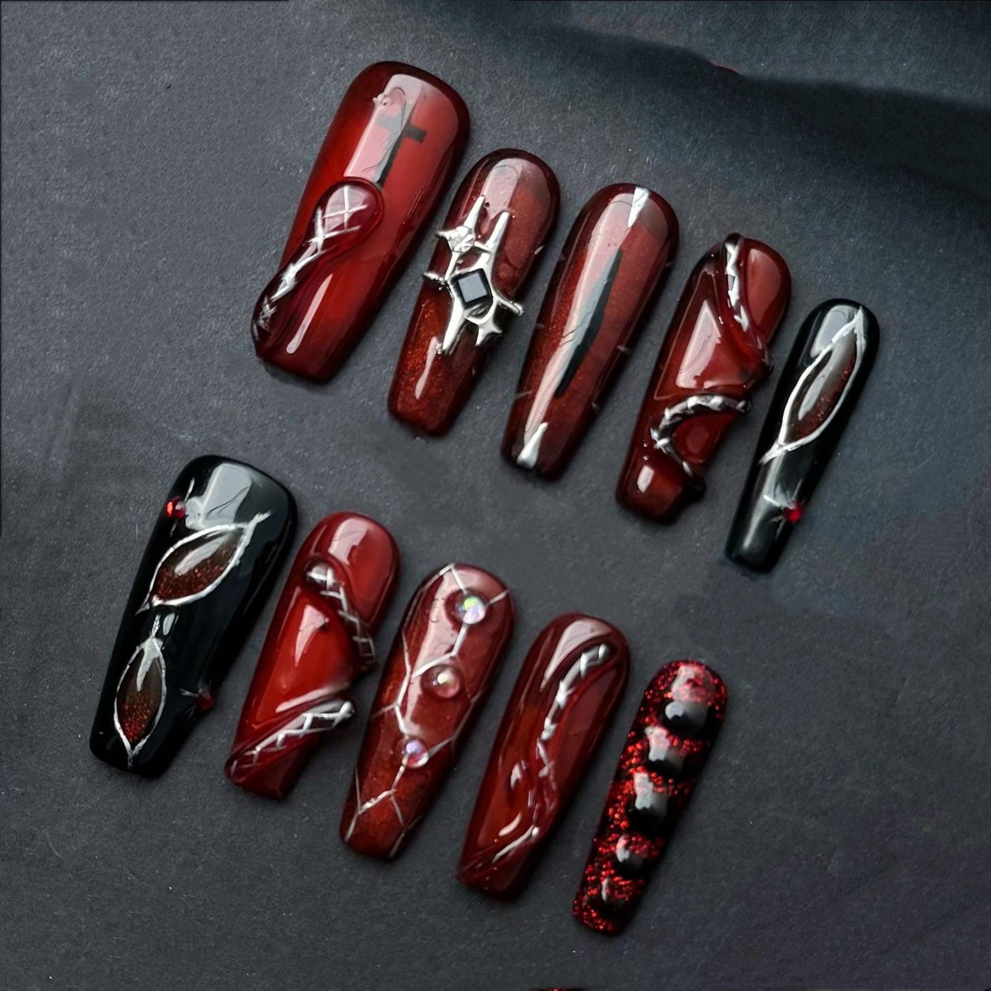 Dare to go dark with this mesmerizing set of deep red and black press-on nails. Each nail is bathed in a rich, wine-red hue with a high-gloss finish, contrasted by sleek black accents and fine silver detailing. The set features a captivating mix of textures—3D sculpted swirls, glimmering rhinestones, glitter overlays, and chrome embellishments for a mysterious, edgy look. Perfect for lovers of gothic, vampy, or alternative aesthetics, these nails bring a bold statement to any outfit. Reusable and handcrafted for maximum impact and durability.