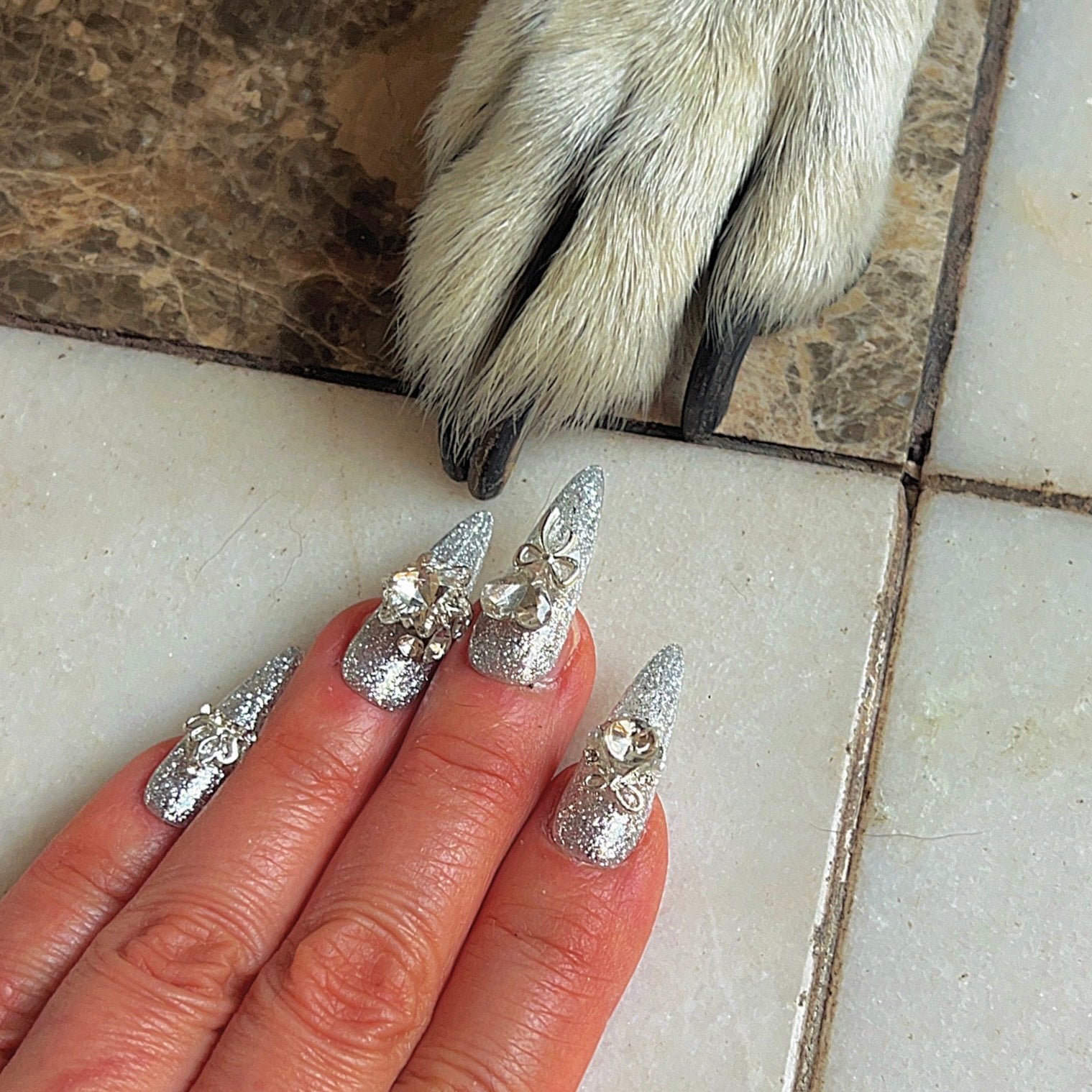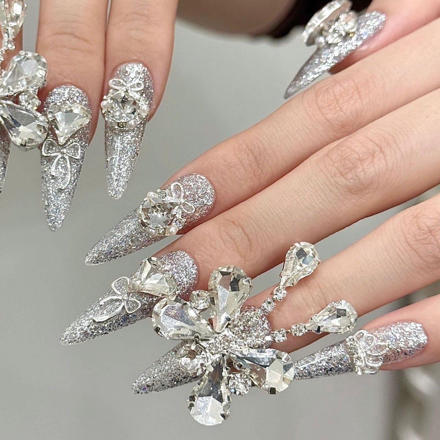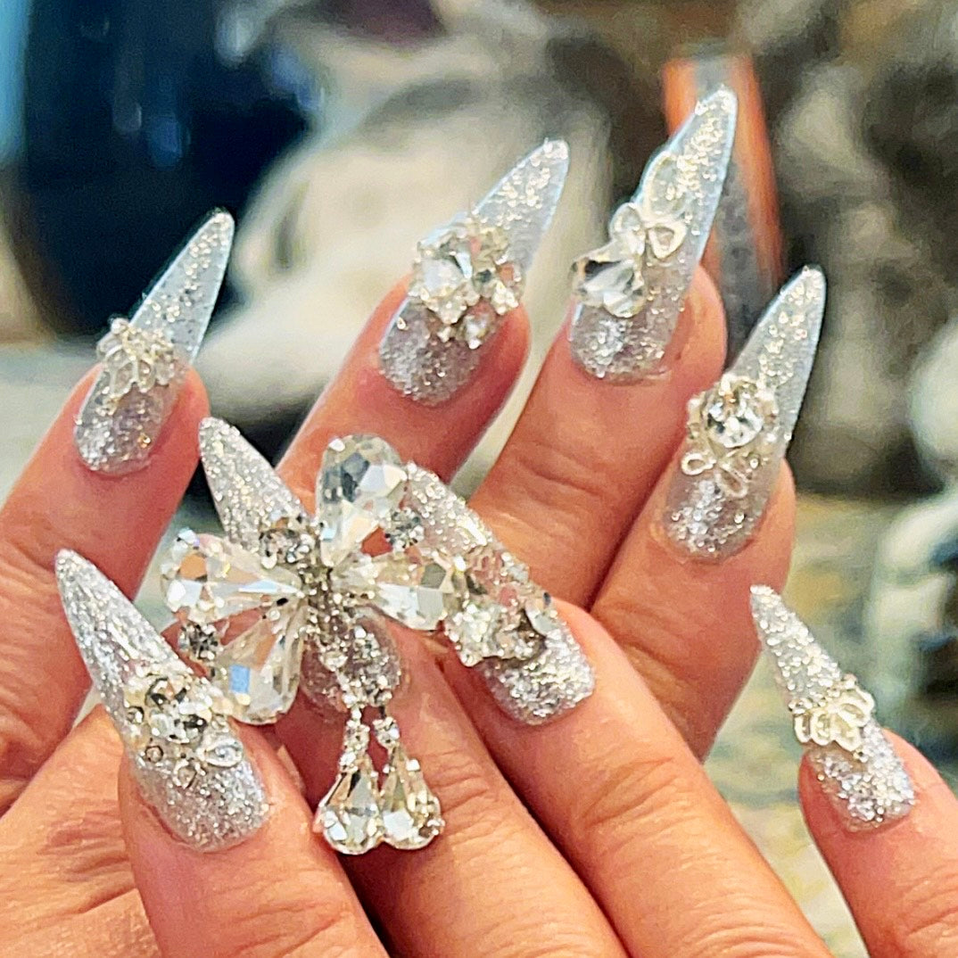Diamond Sparkle Press-On Nails | 3D Crystal Butterfly & Bow Nail Set | Full Glitter Glam | Reusable Luxury Nails