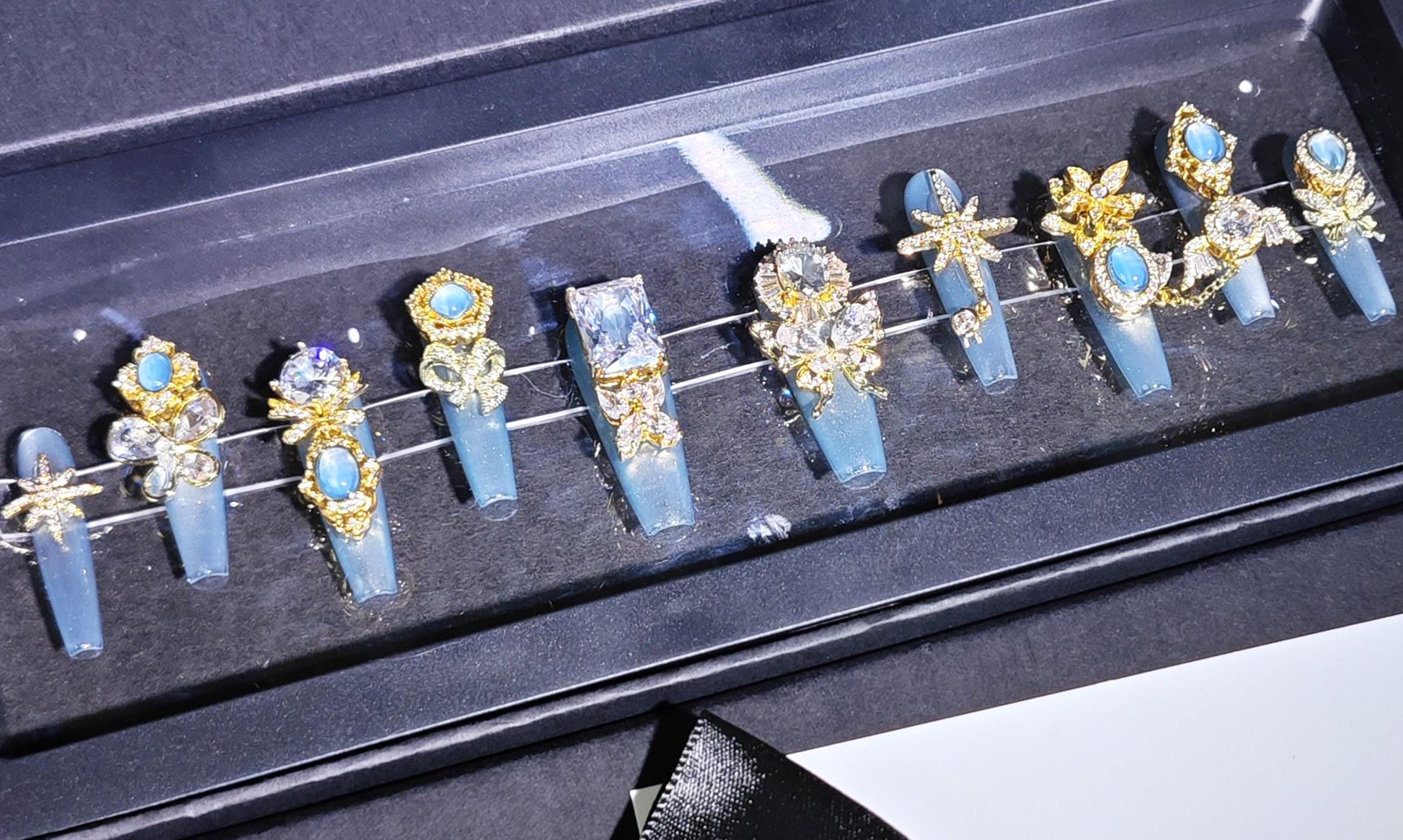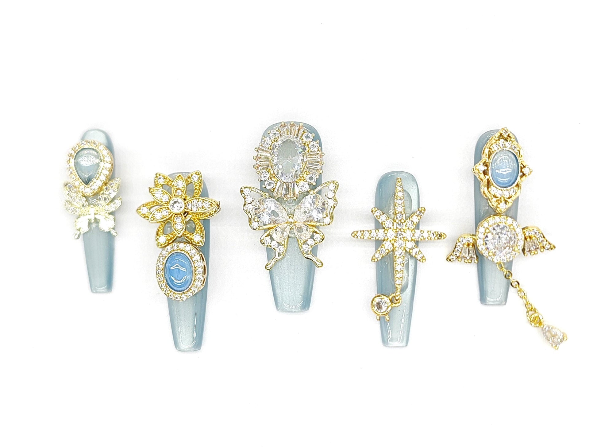 Dreamy Luxury Blue Cameo Press-On Nails – Elegant 3D Rhinestone Nails with Gold Charms, Butterfly & Star Design, Handmade Glam Nail Art Set
