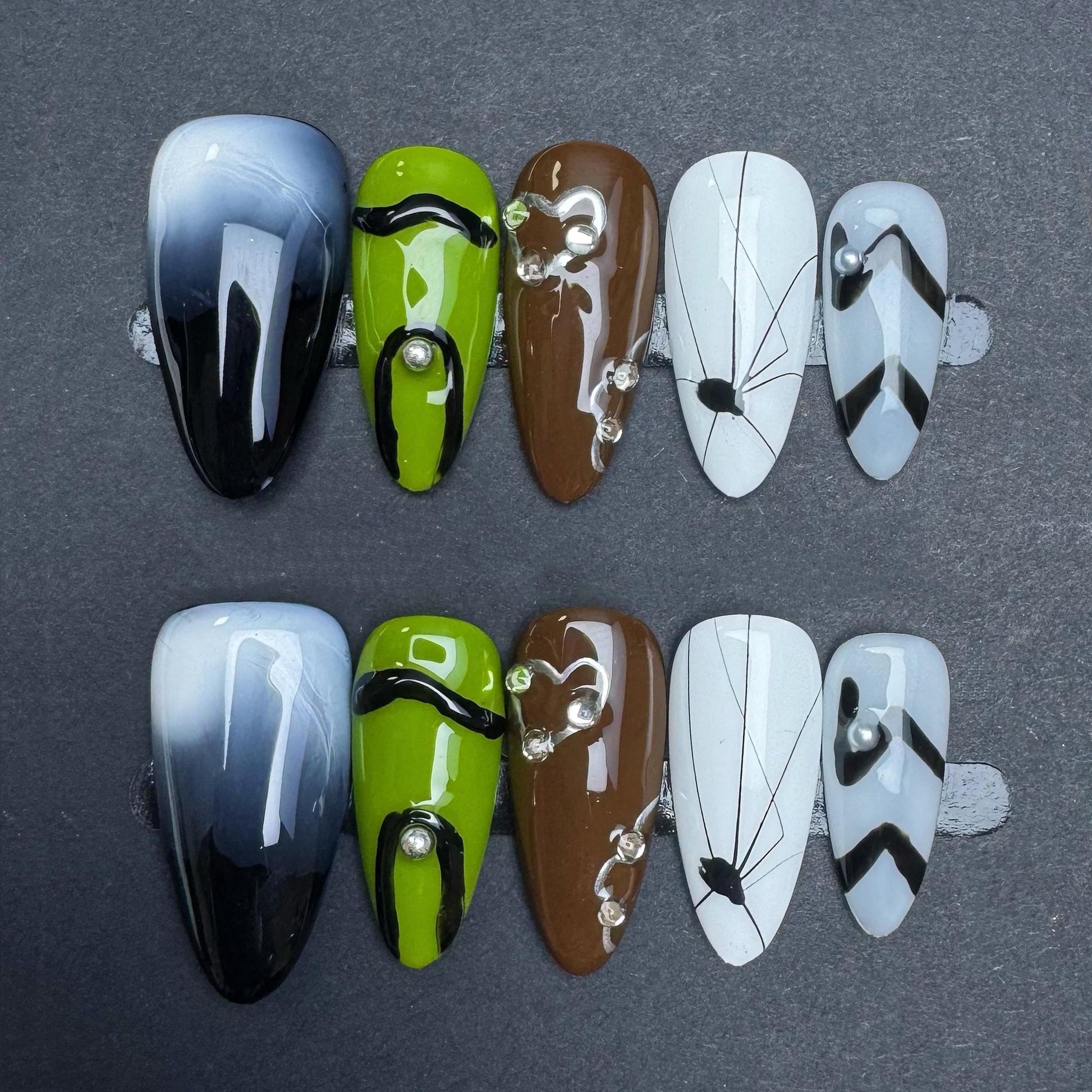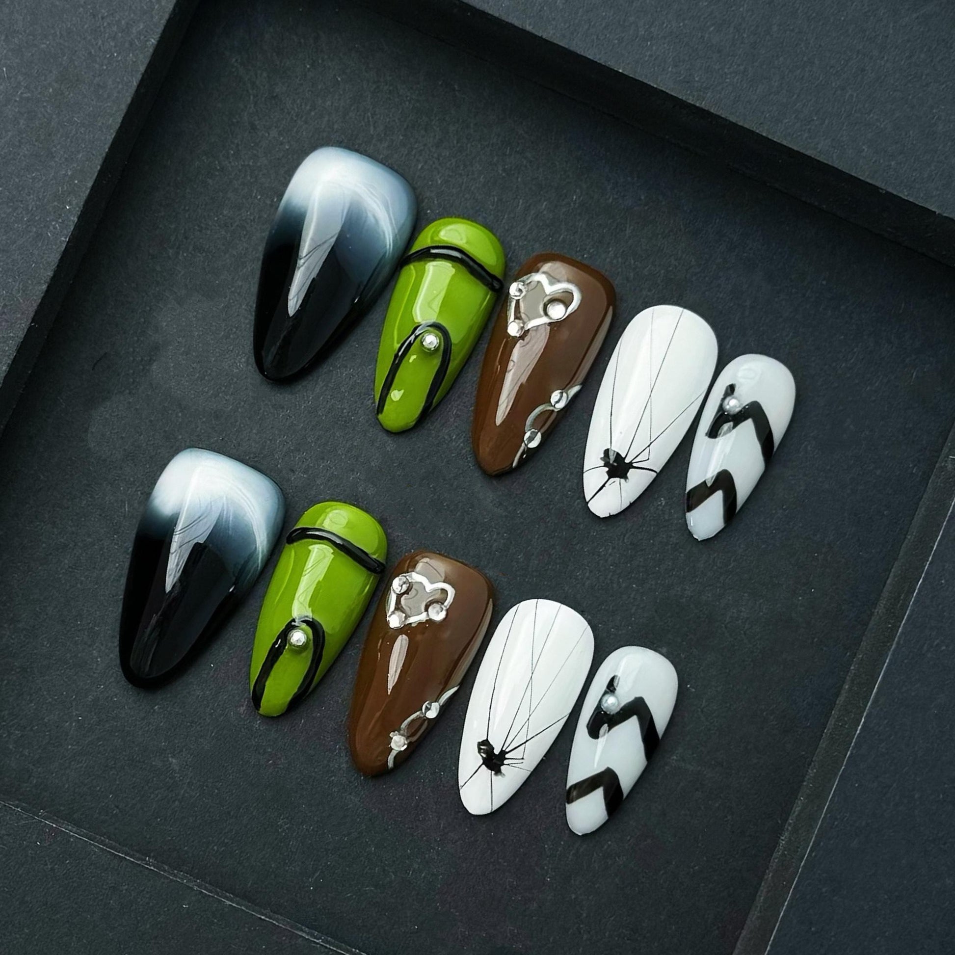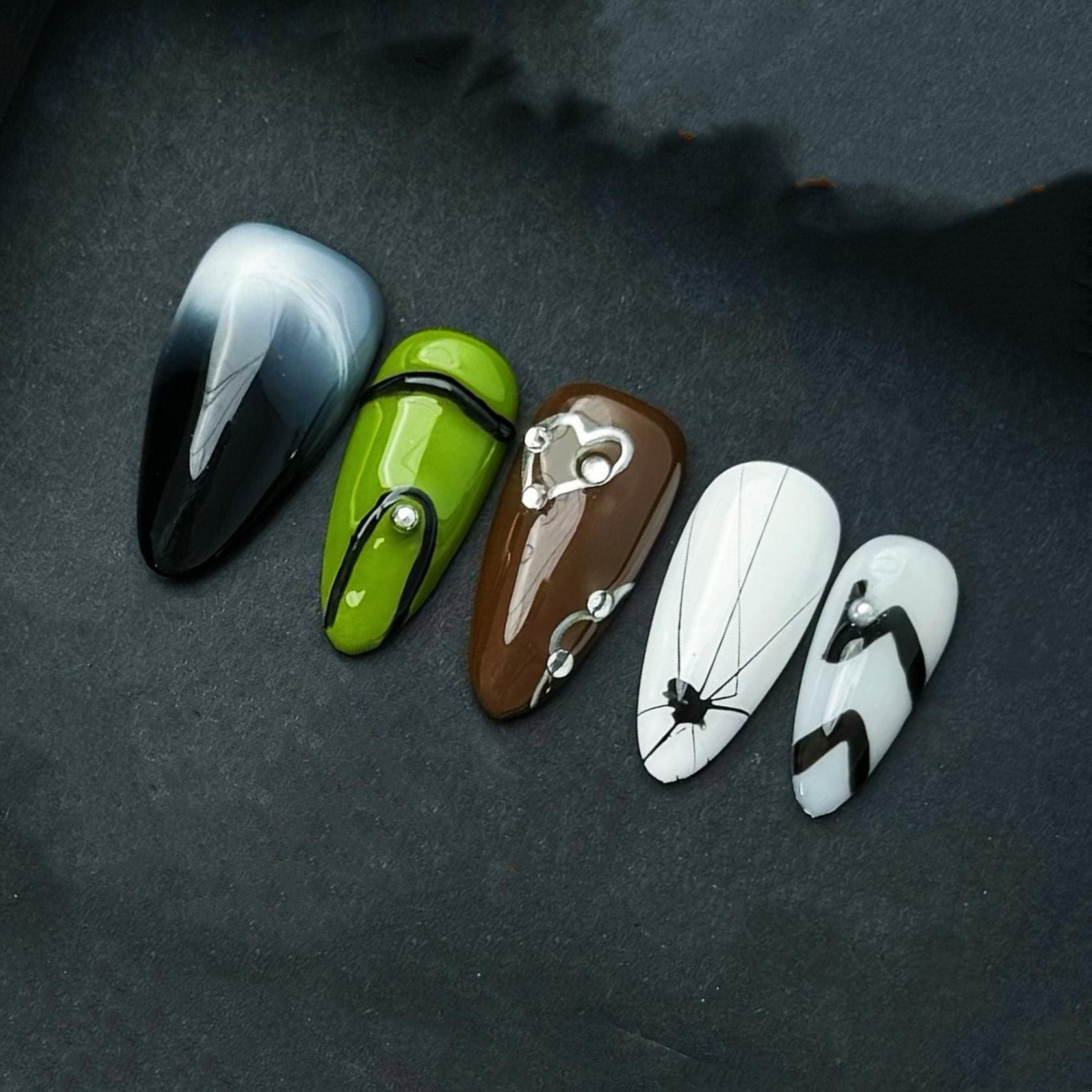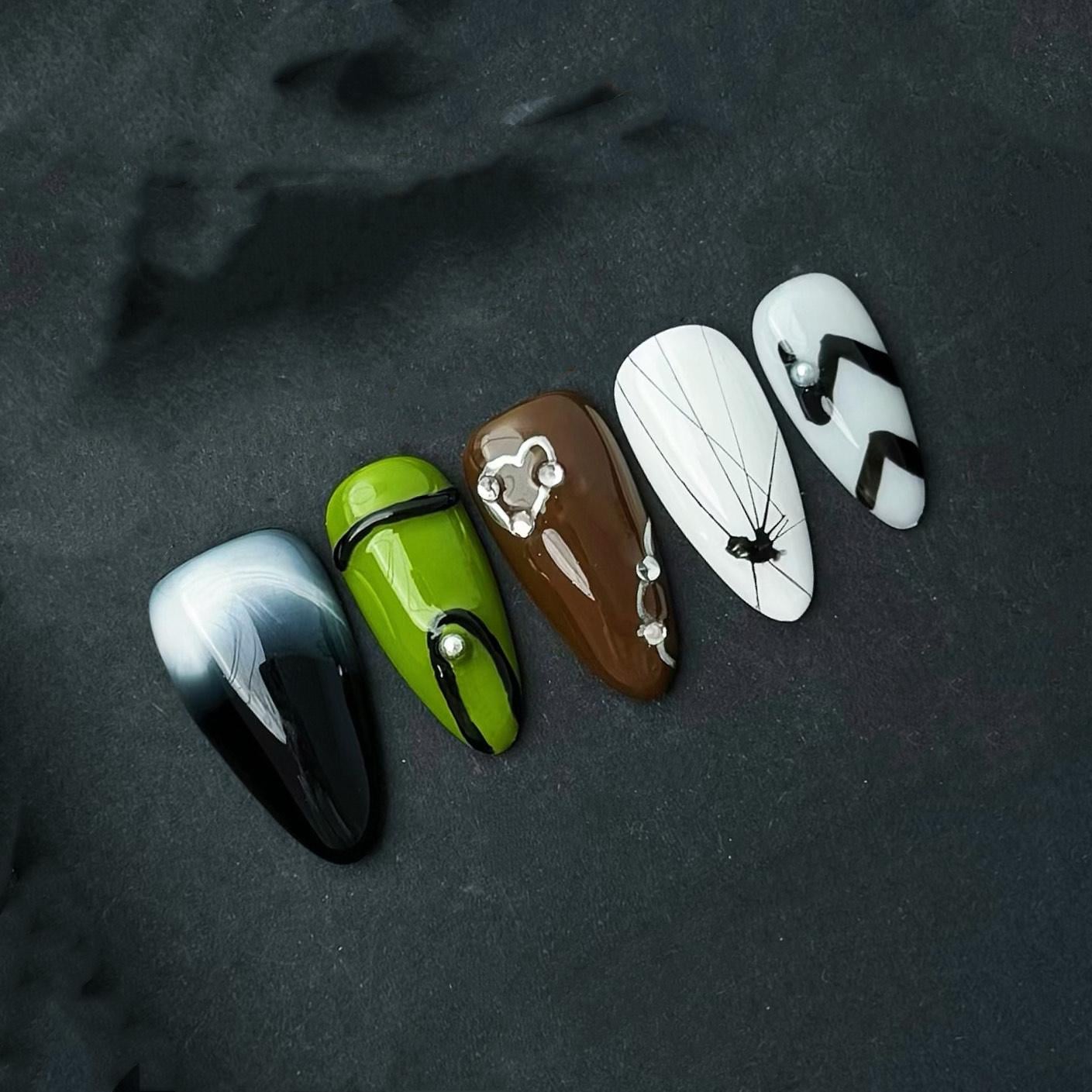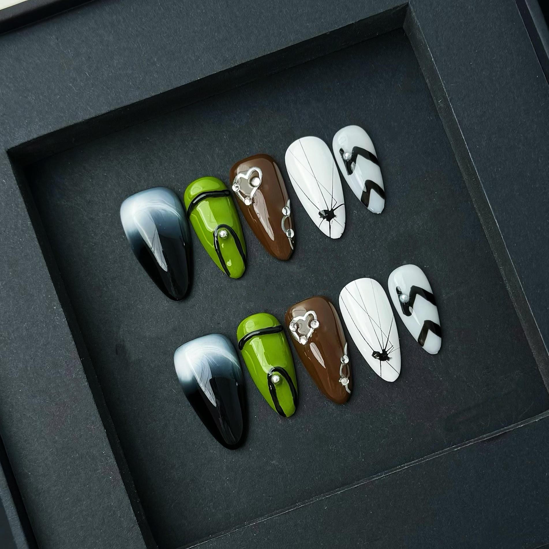 This striking set of press on nails features a bold and artistic mix of styles and colors. The set includes sleek black-to-white ombre nails, high-gloss lime green nails with black contour accents, chocolate brown nails adorned with metallic hearts and rhinestones, and dramatic white nails with black spider web and chevron detailing. Each nail is handcrafted to bring unique visual interest, blending edgy elements with high-contrast tones for a modern statement. Perfect for those who love unconventional designs, seasonal themes, or bold everyday looks.