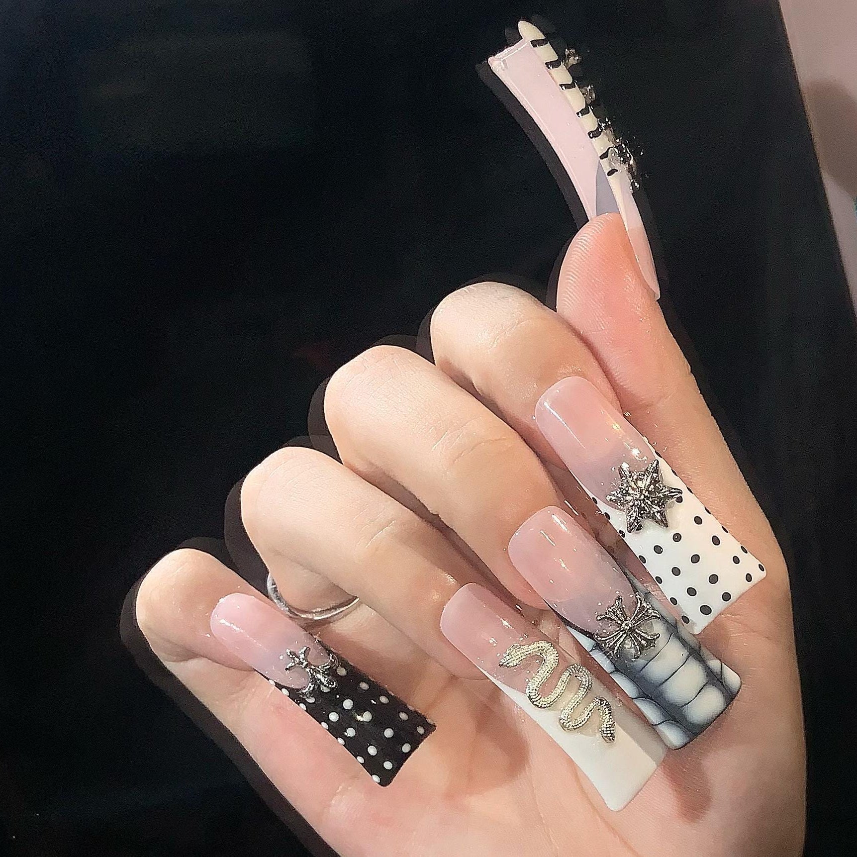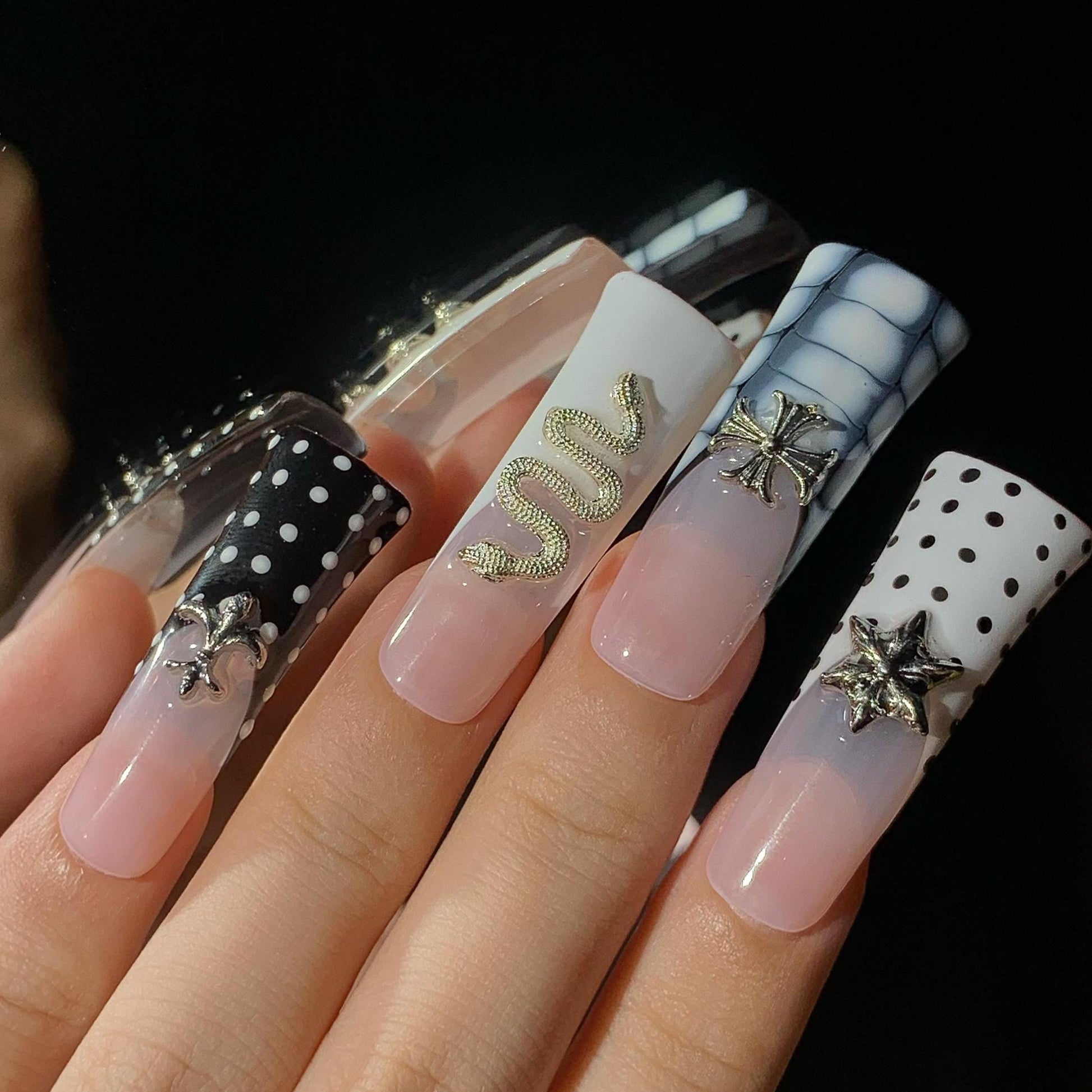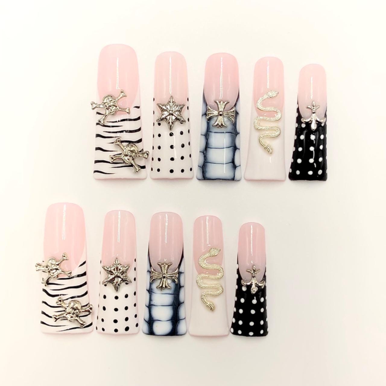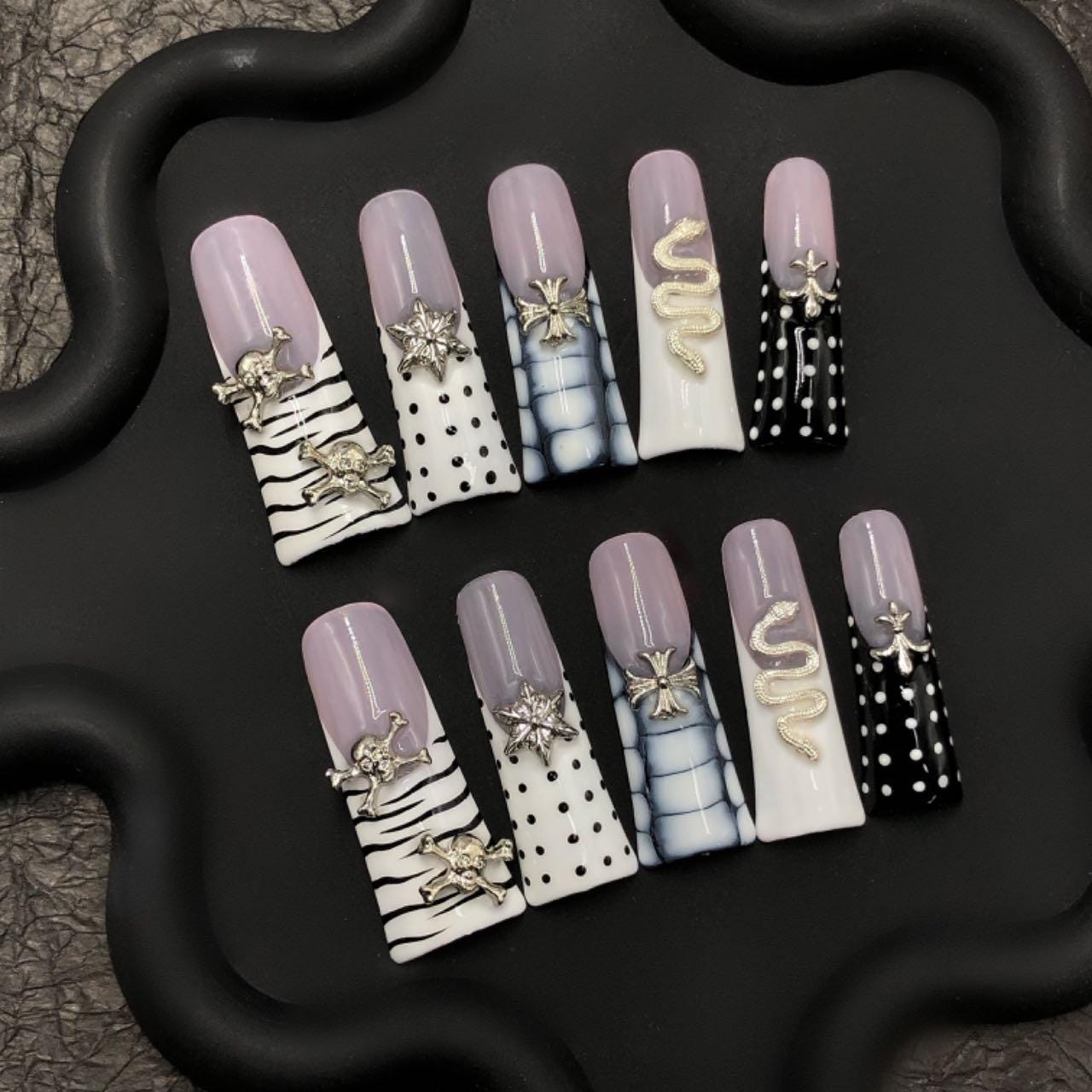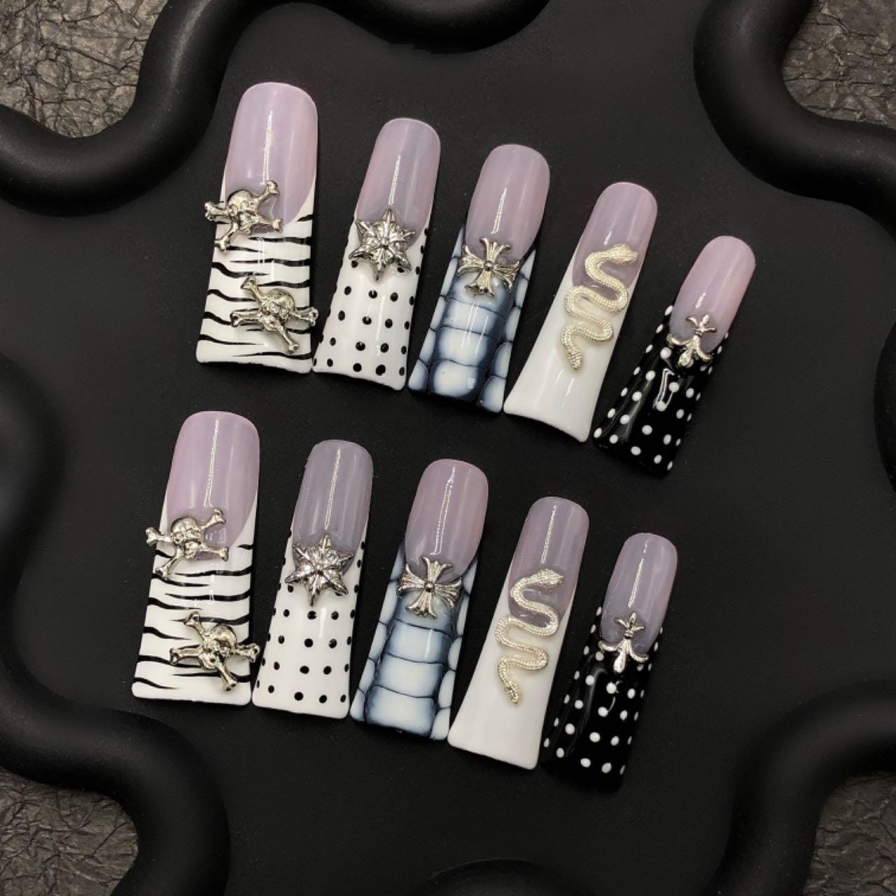 Edgy nail art, gothic skull charms snake crocodile print polka dot striped press-on long coffin 3D embellishments glam punk manicure glue on