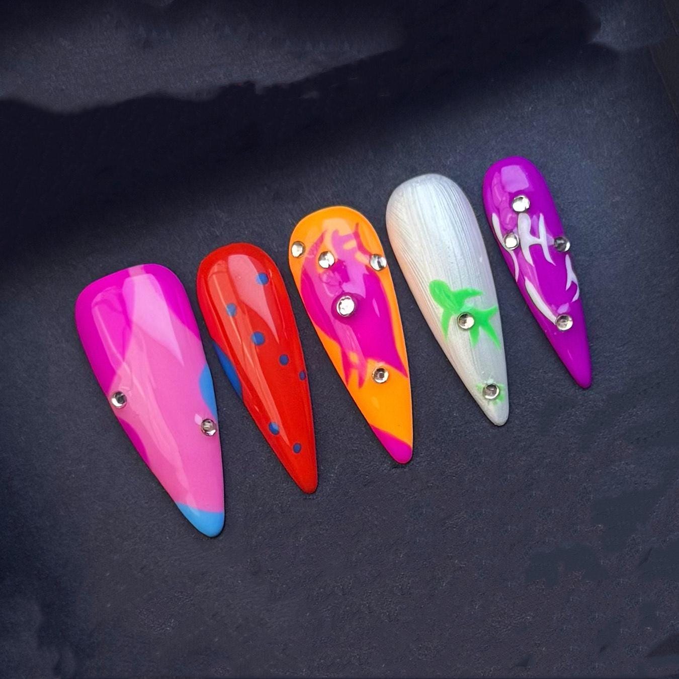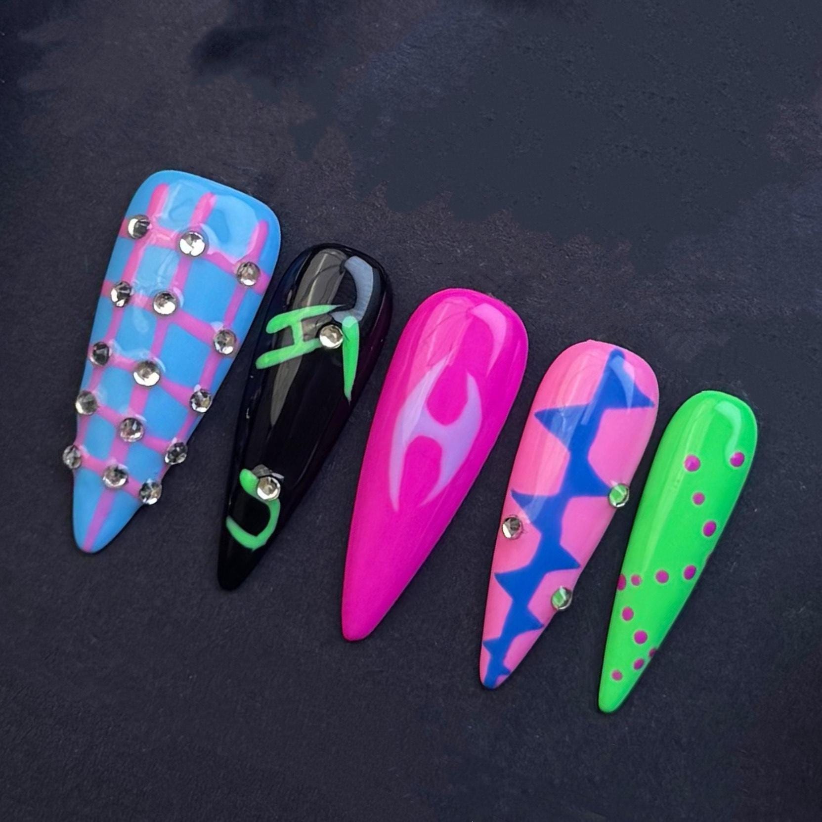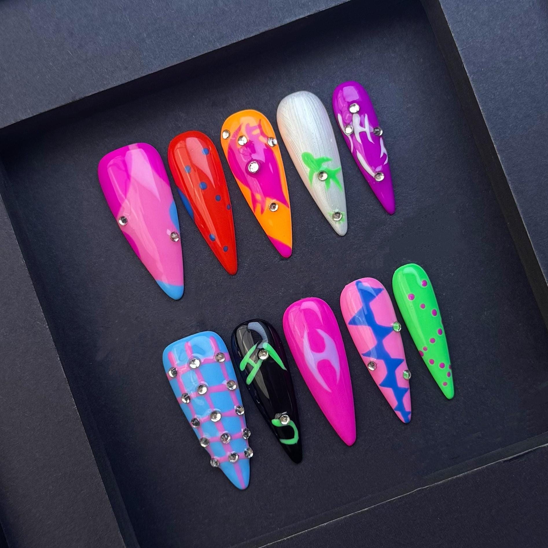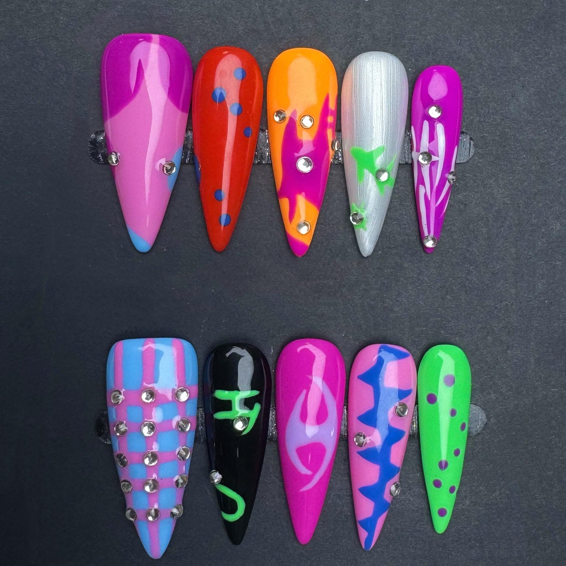 Electric Neon Mix Press On Nails – Abstract Graffiti-Inspired Set with Crystals. Artificial reusable fake glue on faux manicure nails art.