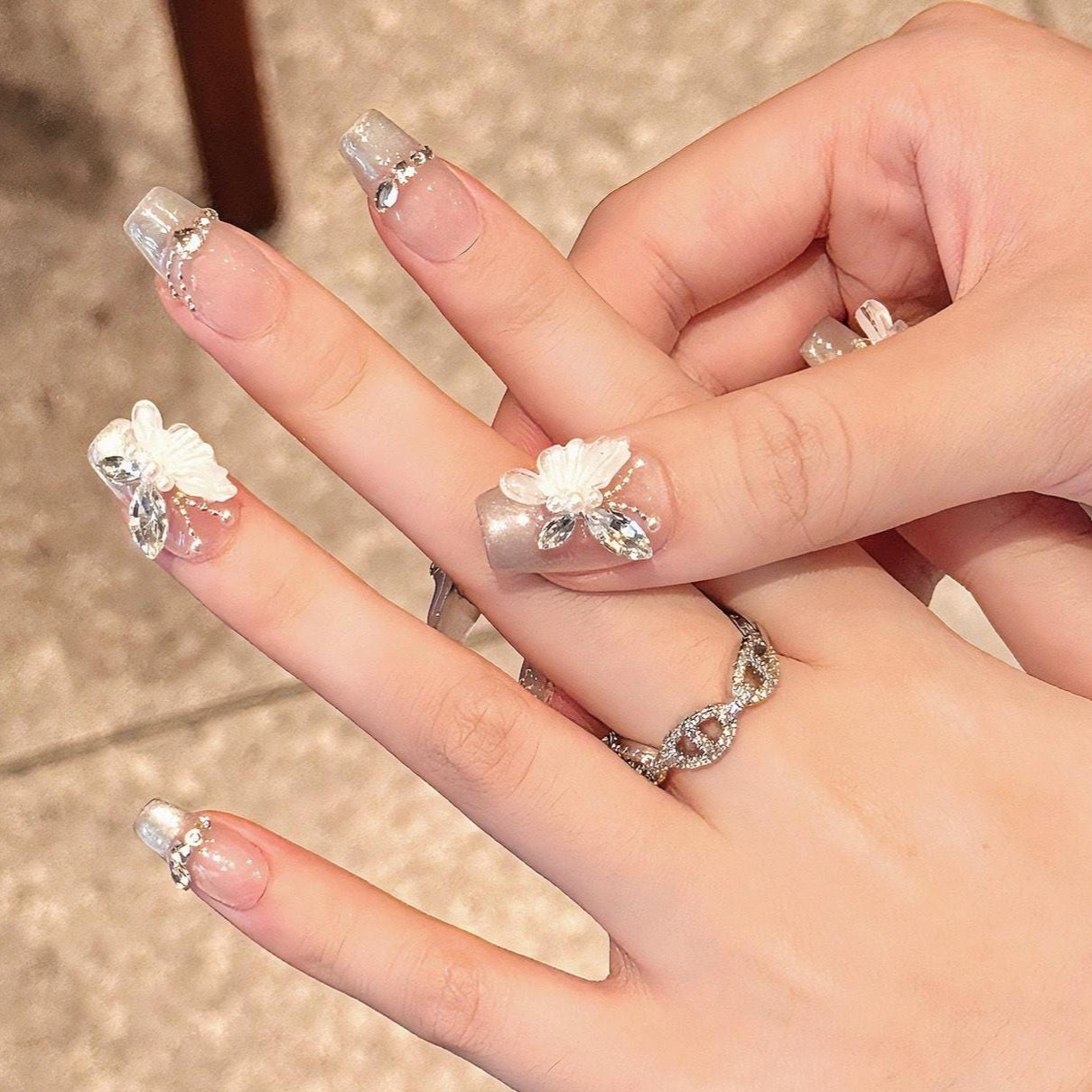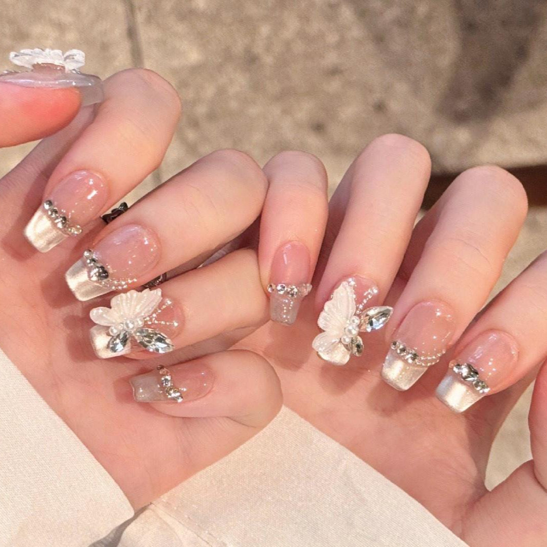Elegant 3D Butterfly Press On Nails White Pearl French Tip Nails Rhinestone Embellished Nail Set Bridal Luxury Nails Manicure glue on nails
